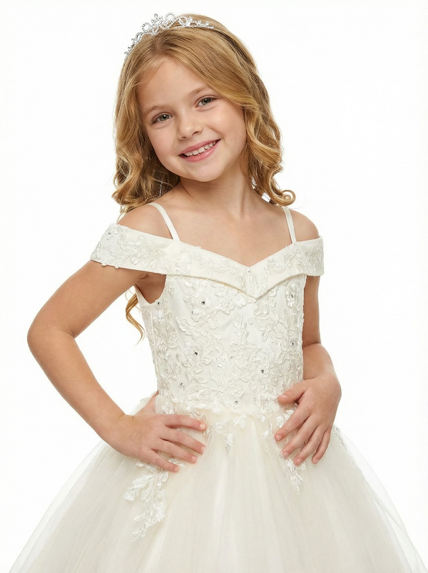 Off Shoulder Lace Flower Girl Gown Spaghetti Strap A-Line Floor Length Tulle Wedding Dress