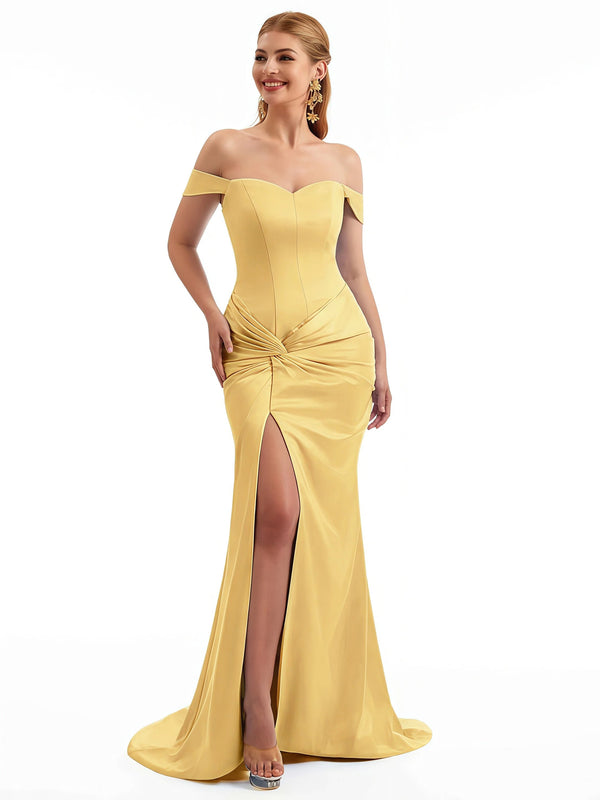 Off The Shoulder Stretch Satin Dresses For Bridesmaids Online Sexy Side Split