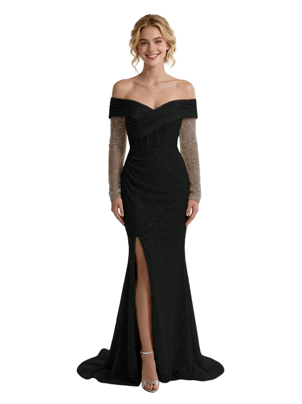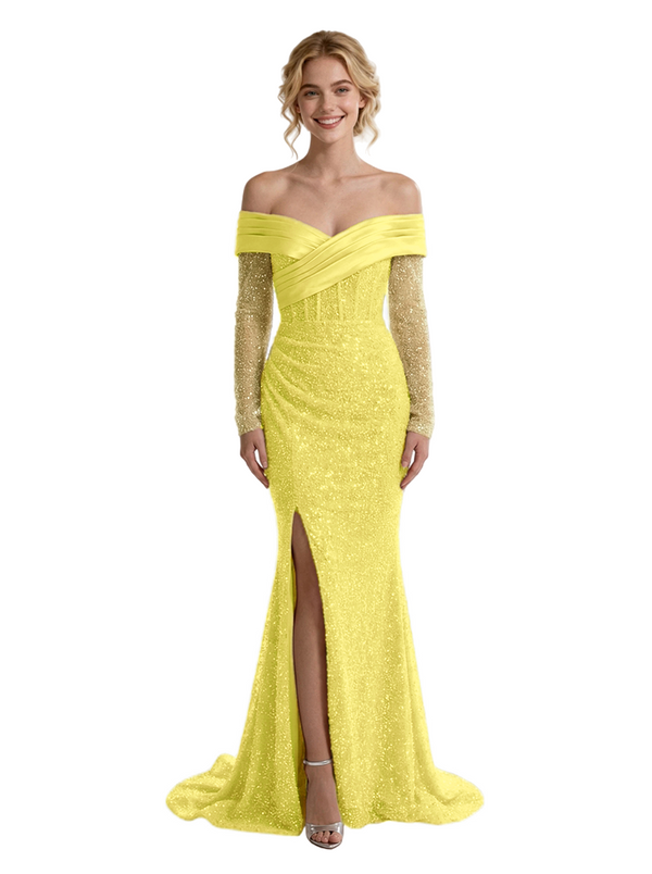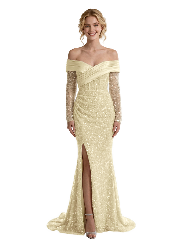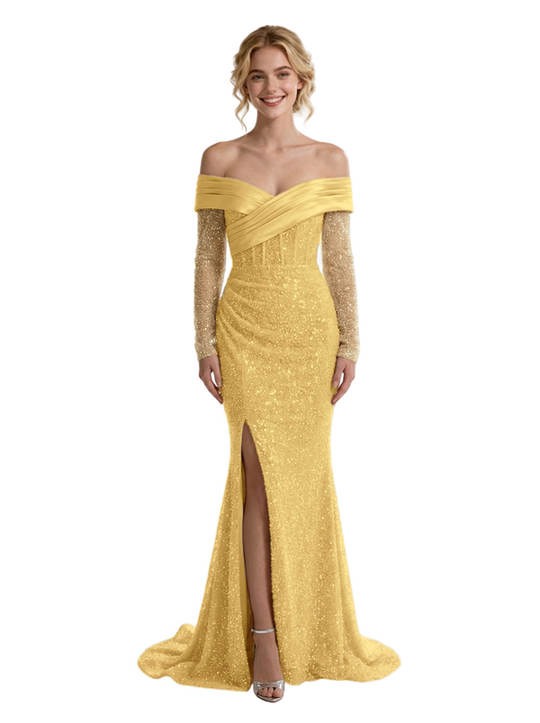 Pretty Off The Shoulder Long Sleeves Sequin Side Slit Floor-Length Mermaid Evening Gown - ChicSew – ChicSew
