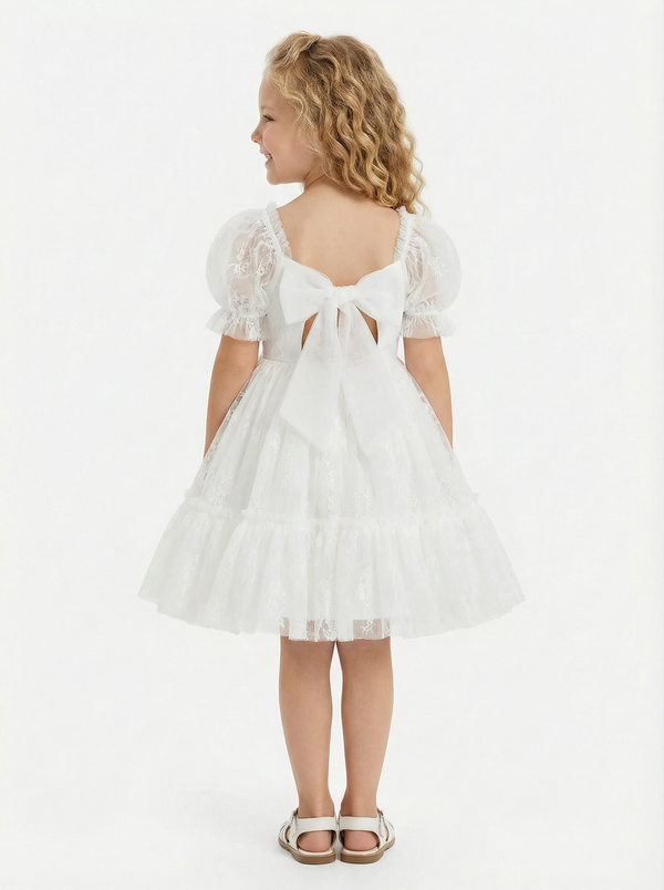 Puff Short Sleeves Tulle Bow Flower Girl Dress Birthday Party Dresses- ChicSew – ChicSew