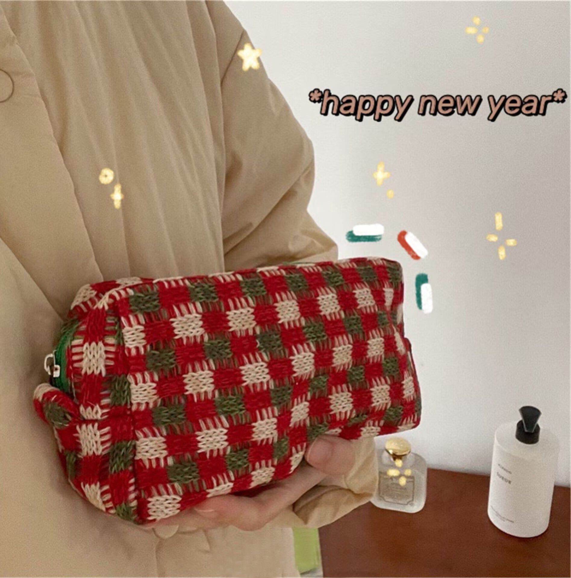 Retro Christmas Thick Knitted Plaid Portable Large-capacity Cosmetic Bag Storage Bag -- Christmas Special Gift