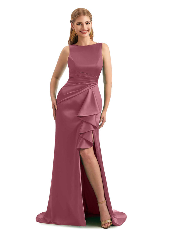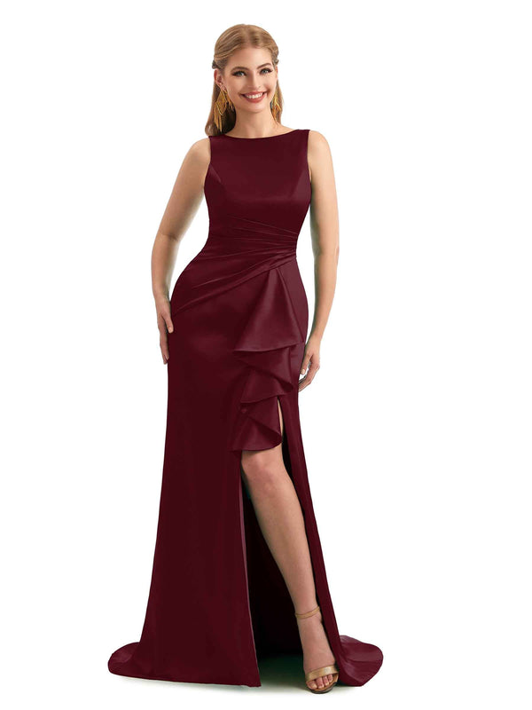Scoop Ruffles Fall Satin Side Slit Bridesmaid Dresses