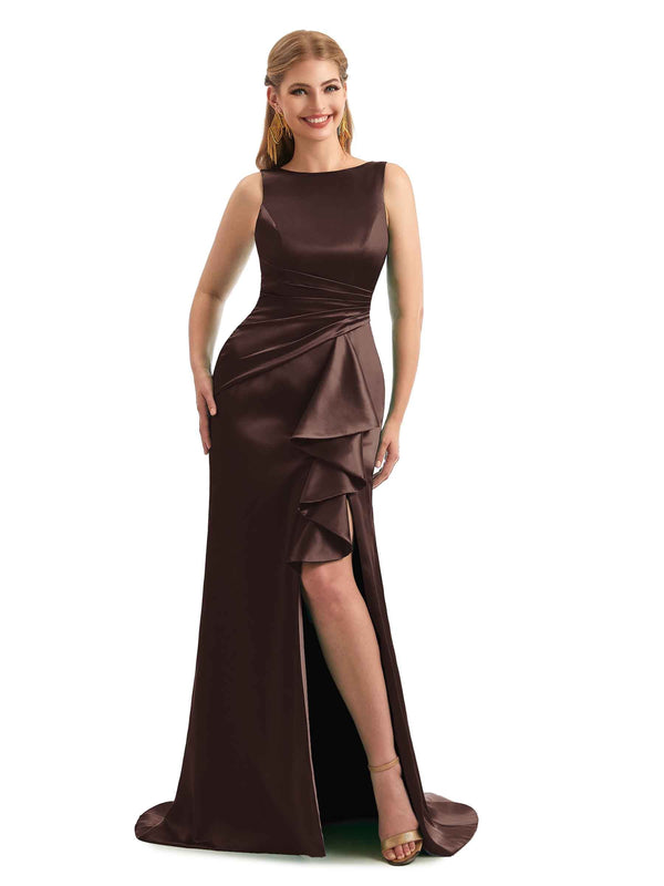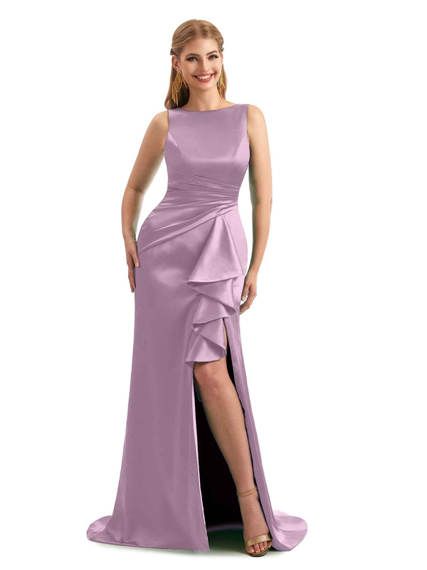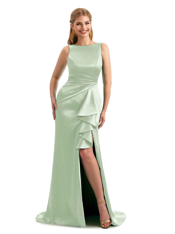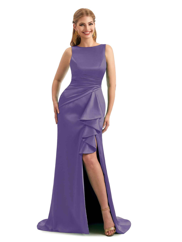 Scoop Ruffles Winter Satin Side Slit Bridesmaid Dresses