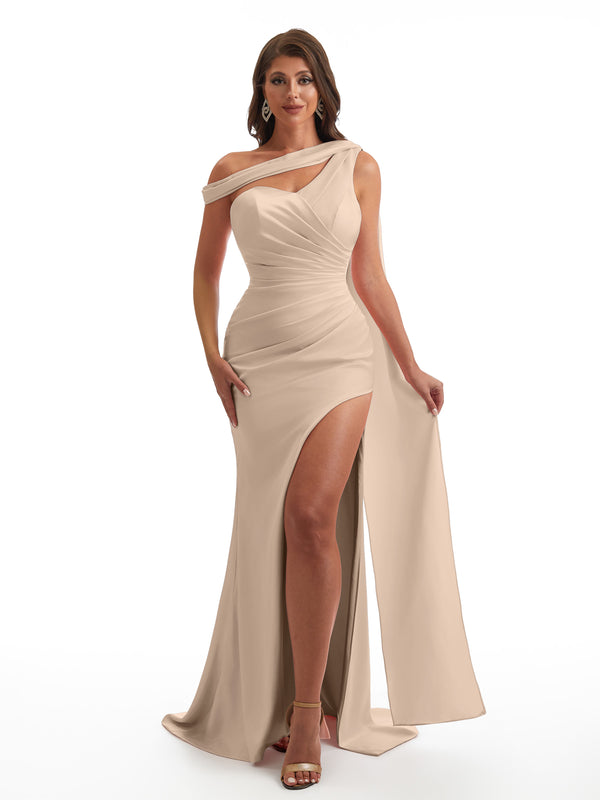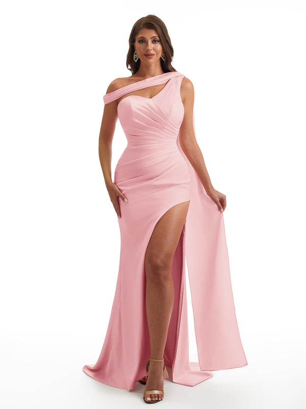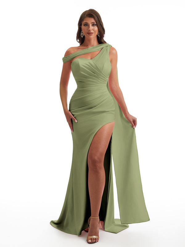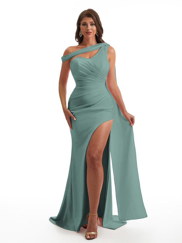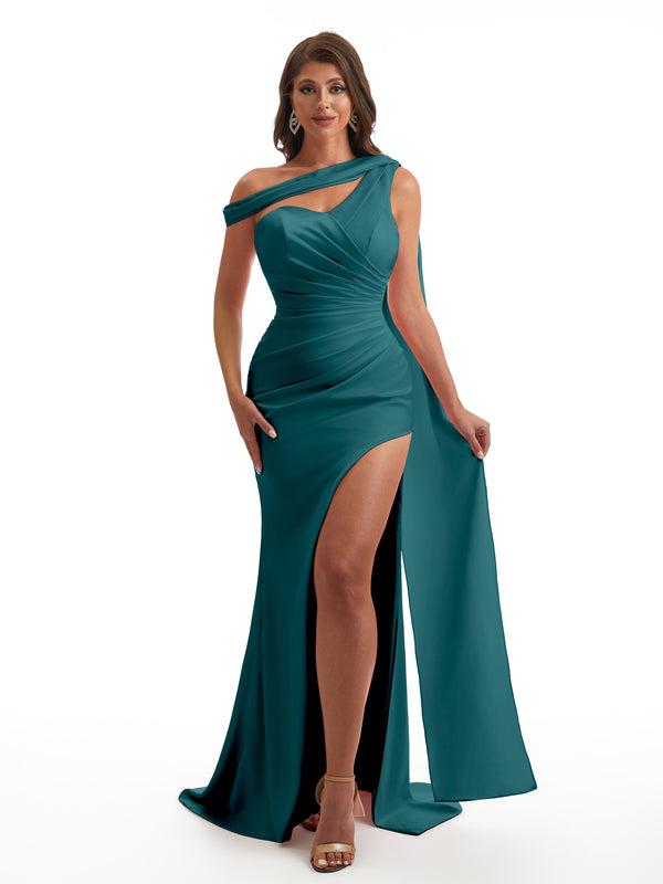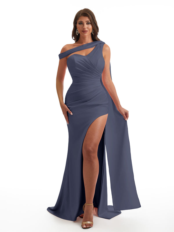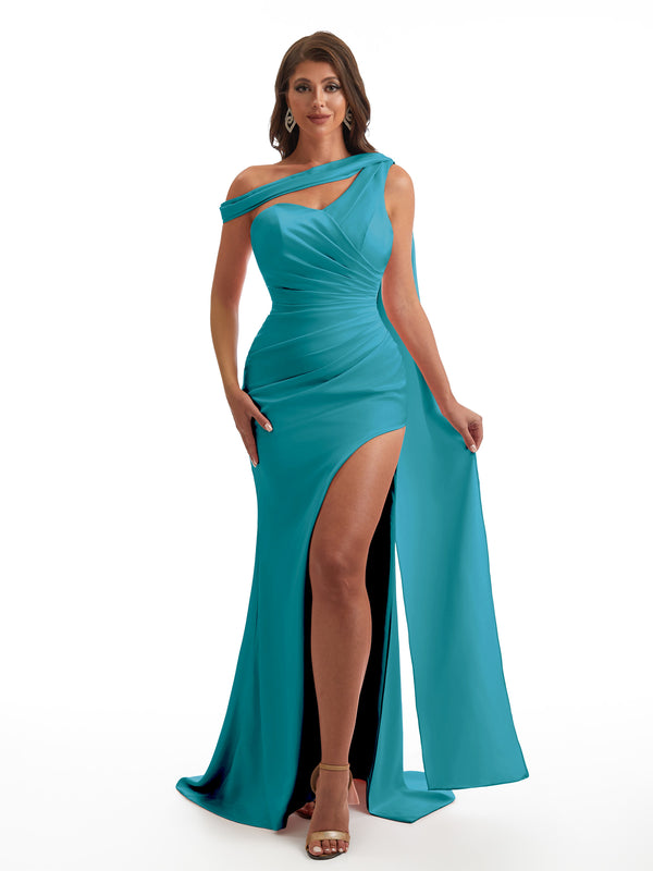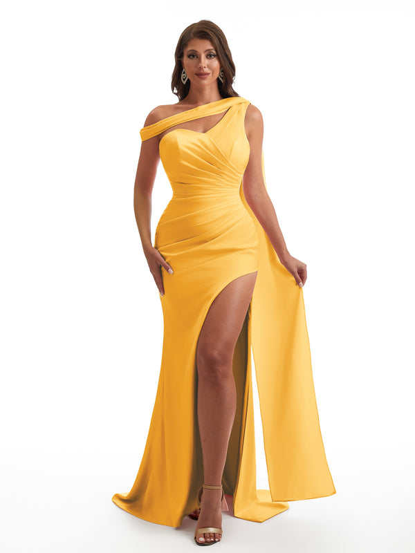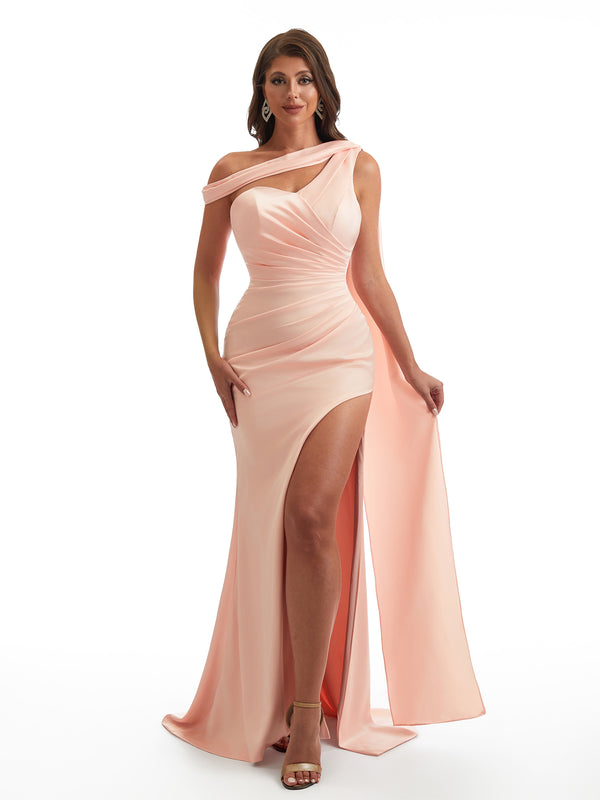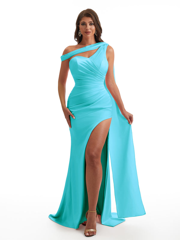 Sexy Asymmetric Neckline Mermaid Side Slit Soft Satin Unique Maxi Bridesmaid Dresses Online
