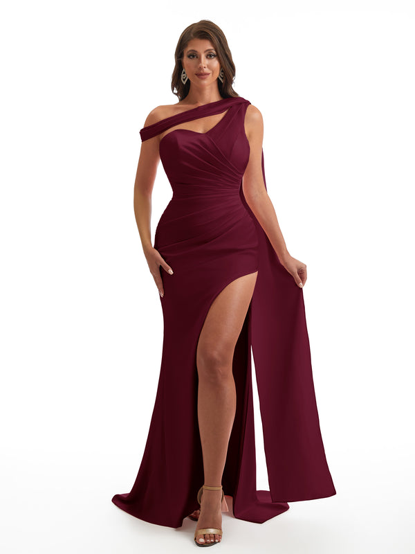 Sexy Asymmetric Neckline Mermaid Side Slit Soft Satin Unique Maxi Bridesmaid Dresses Online - ChicSew – ChicSew