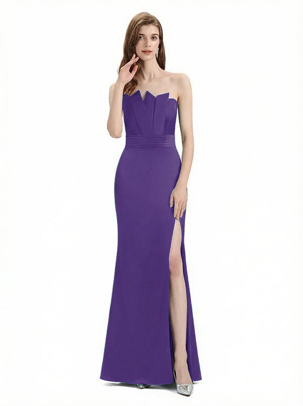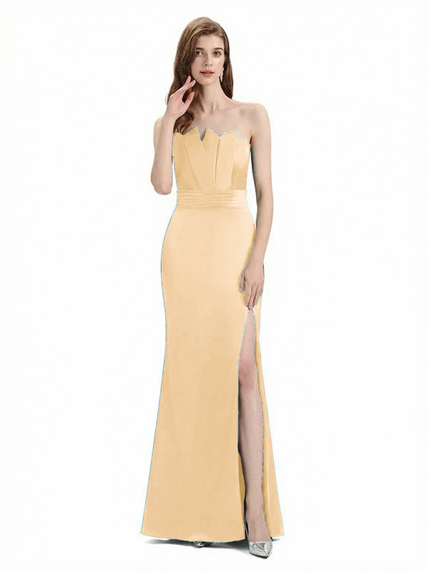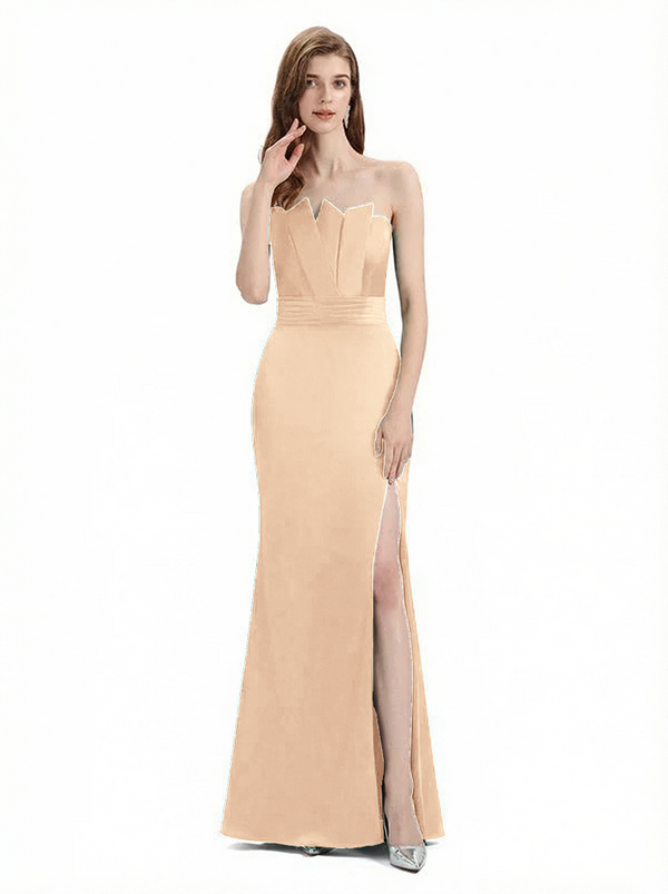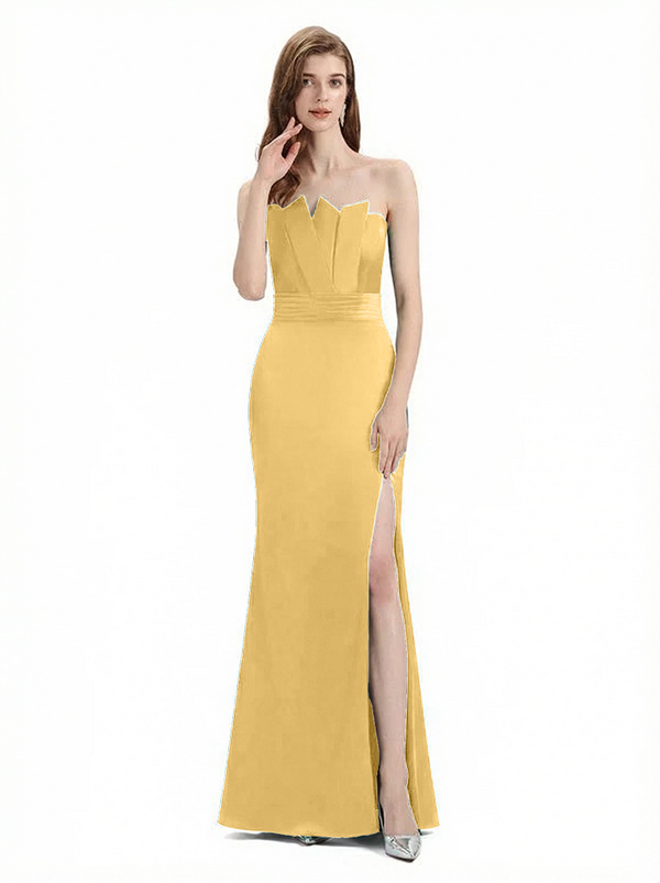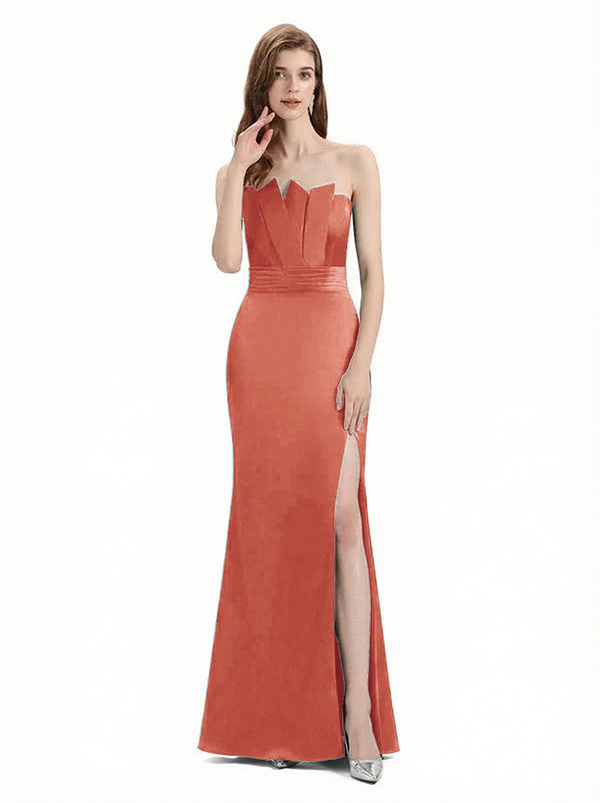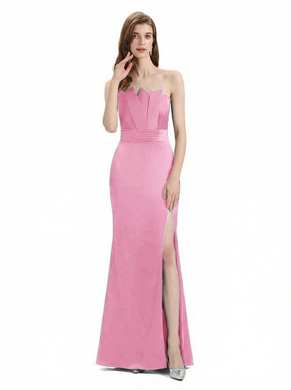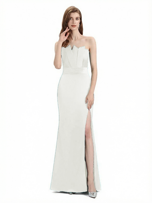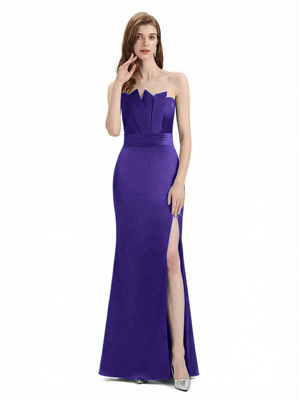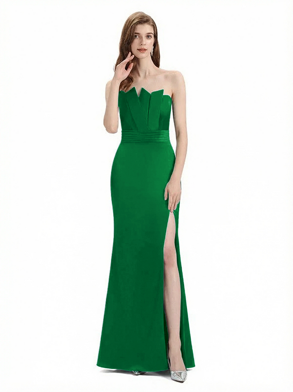 Ladies Unique Mermaid Ruched Satin Long Formal Evening Dresses Strapless Side Slit