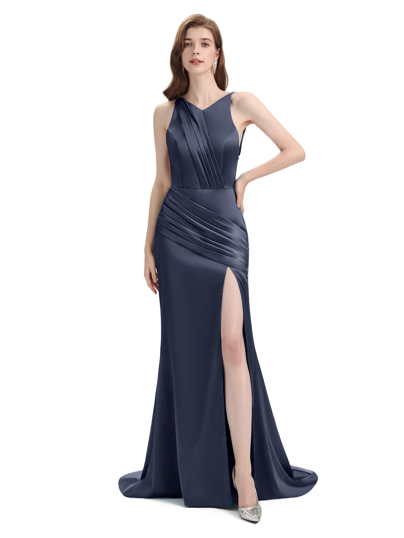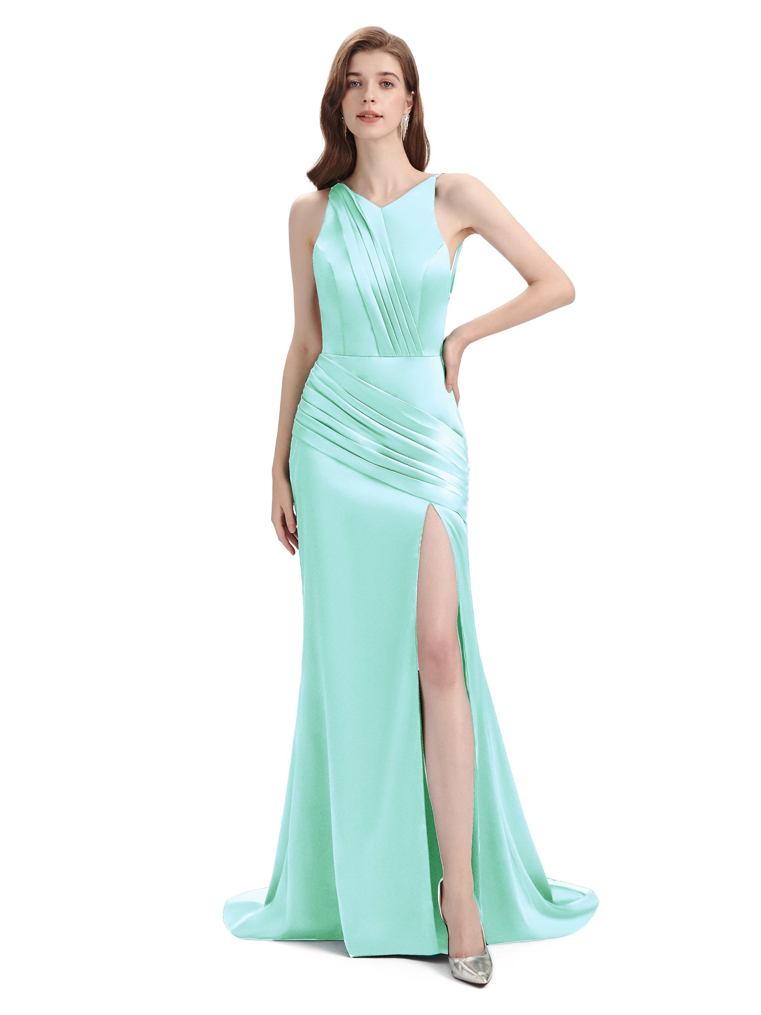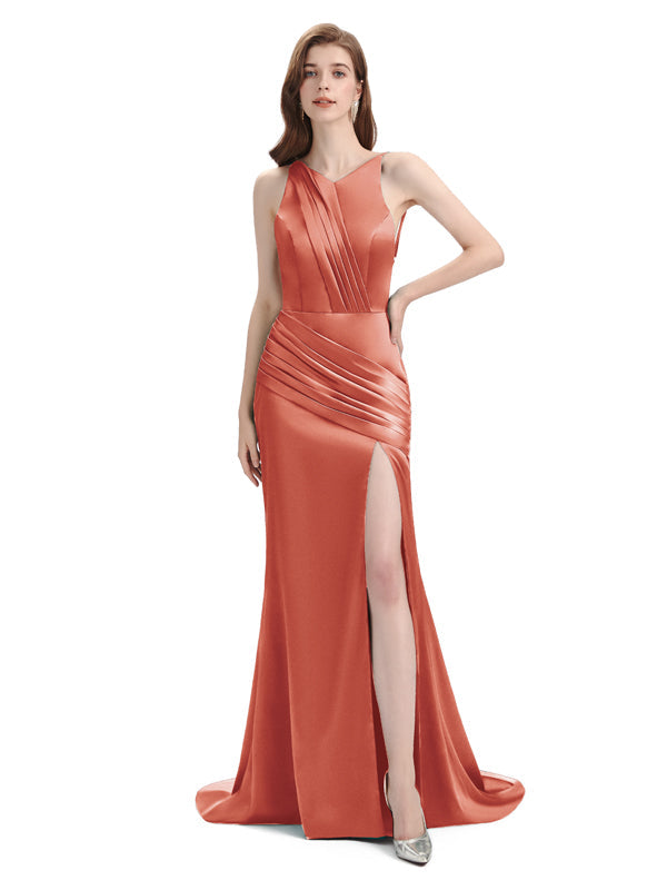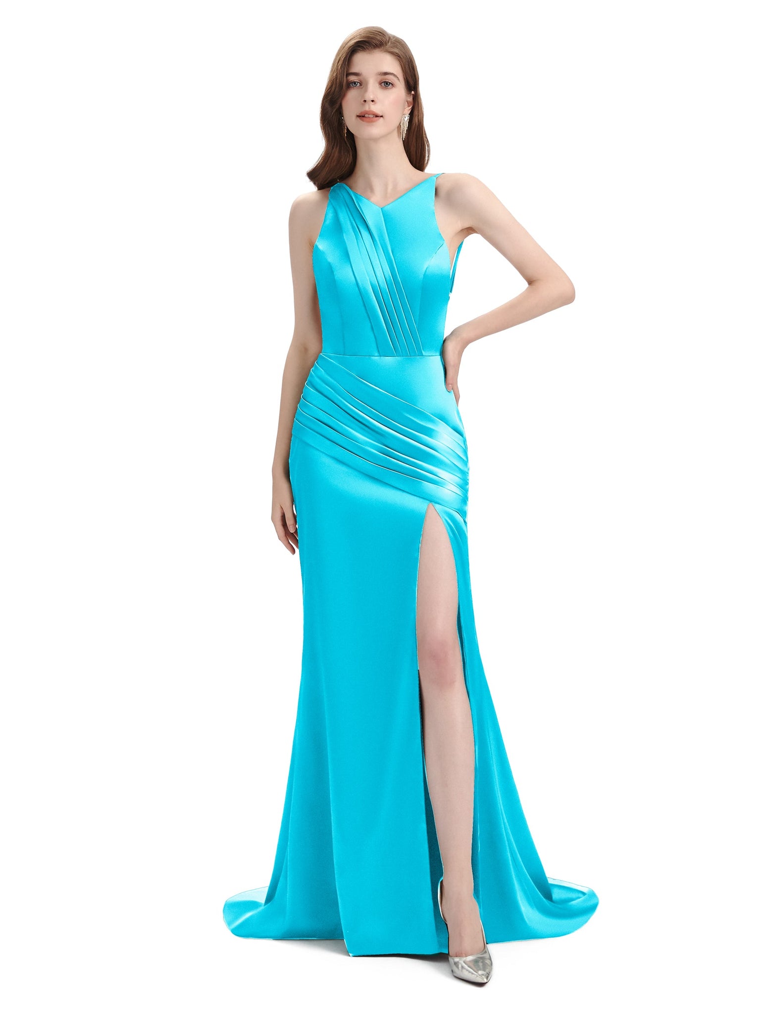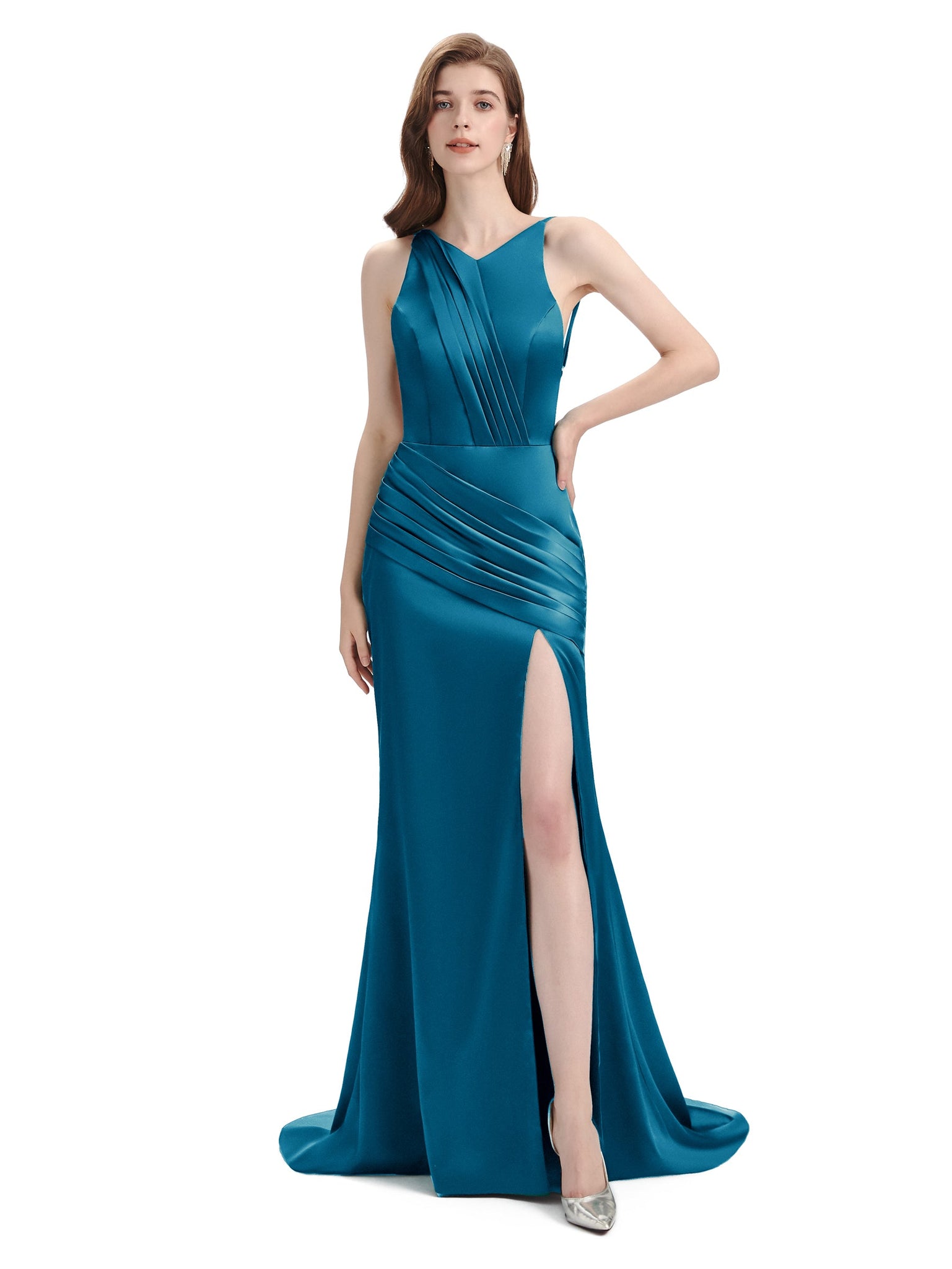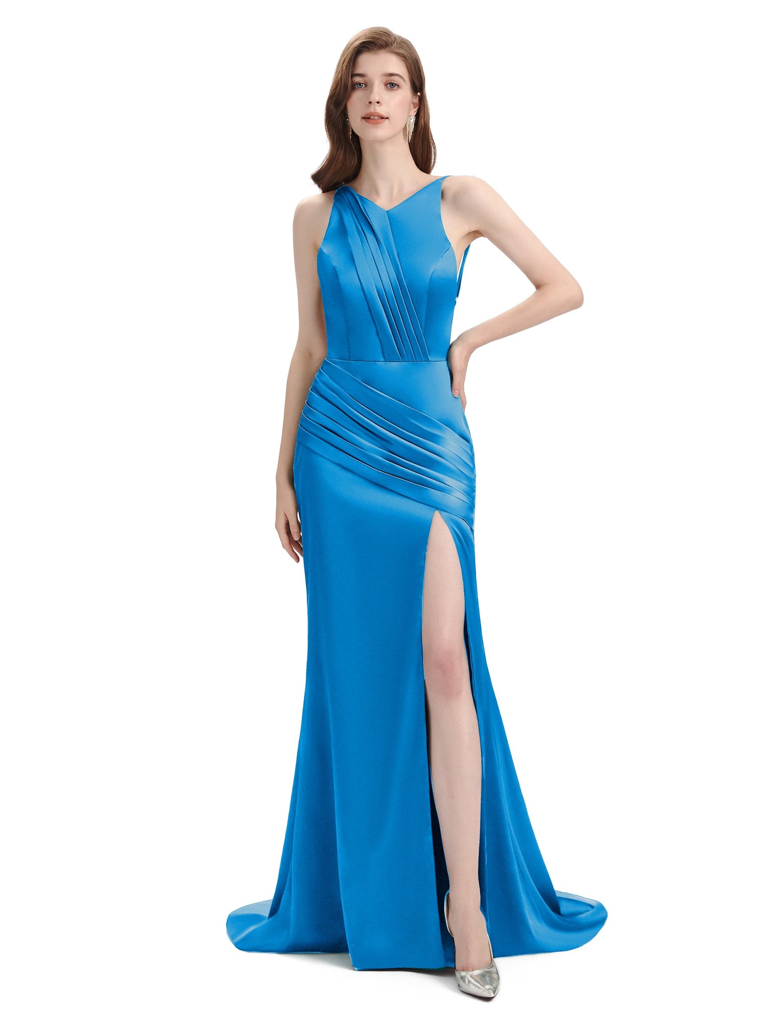 Sexy Backless Mermaid Side Slit Soft Satin Long Mermaid Formal Evening Dresses