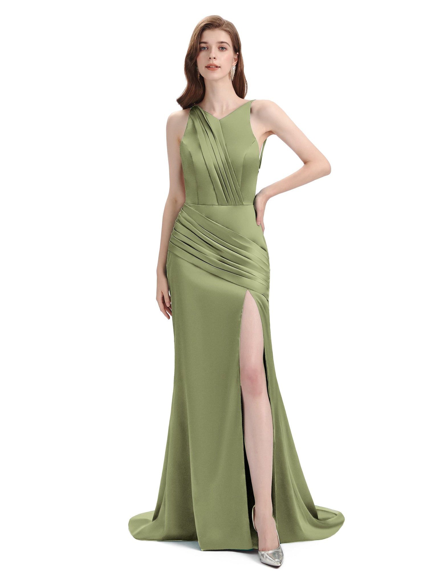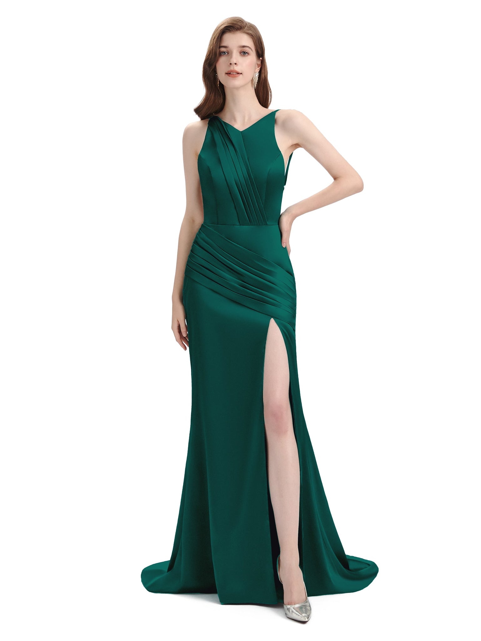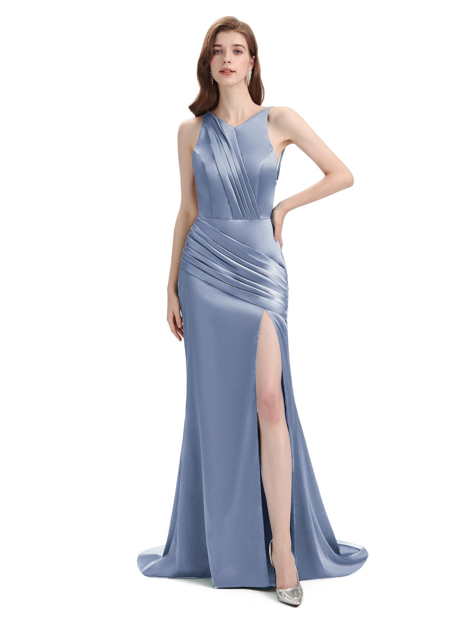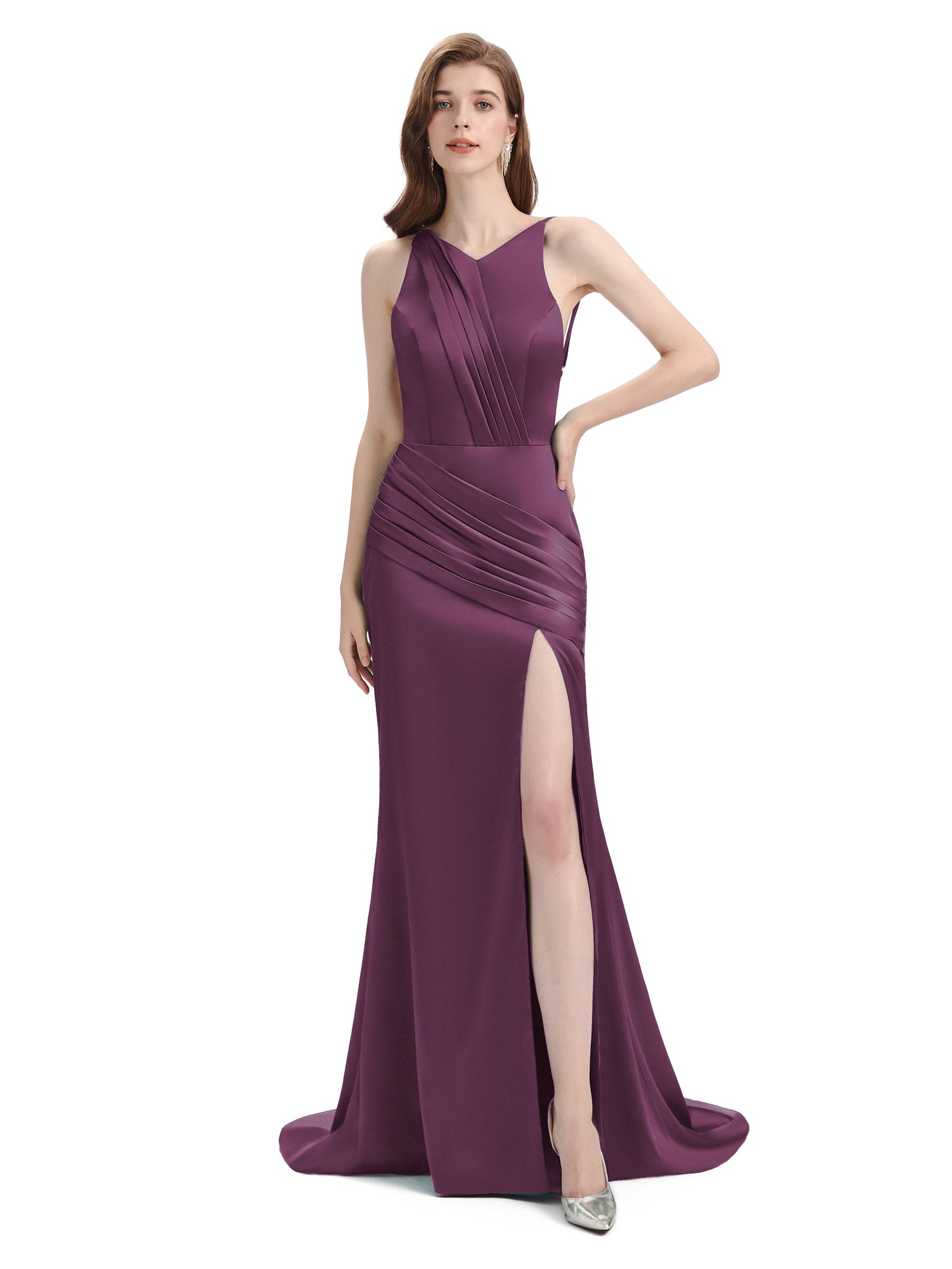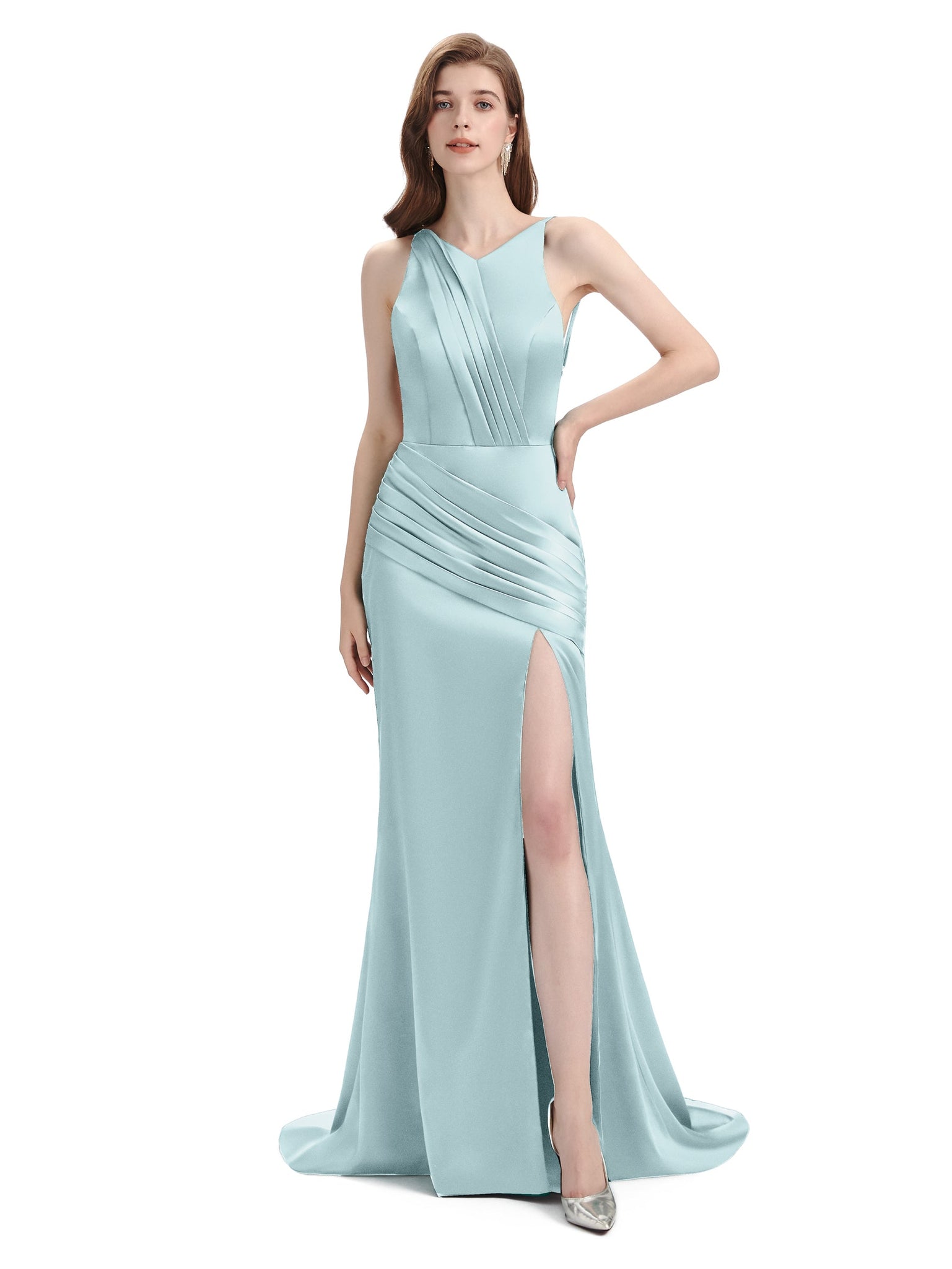 Sexy Backless Mermaid Side Slit Soft Satin Long Mermaid Formal Evening Dresses