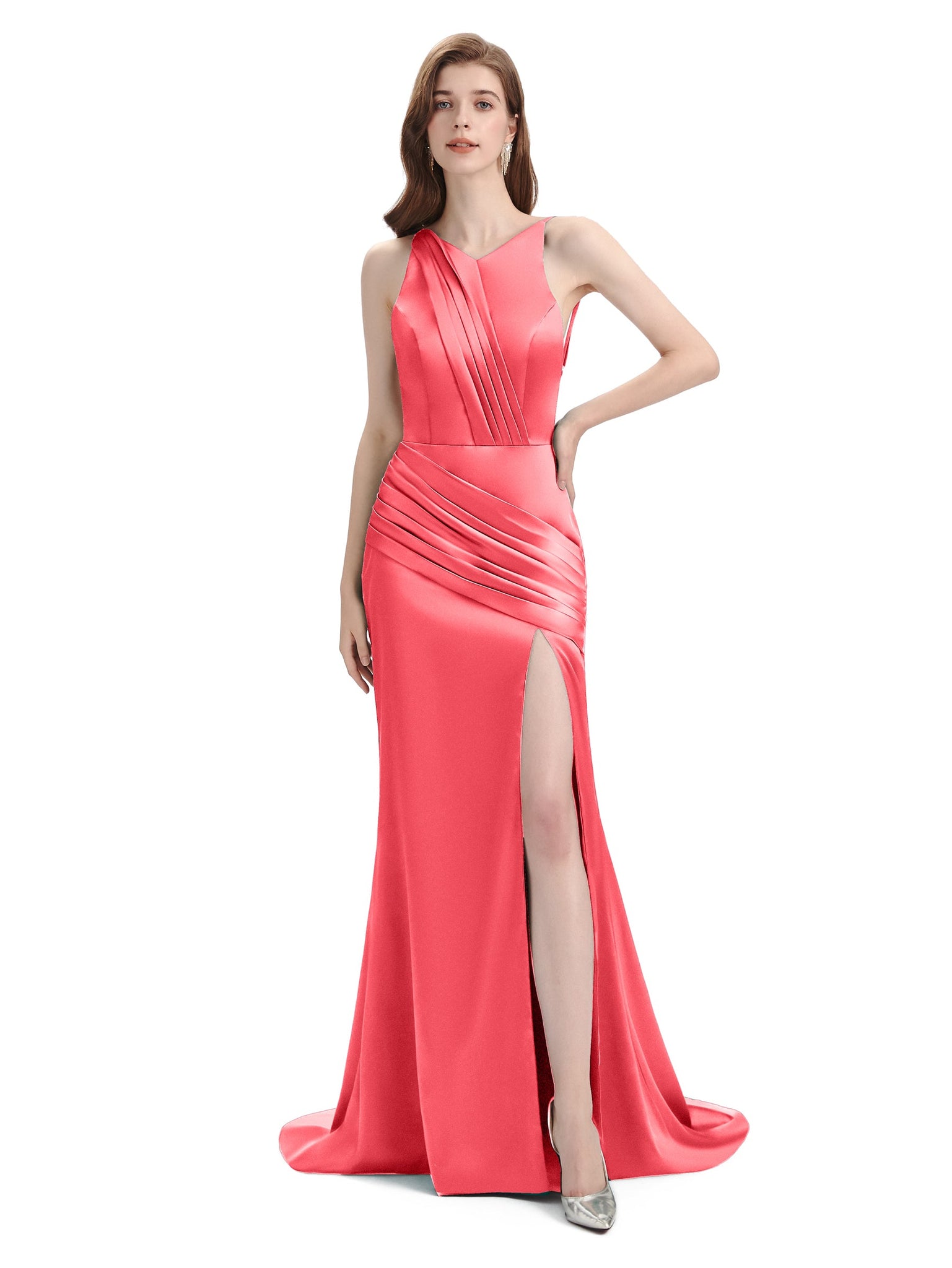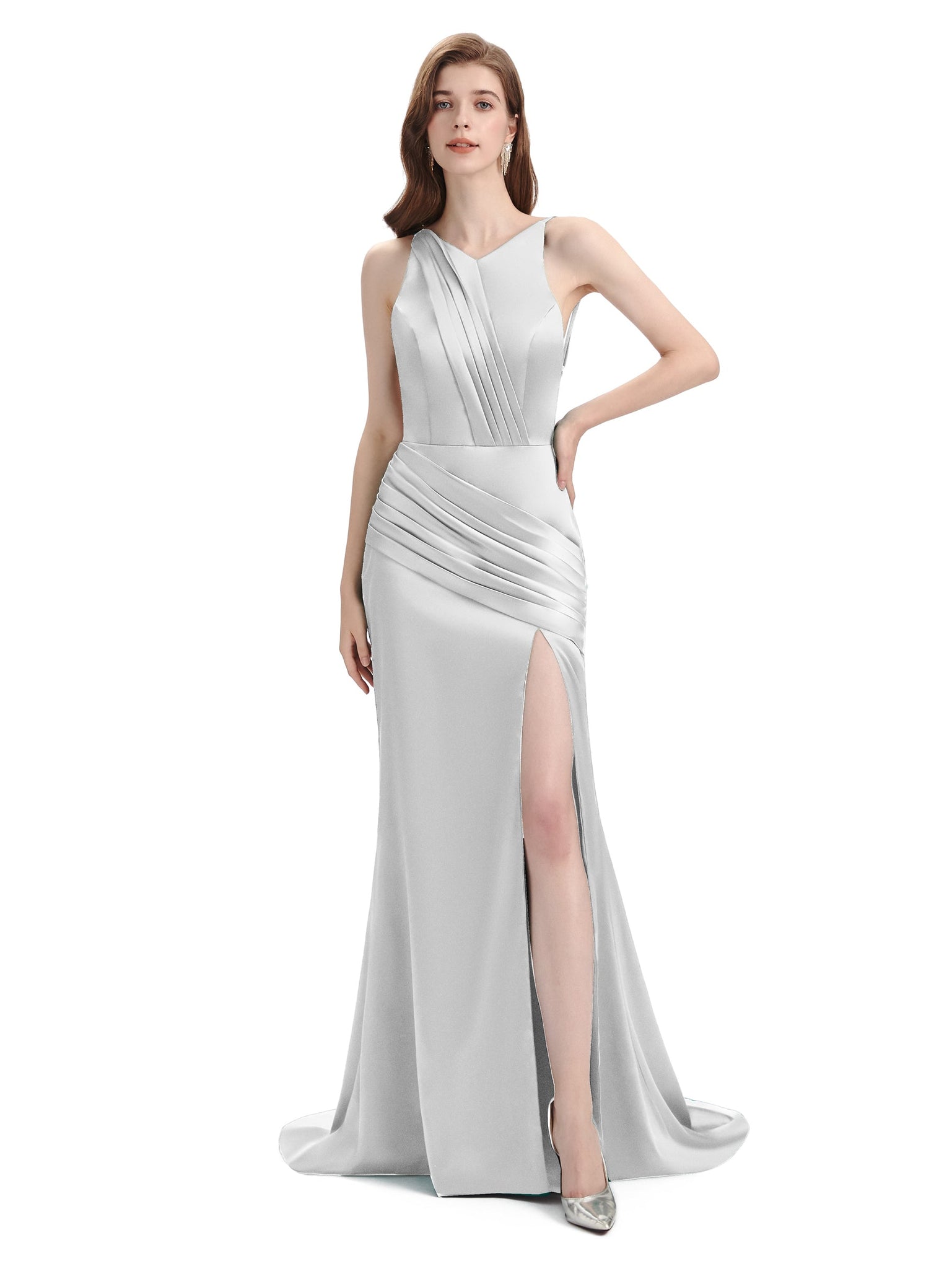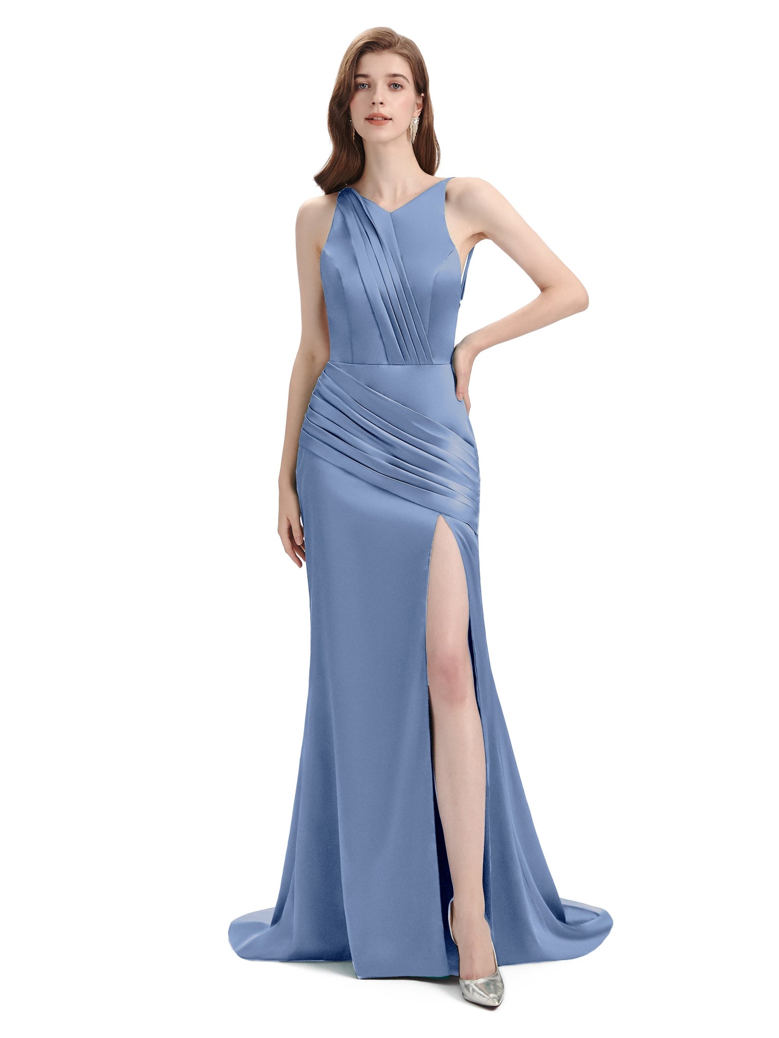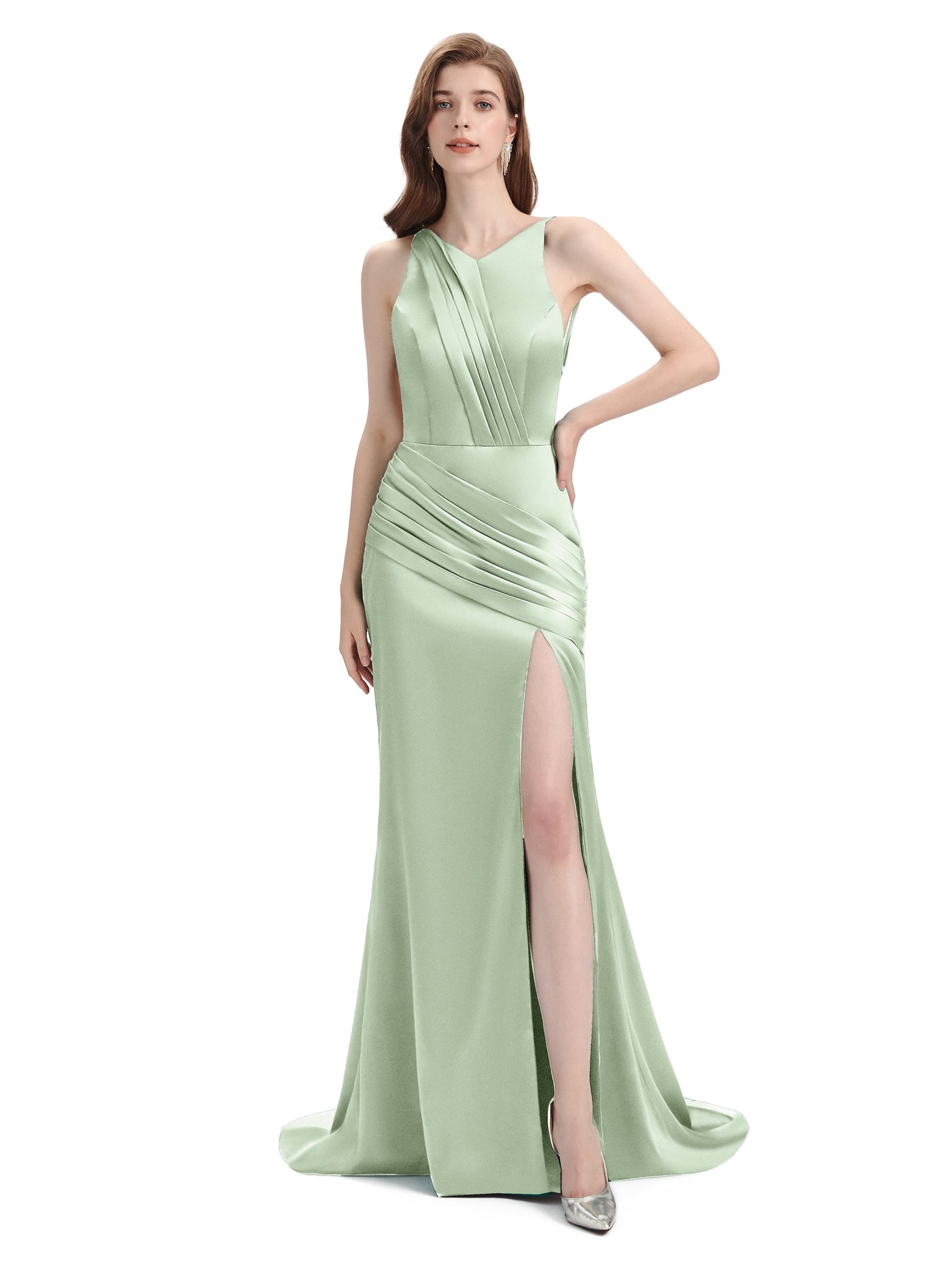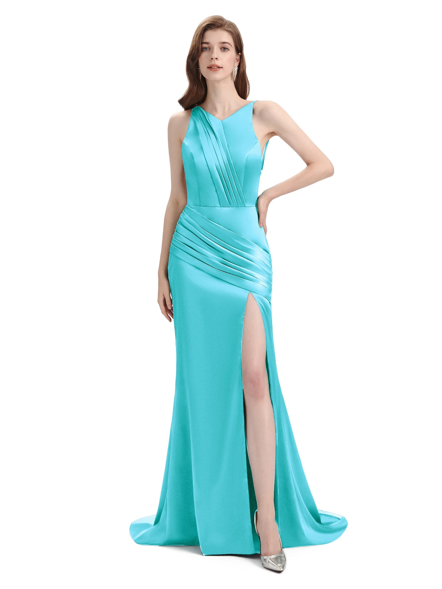 Sexy Backless Mermaid Side Slit Soft Satin Long Mermaid Formal Evening Dresses