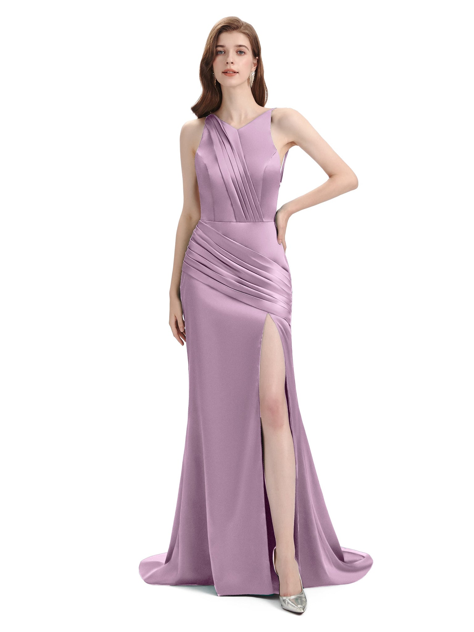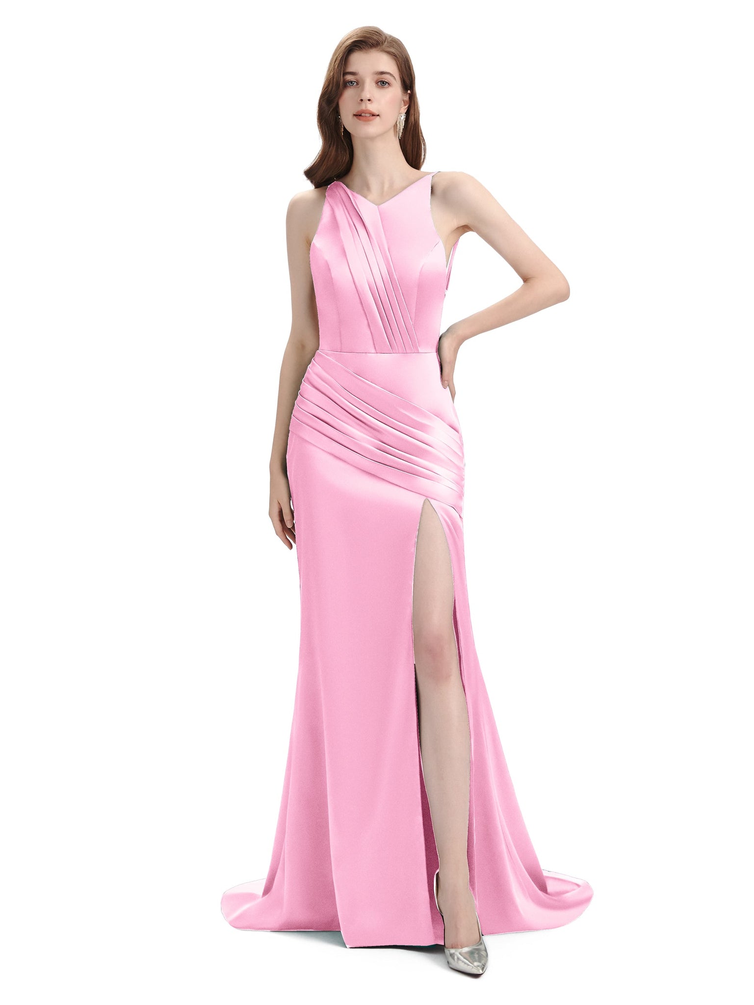 Sexy Backless Mermaid Side Slit Soft Satin Long Mermaid Wedding Bridesmaid Dresses - ChicSew – ChicSew