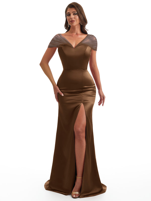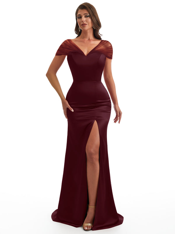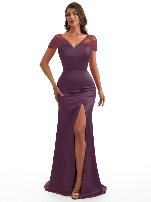Sexy Cap Sleeves V-Neck Side Slit Mermaid Beauty Satin Long Bridesmaid Dresses Online - ChicSew – ChicSew