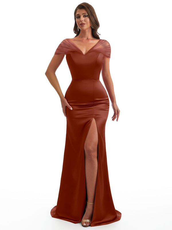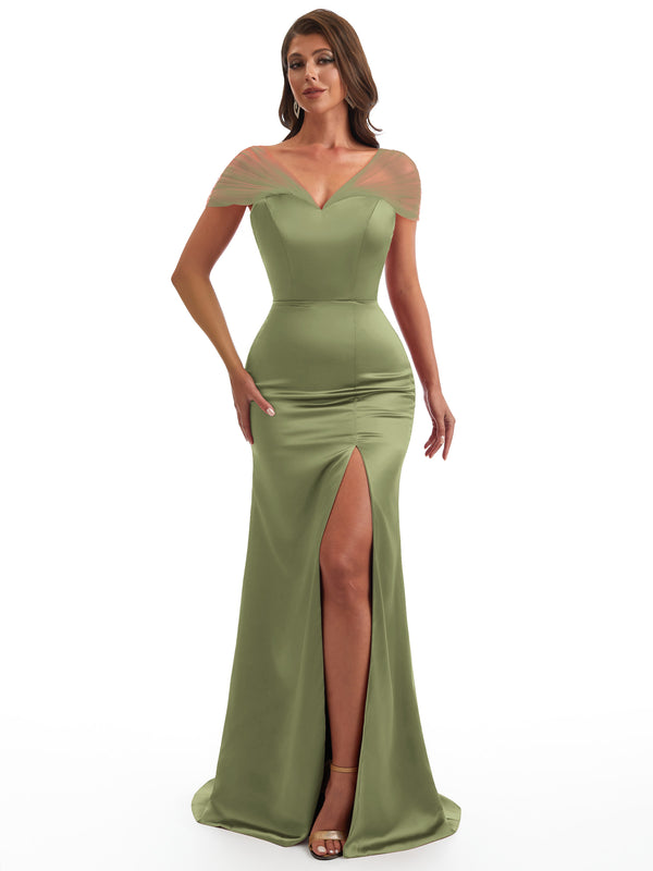 Sexy Cap Sleeves V-Neck Side Slit Mermaid Beauty Satin Long Bridesmaid Dresses Online