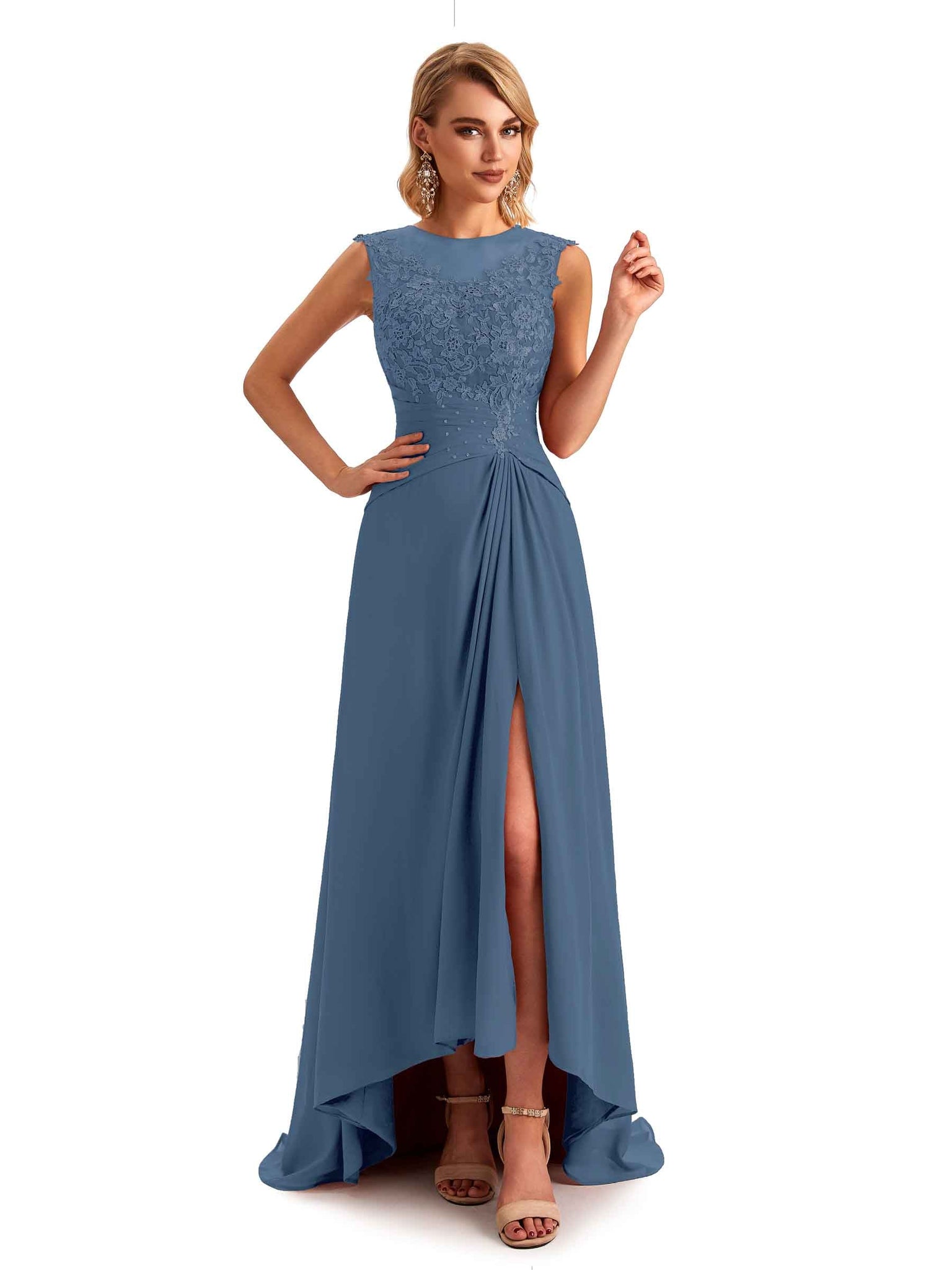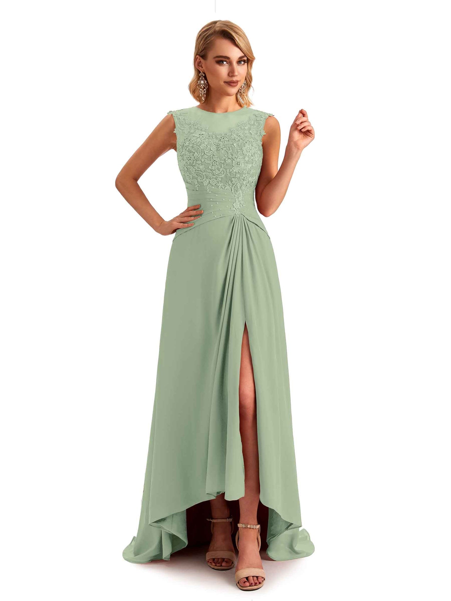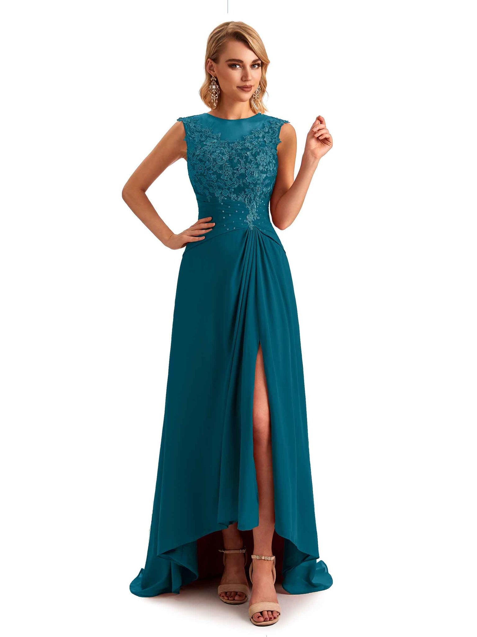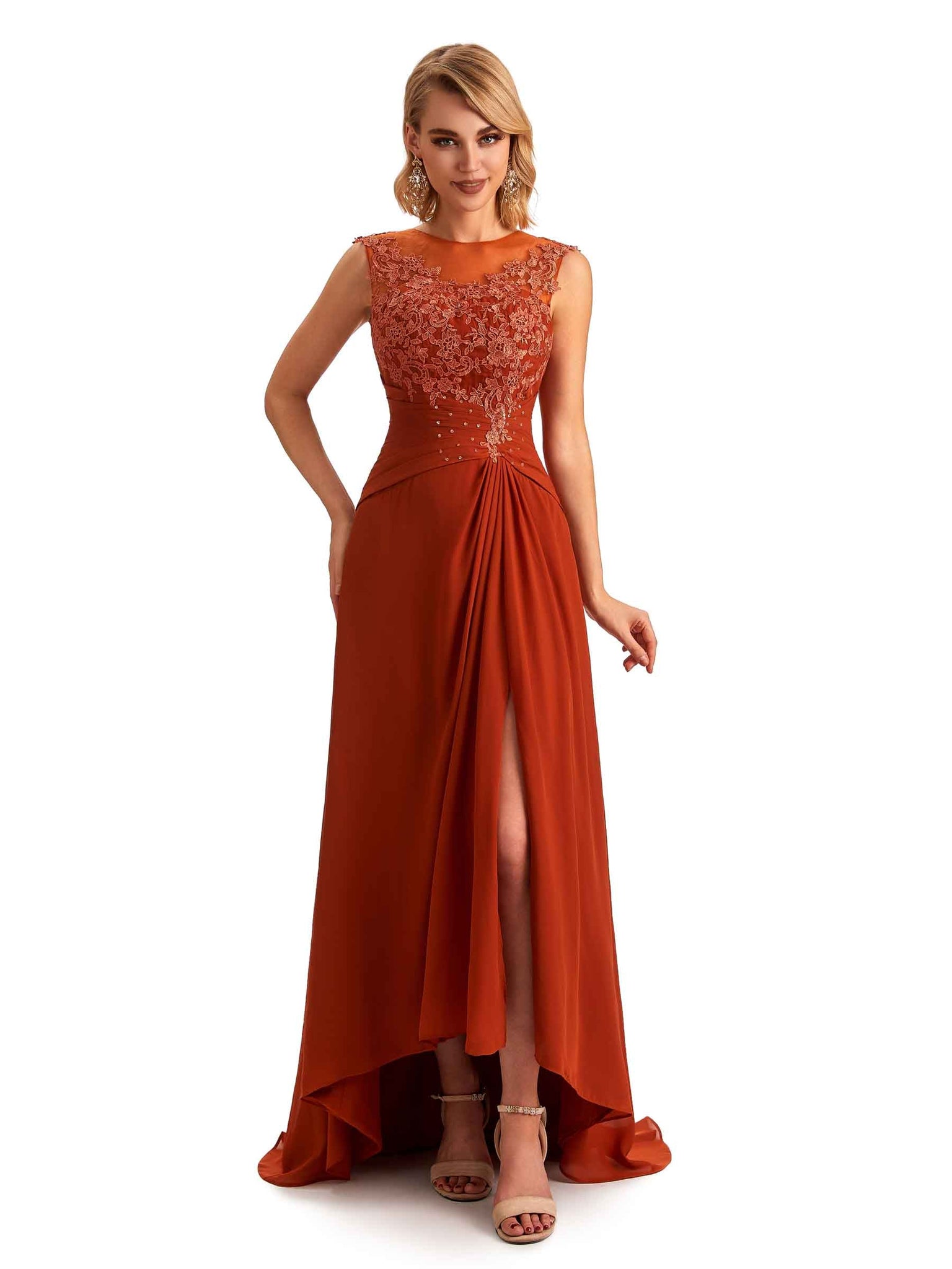 Sexy Chiffon A-line Jewel Side Slit Sleeveless Long Lace Mother of the Brides Dresses - ChicSew – ChicSew