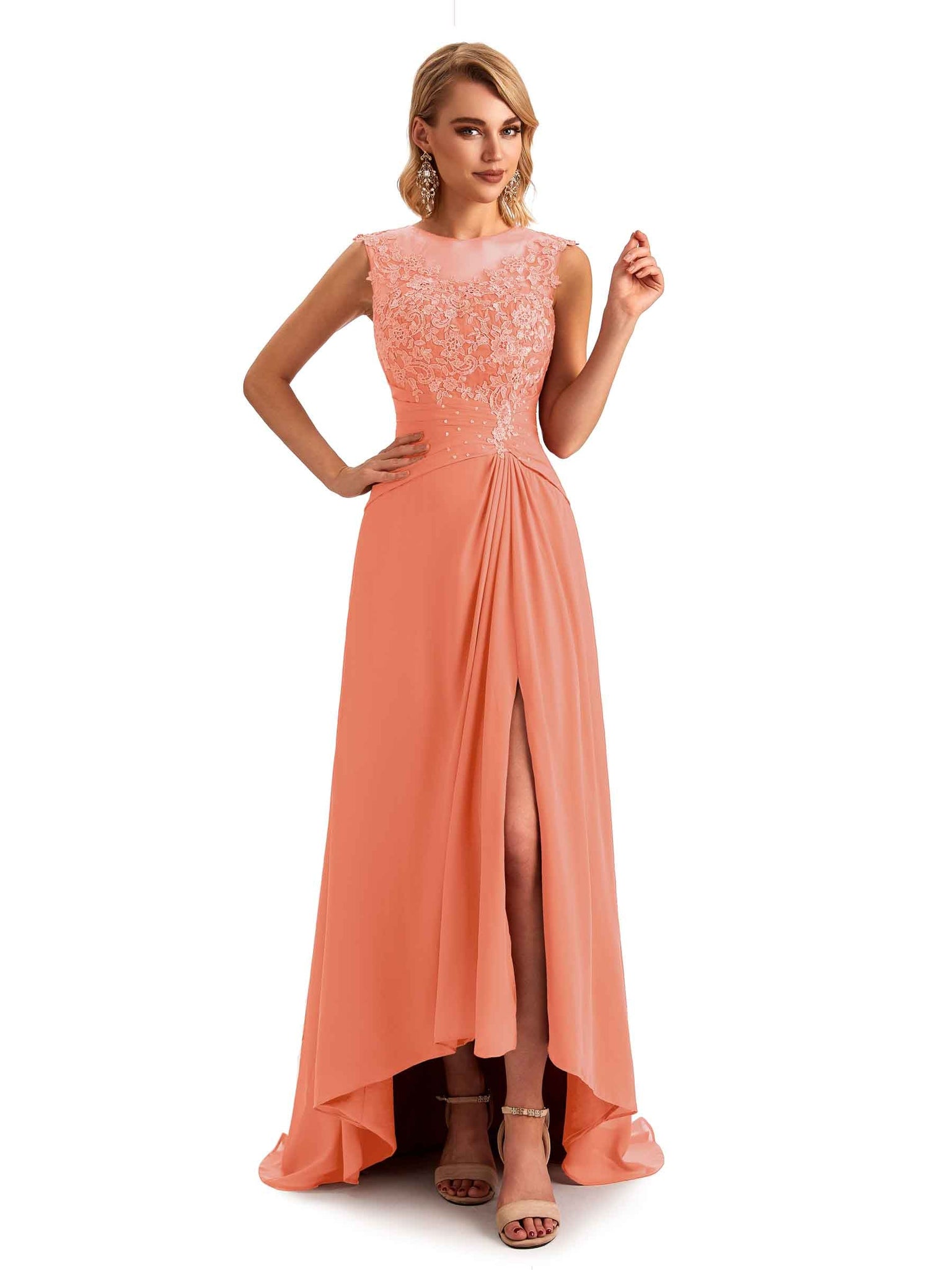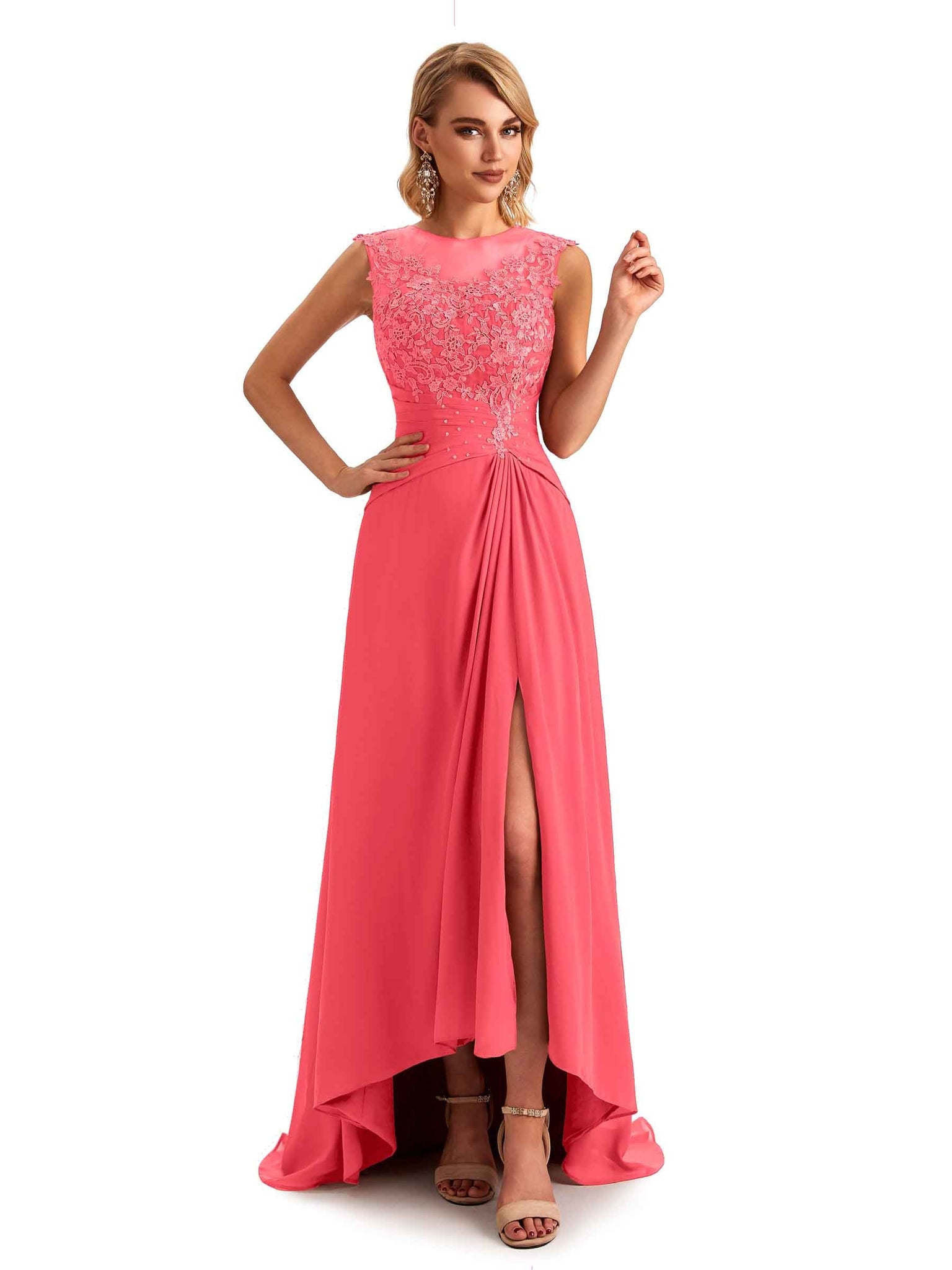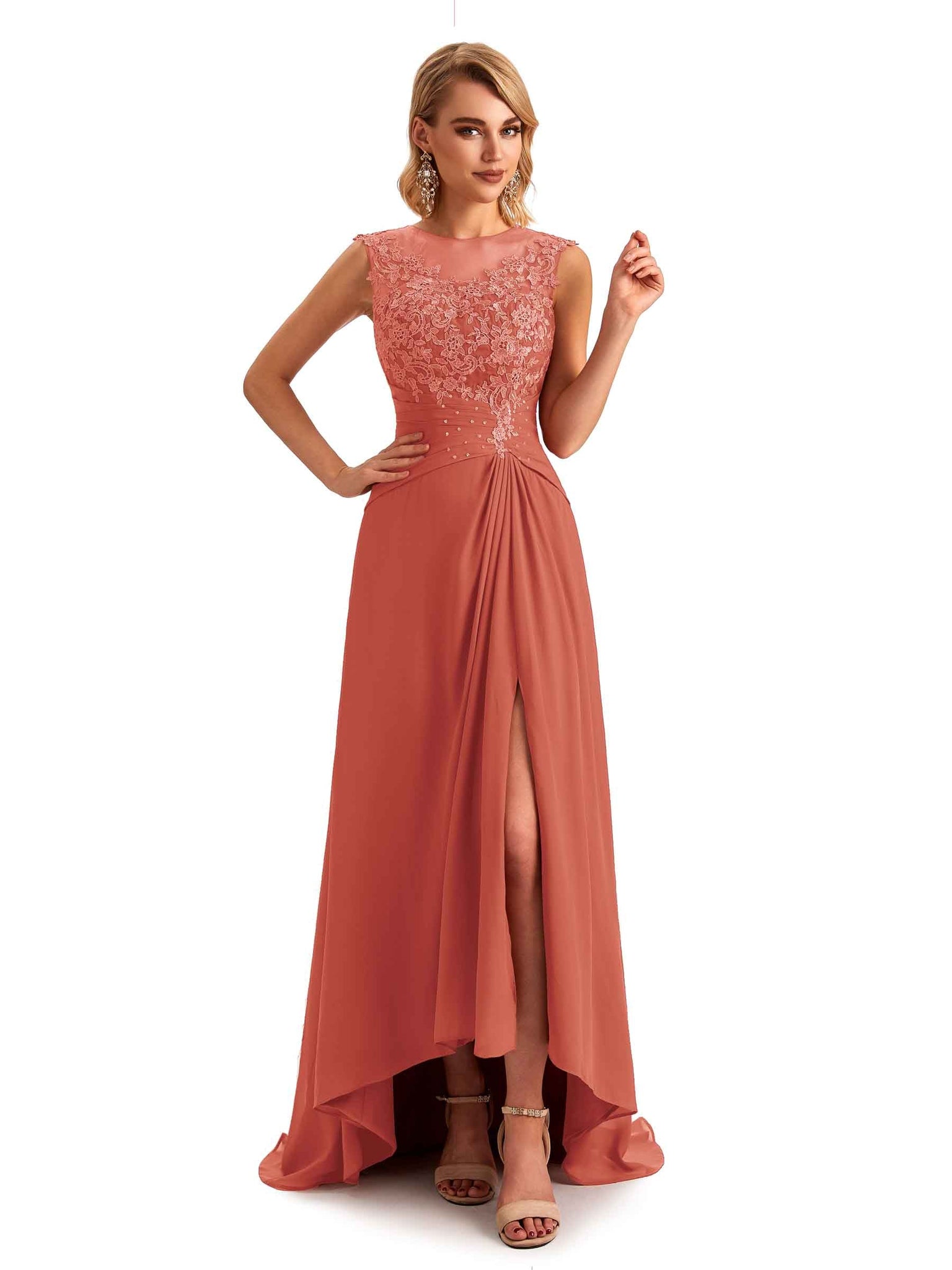 Elegant Chiffon Jewel Side Slit High Low Lace Beaded Mother of the Brides Dresses