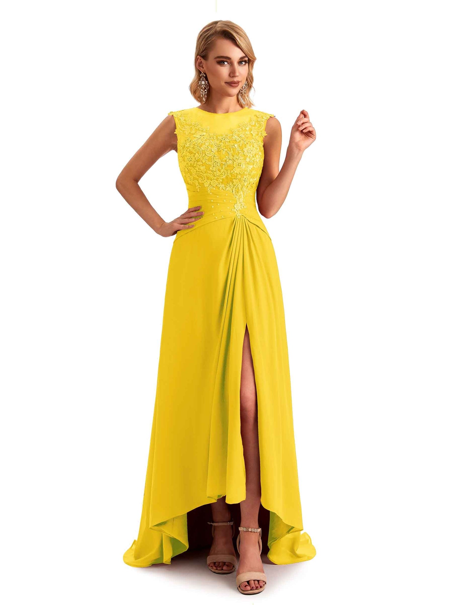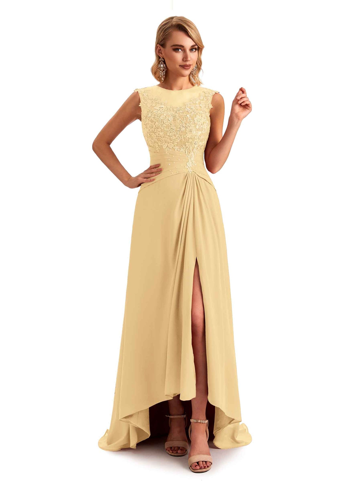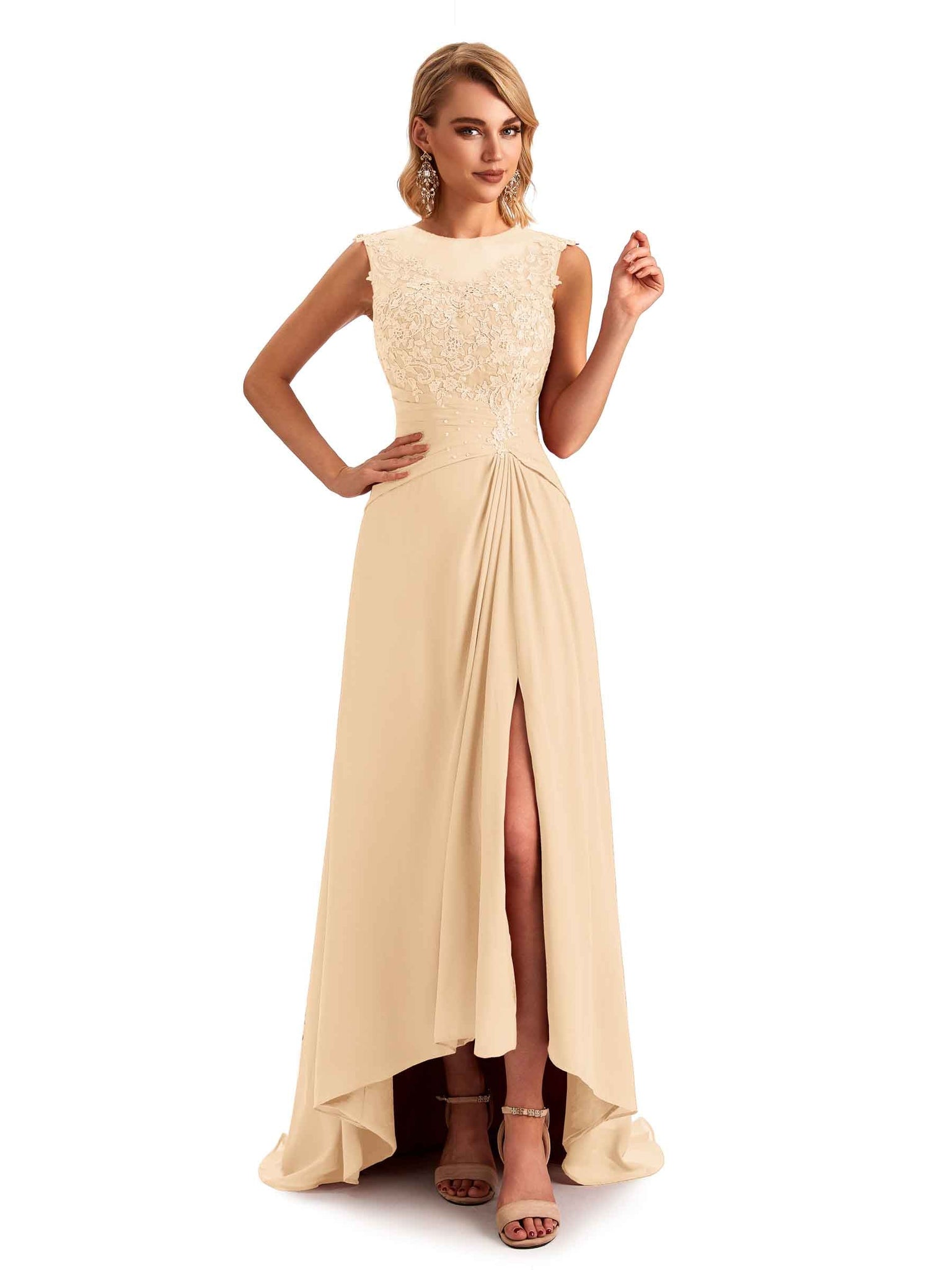 Elegant Chiffon Jewel Side Slit High Low Lace Beaded Mother of the Brides Dresses