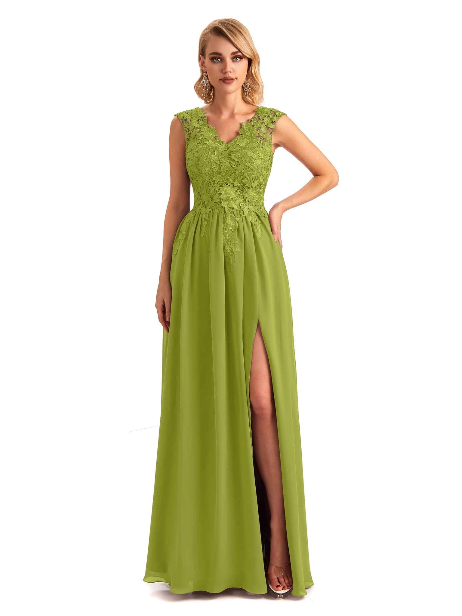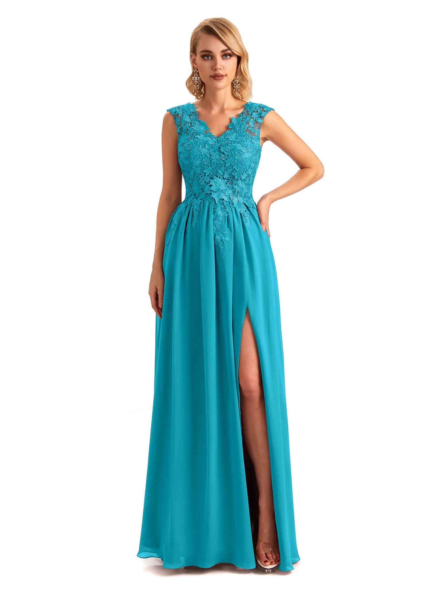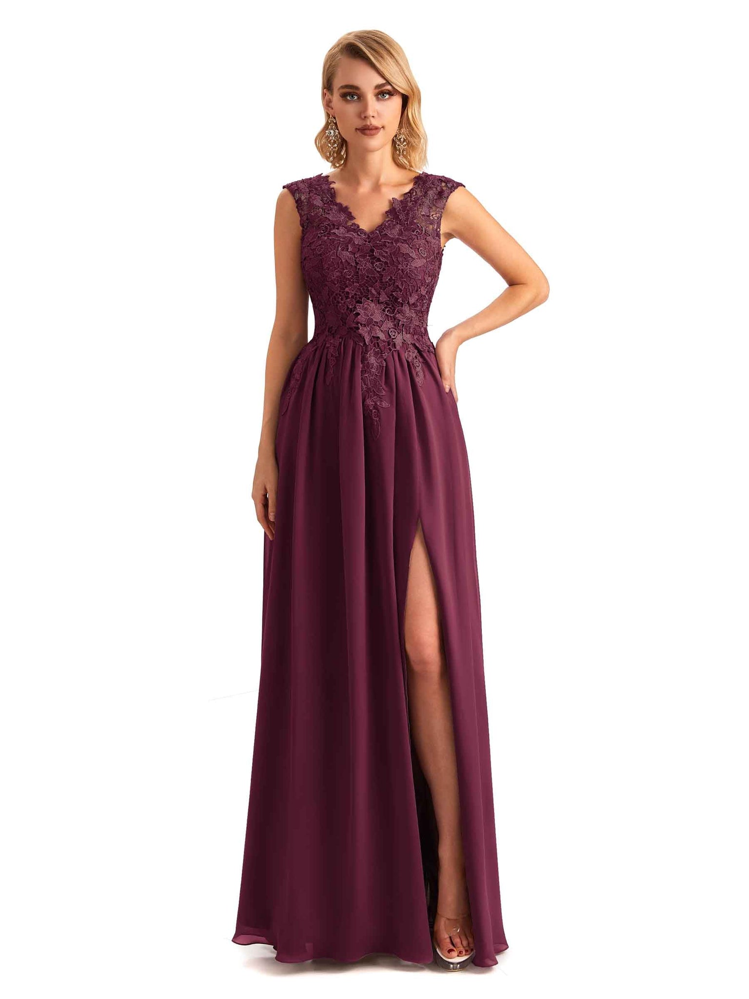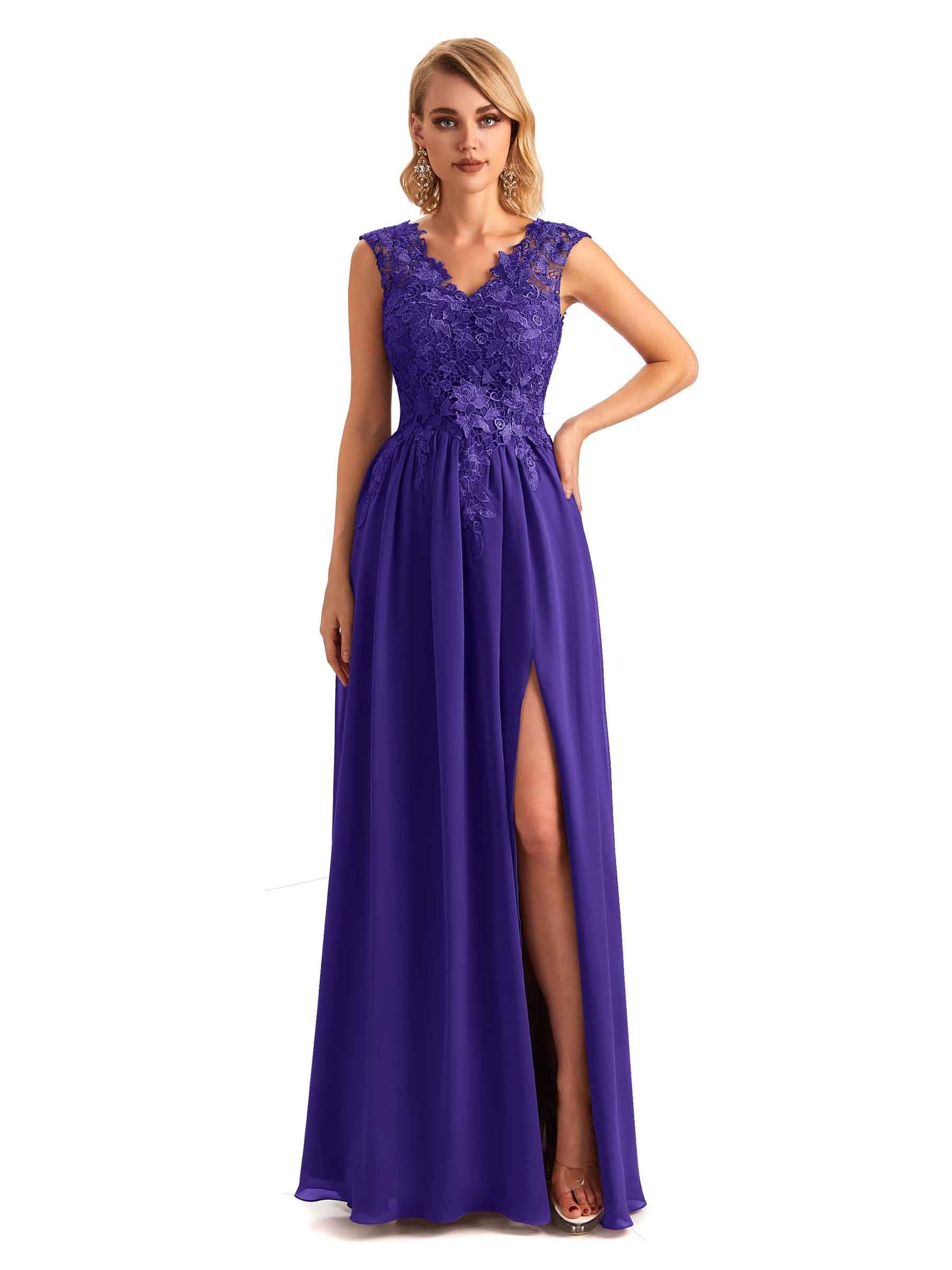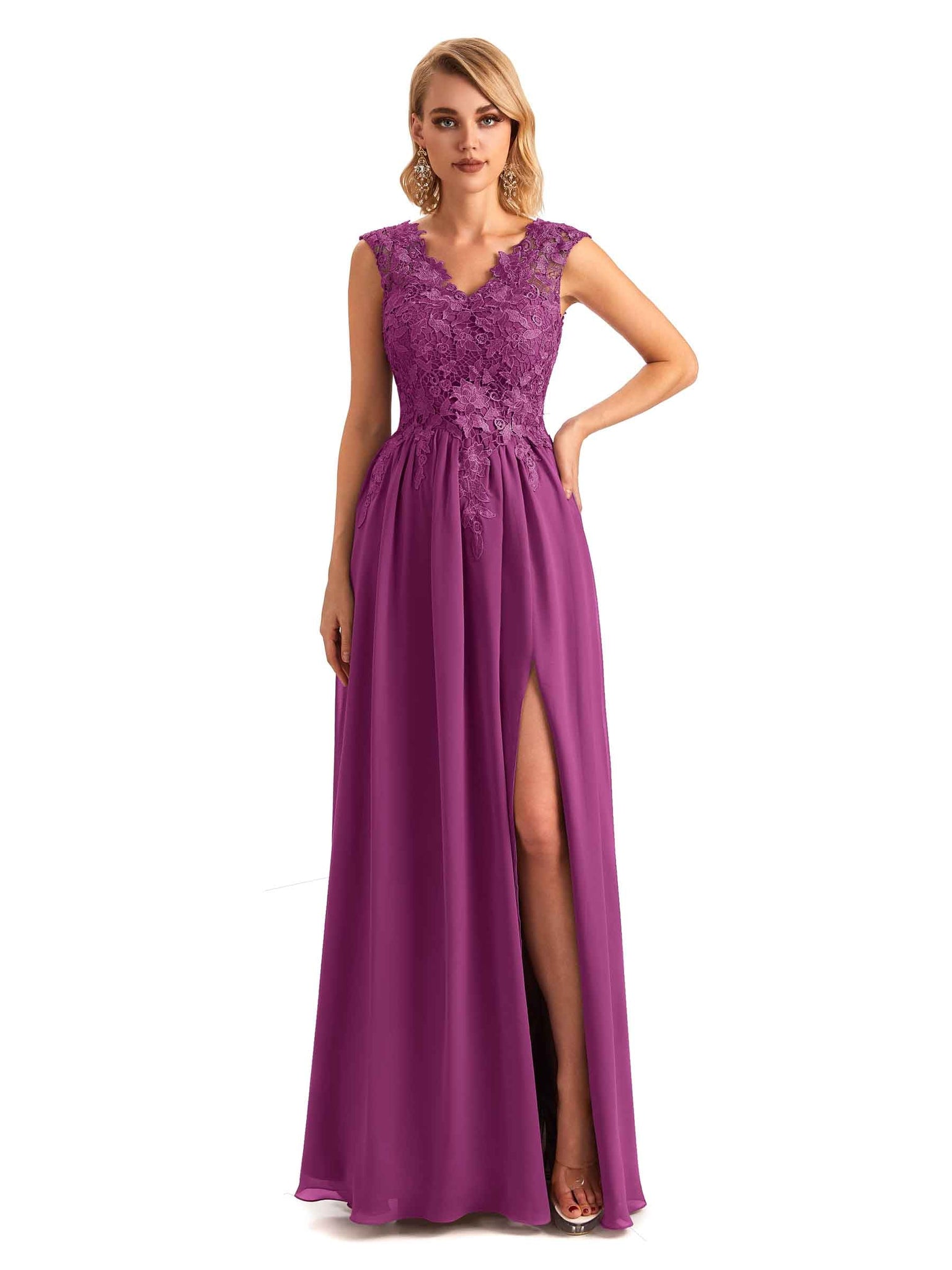 Sexy Chiffon V-neck A-line Side Slit Sleeveless Long Lace Mother of the Brides Dresses - ChicSew – ChicSew