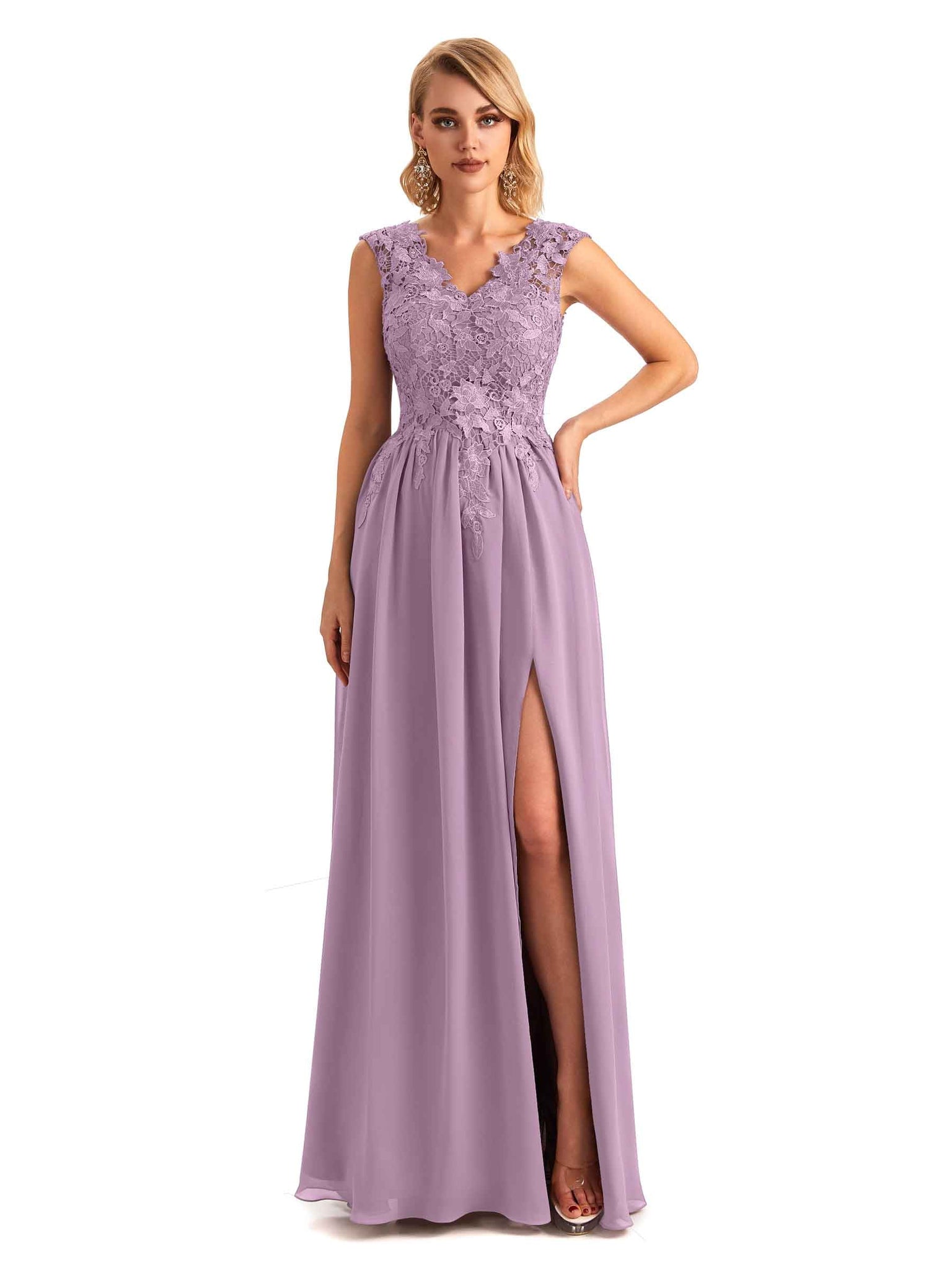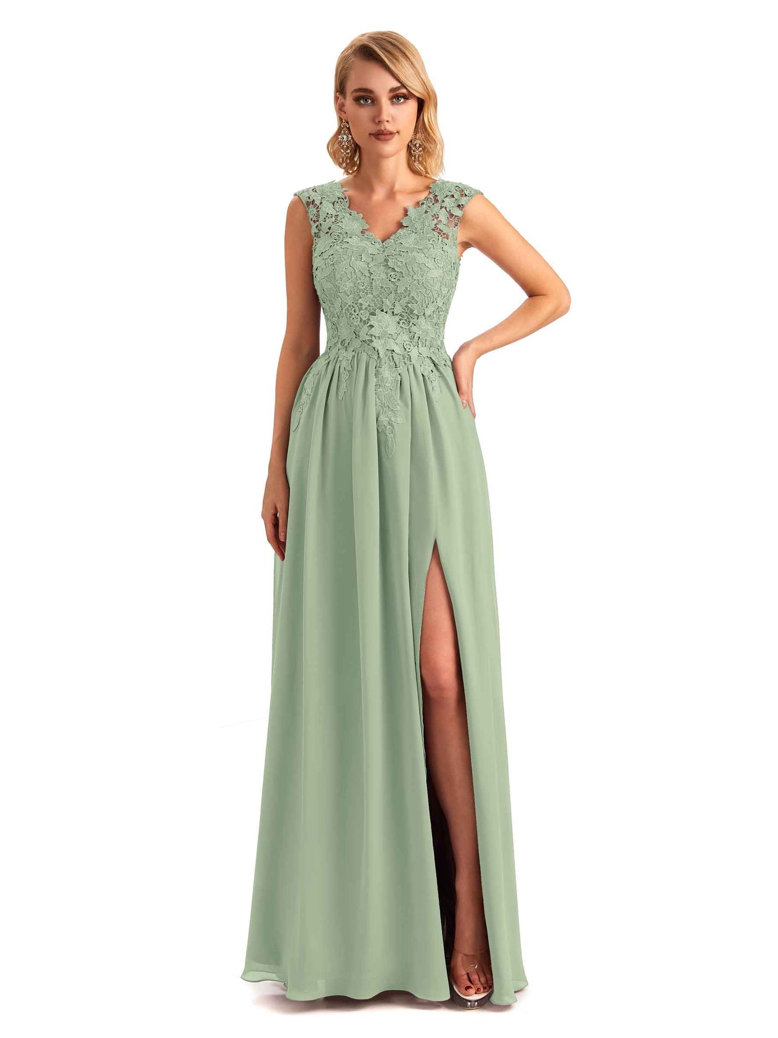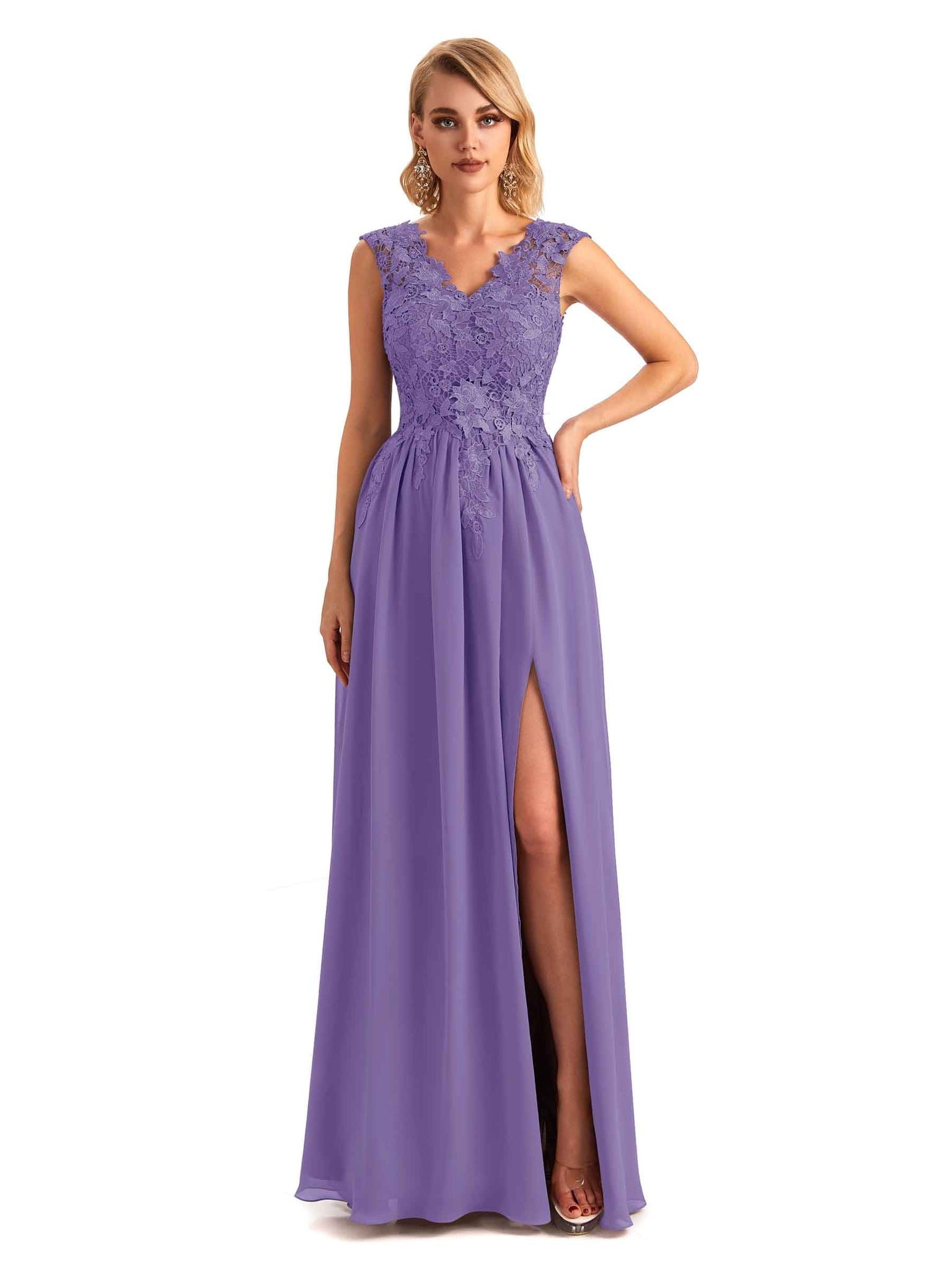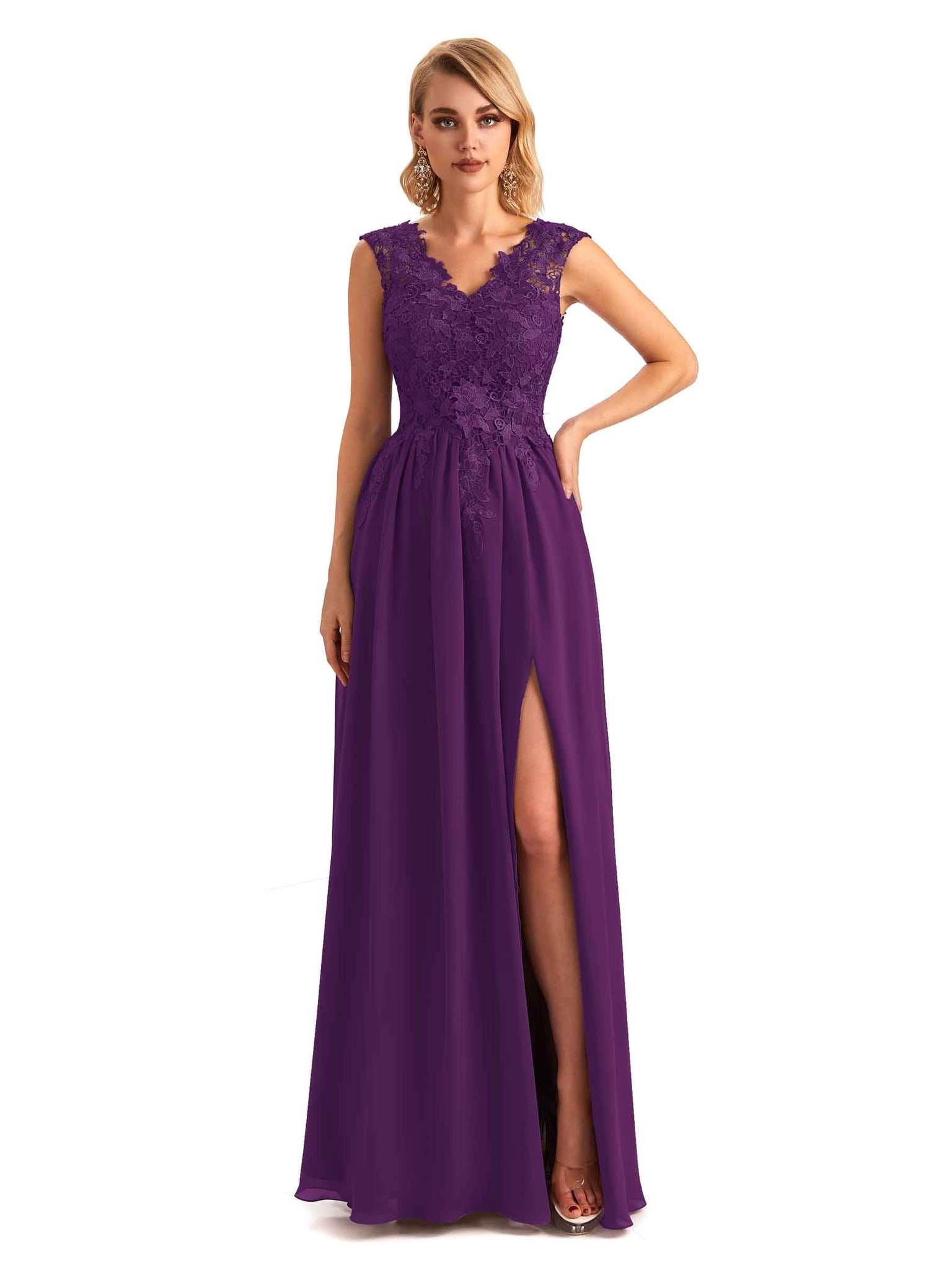 Sexy Chiffon V-neck A-line Side Slit Sleeveless Long Lace Mother of the Brides Dresses - ChicSew – ChicSew