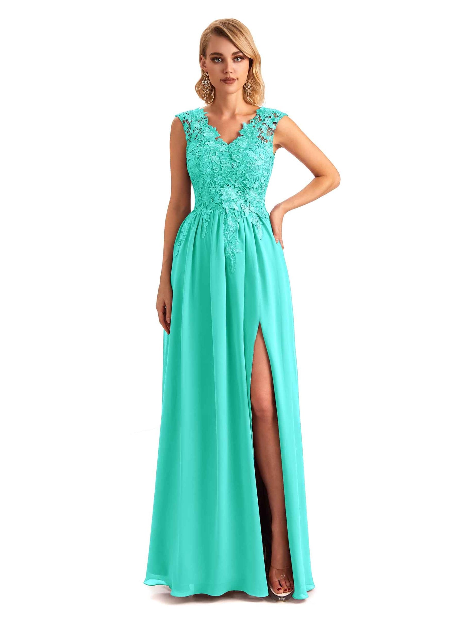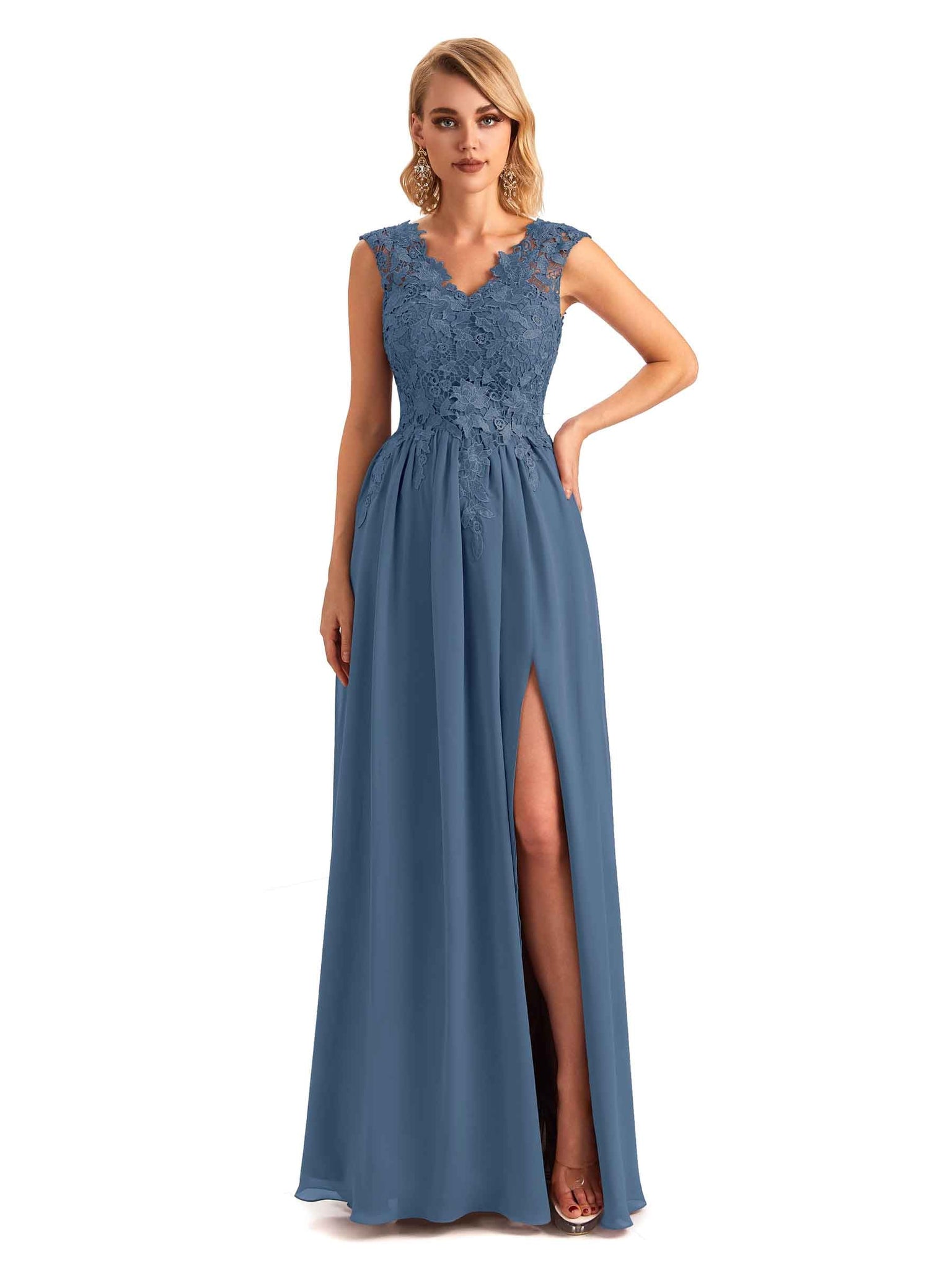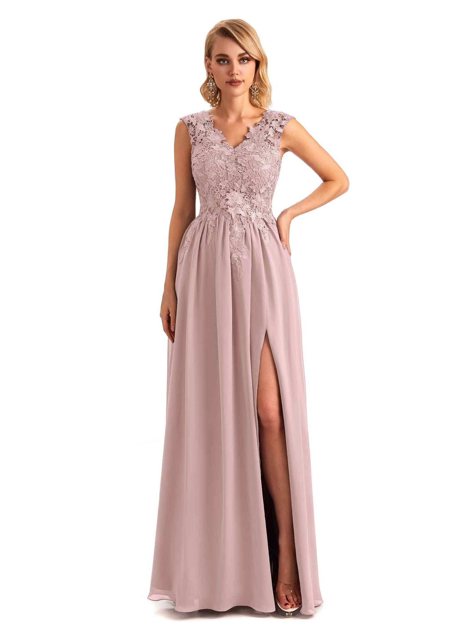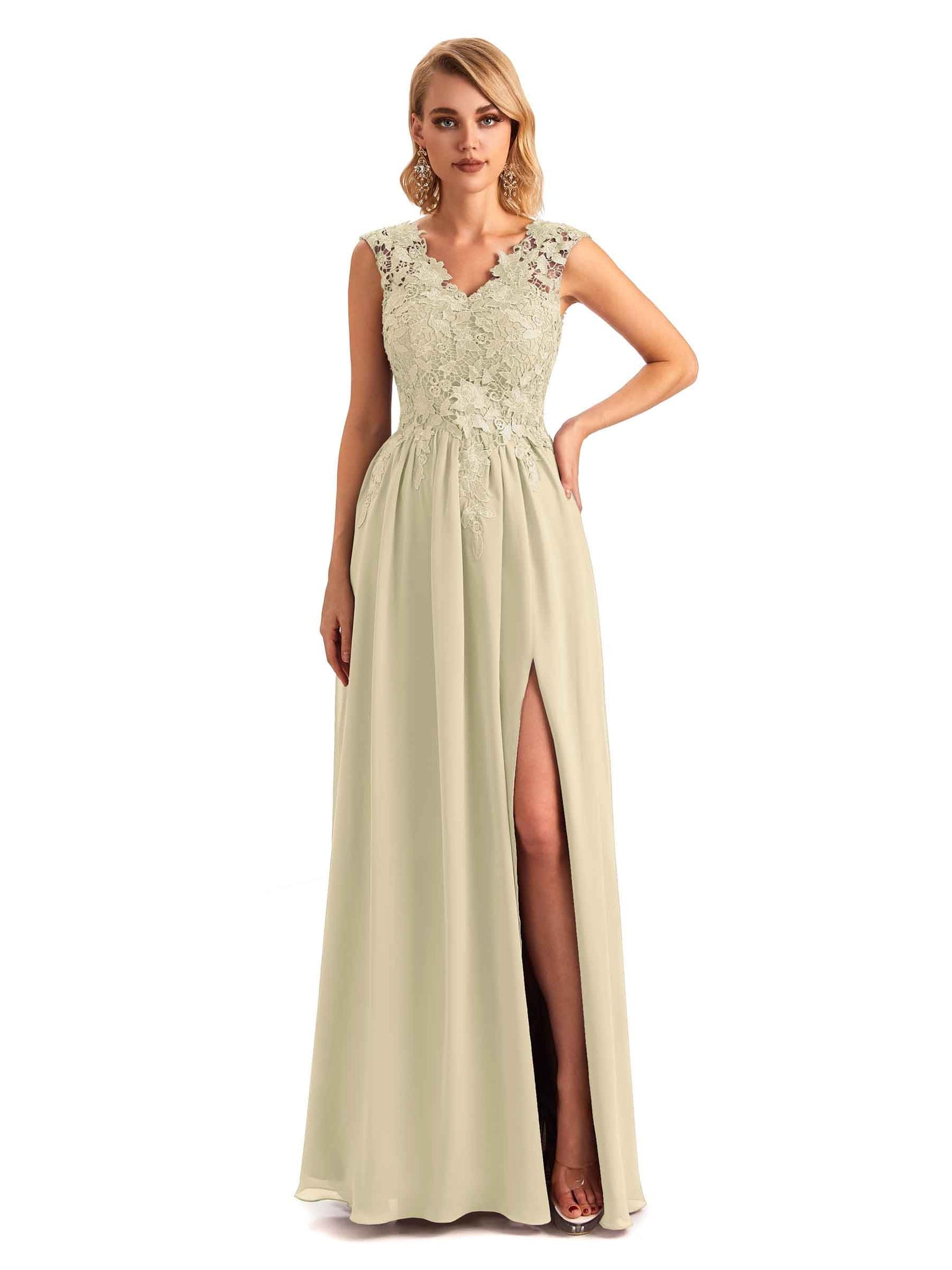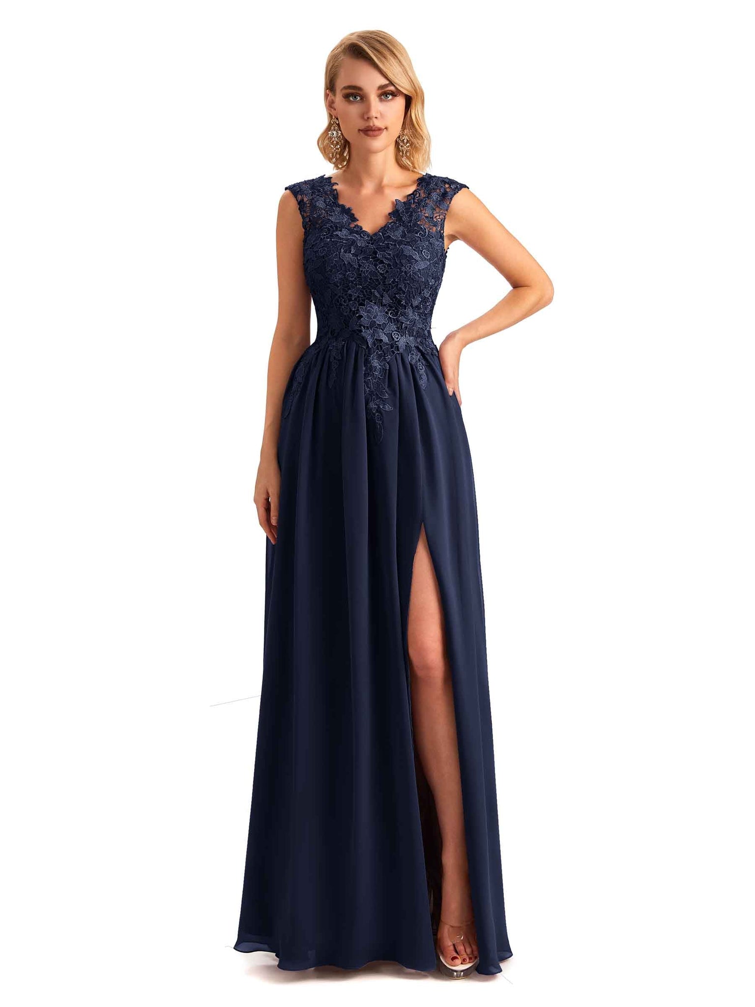 Sexy Chiffon V-neck A-line Side Slit Sleeveless Long Lace Mother of the Brides Dresses - ChicSew – ChicSew