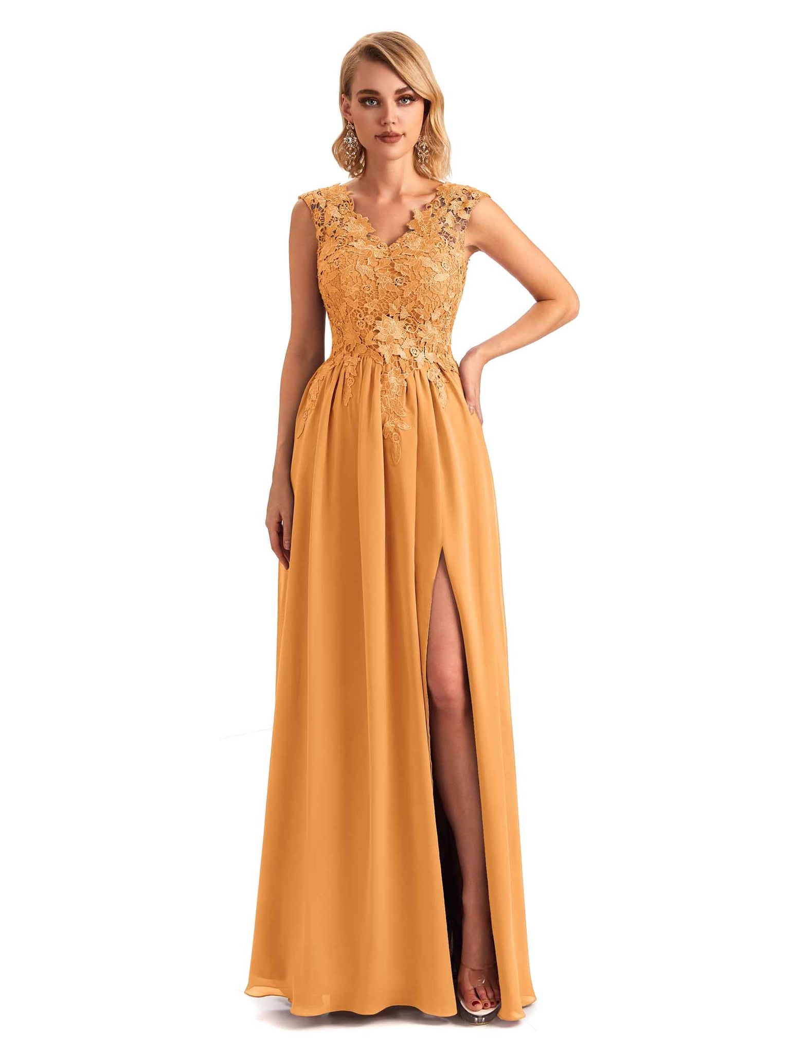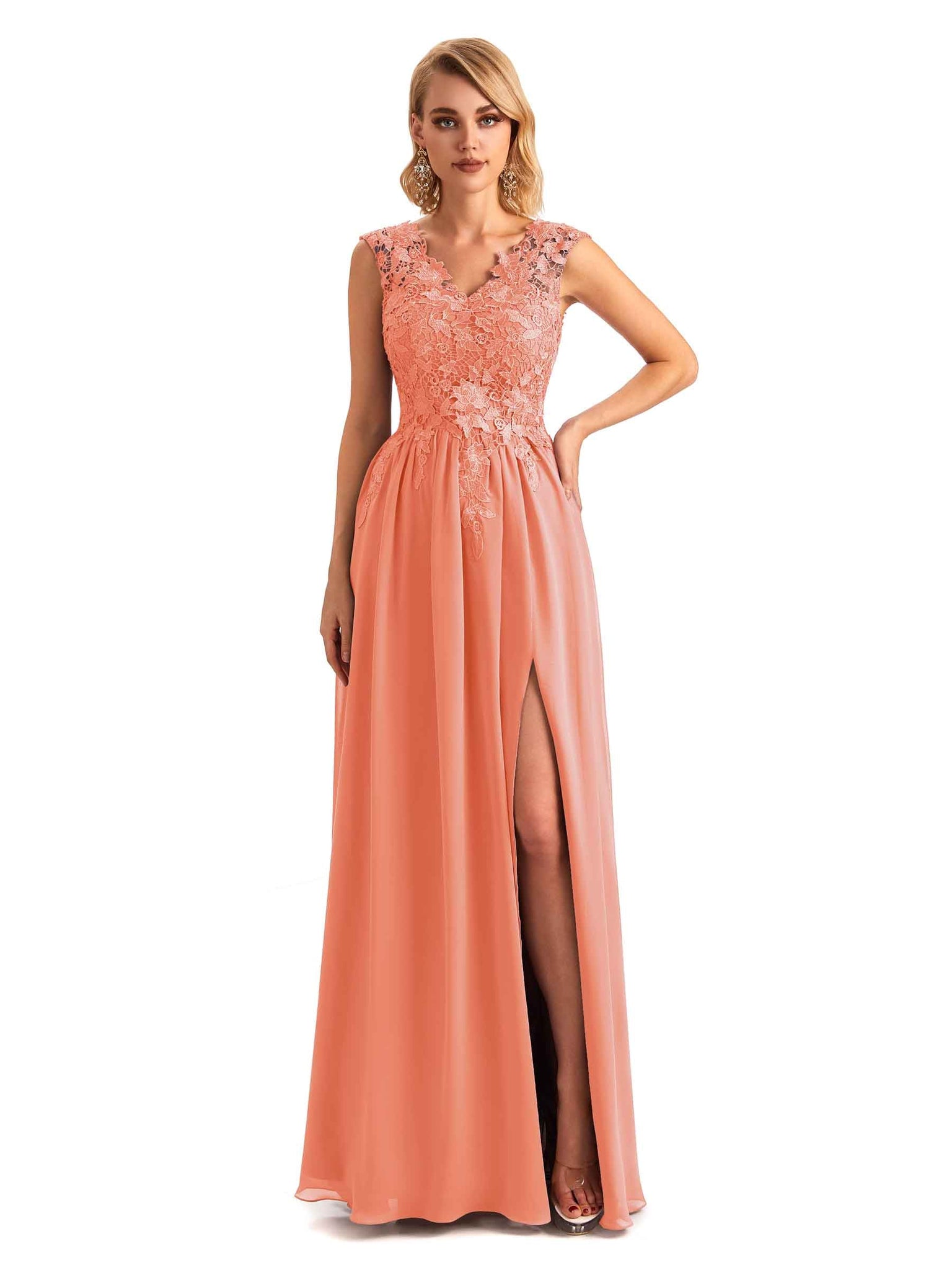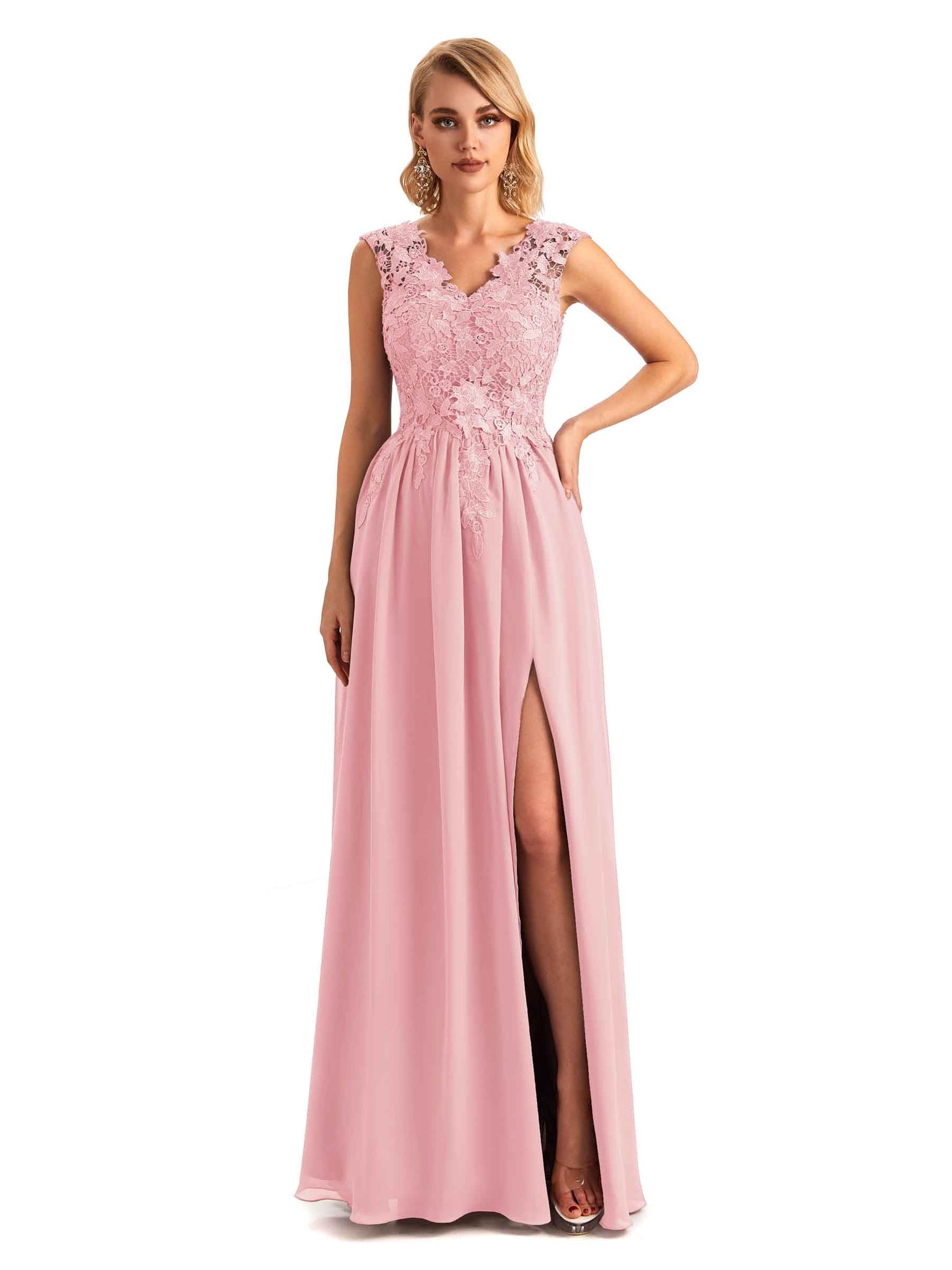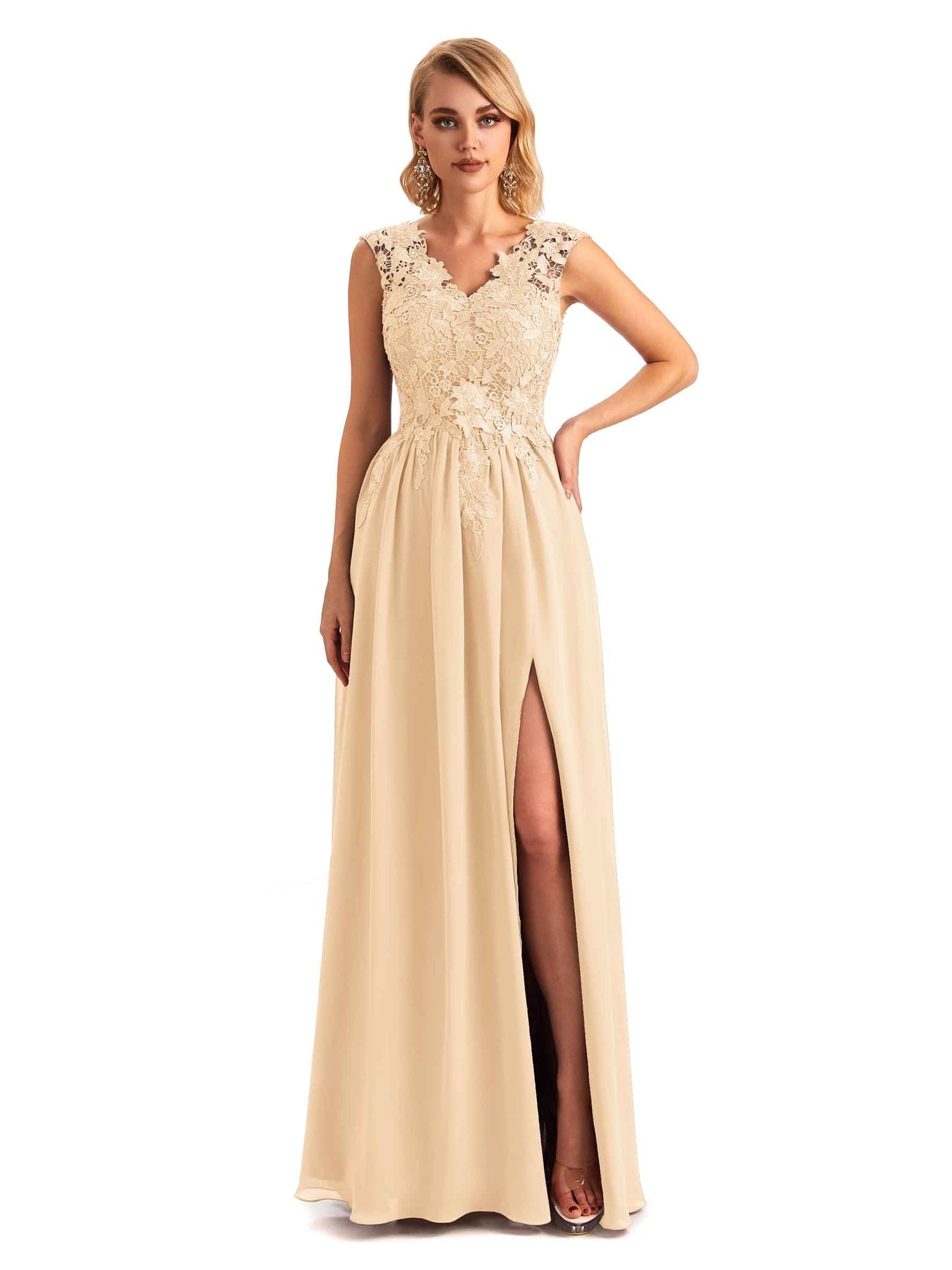 Sexy Chiffon V-neck A-line Side Slit Sleeveless Long Lace Mother of the Brides Dresses - ChicSew – ChicSew
