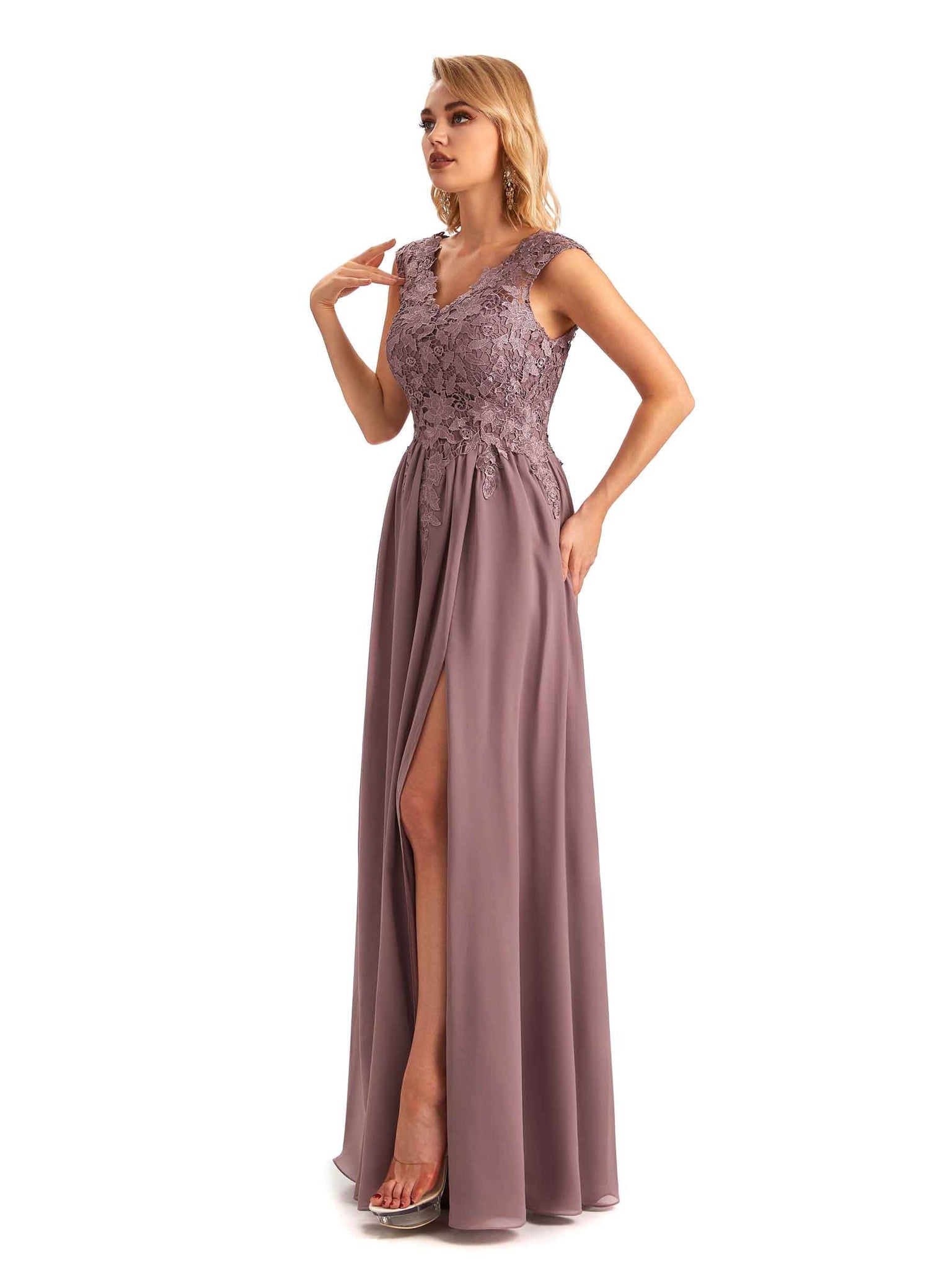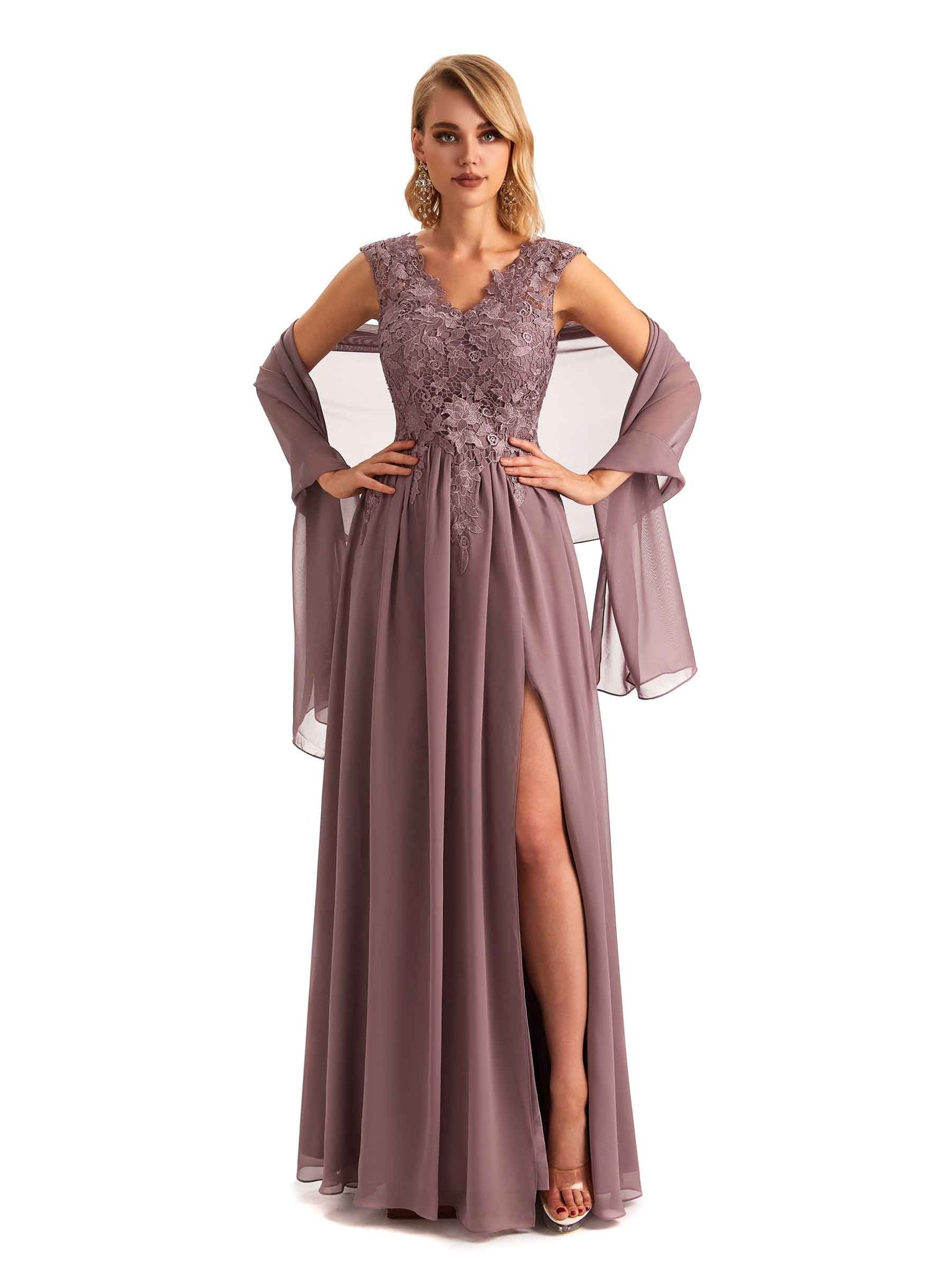 Elegant Side Slit Chiffon V-neck Long Lace Mother of the Brides Dresses