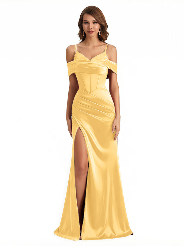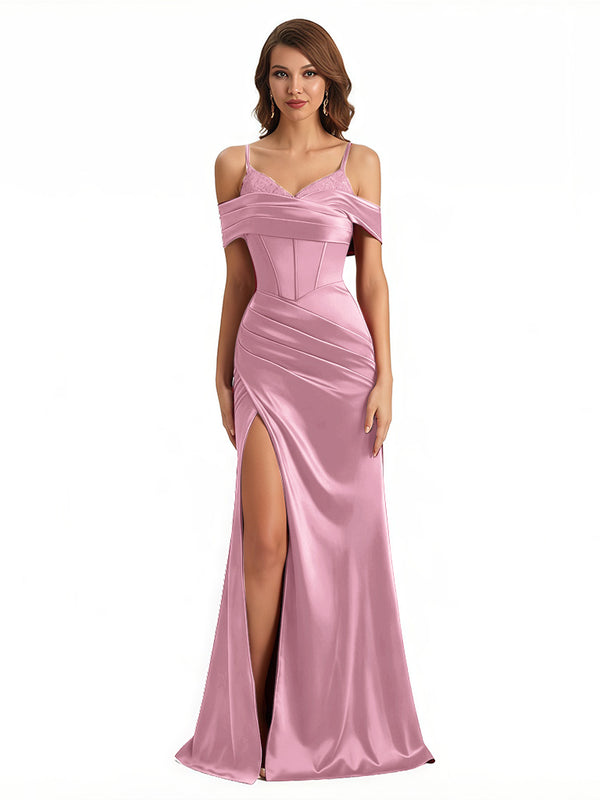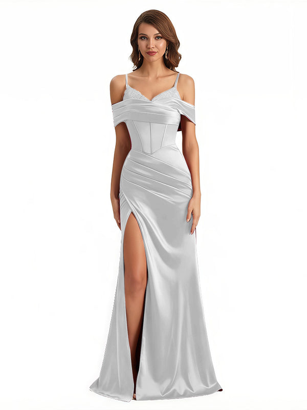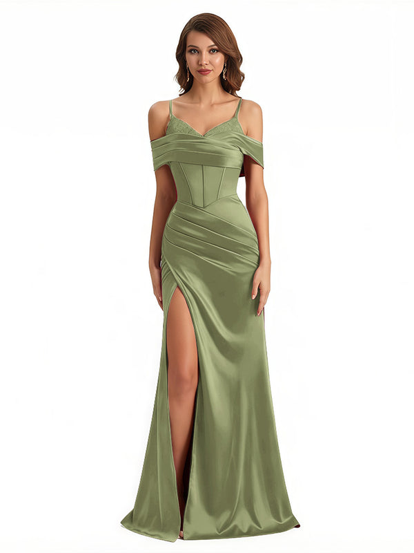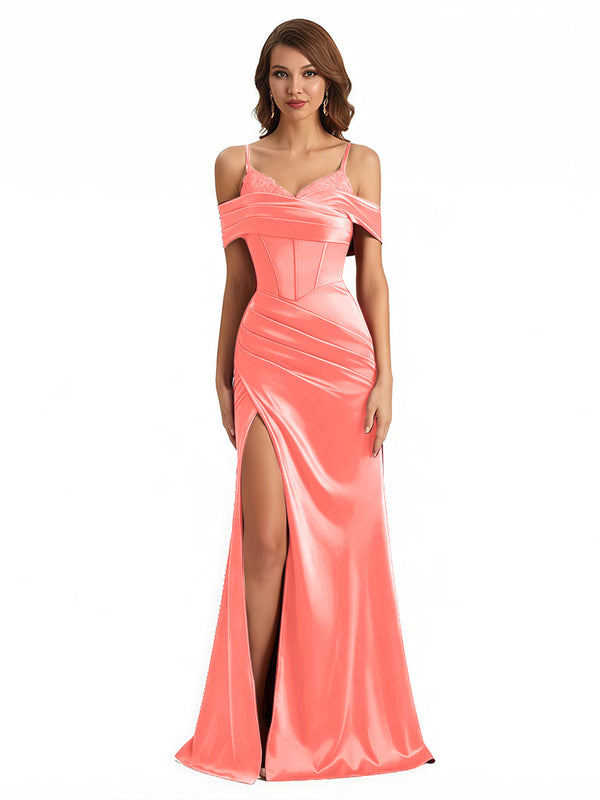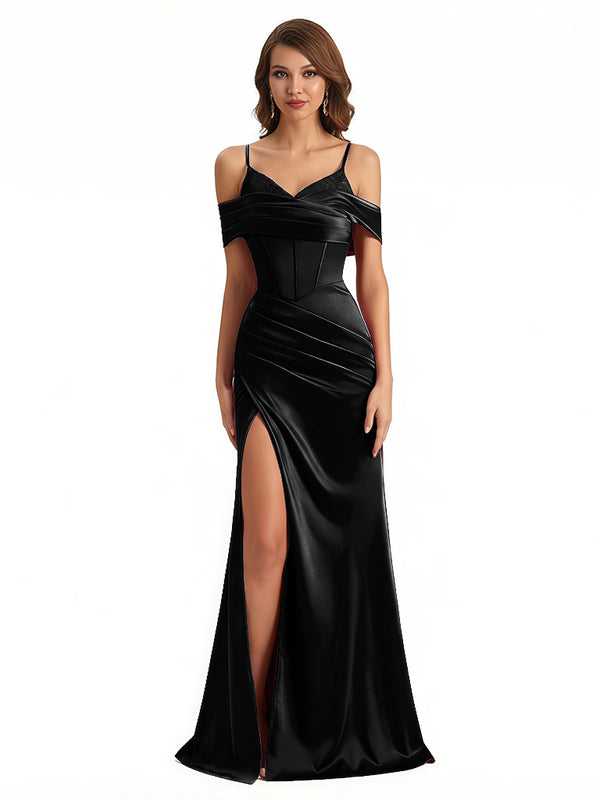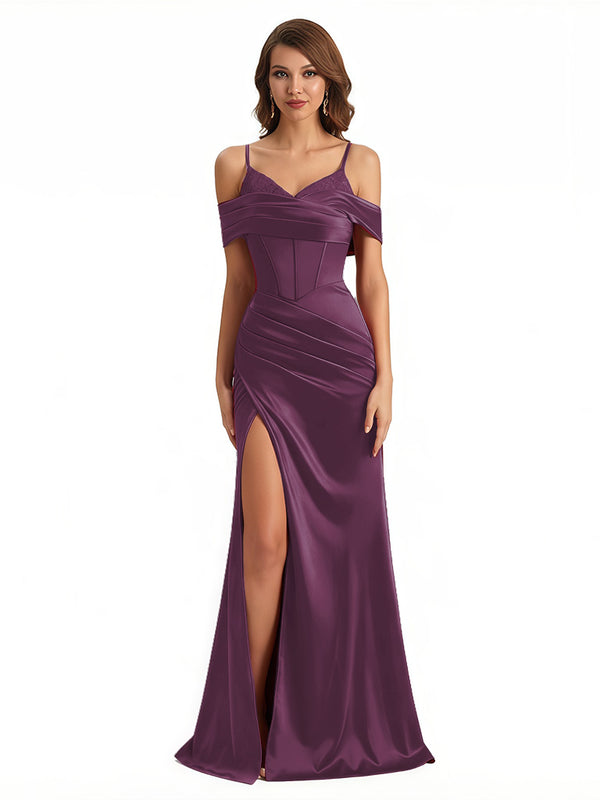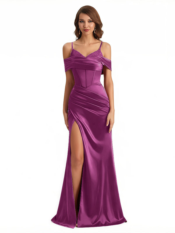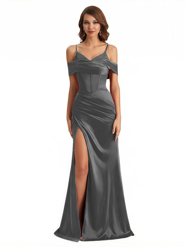 Sexy Cold Shoulder Mermaid Silky Satin Maxi Evening Gowns For Ladies With Bonings Side Slit