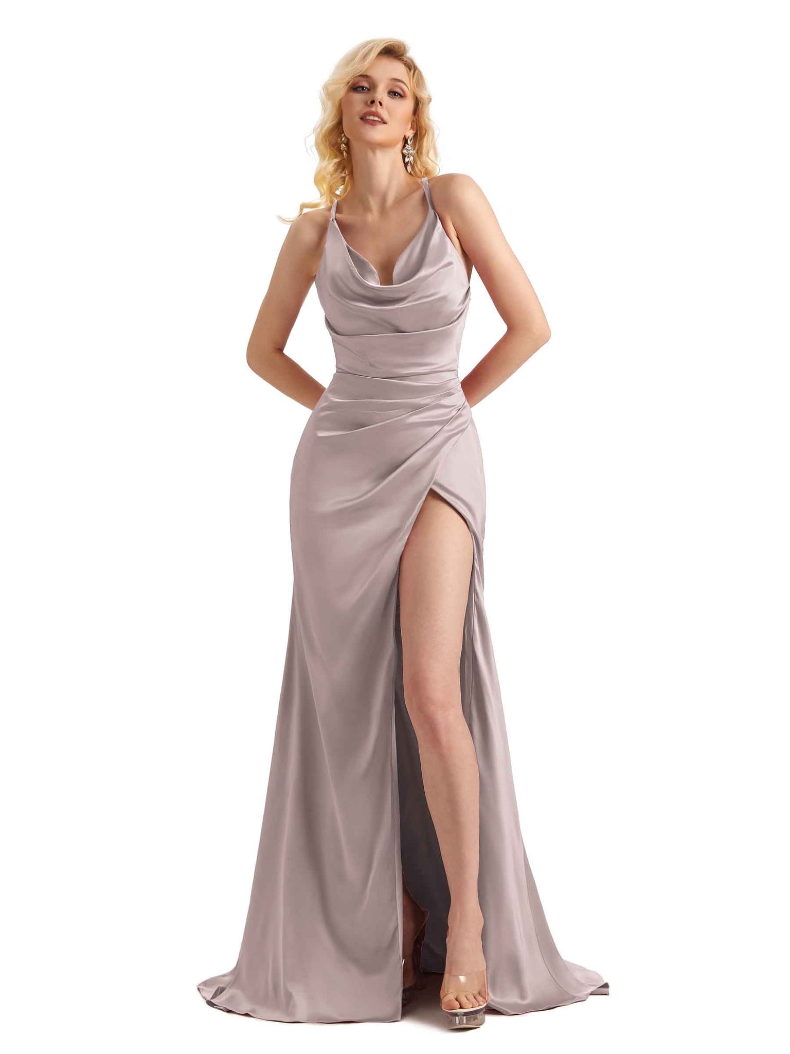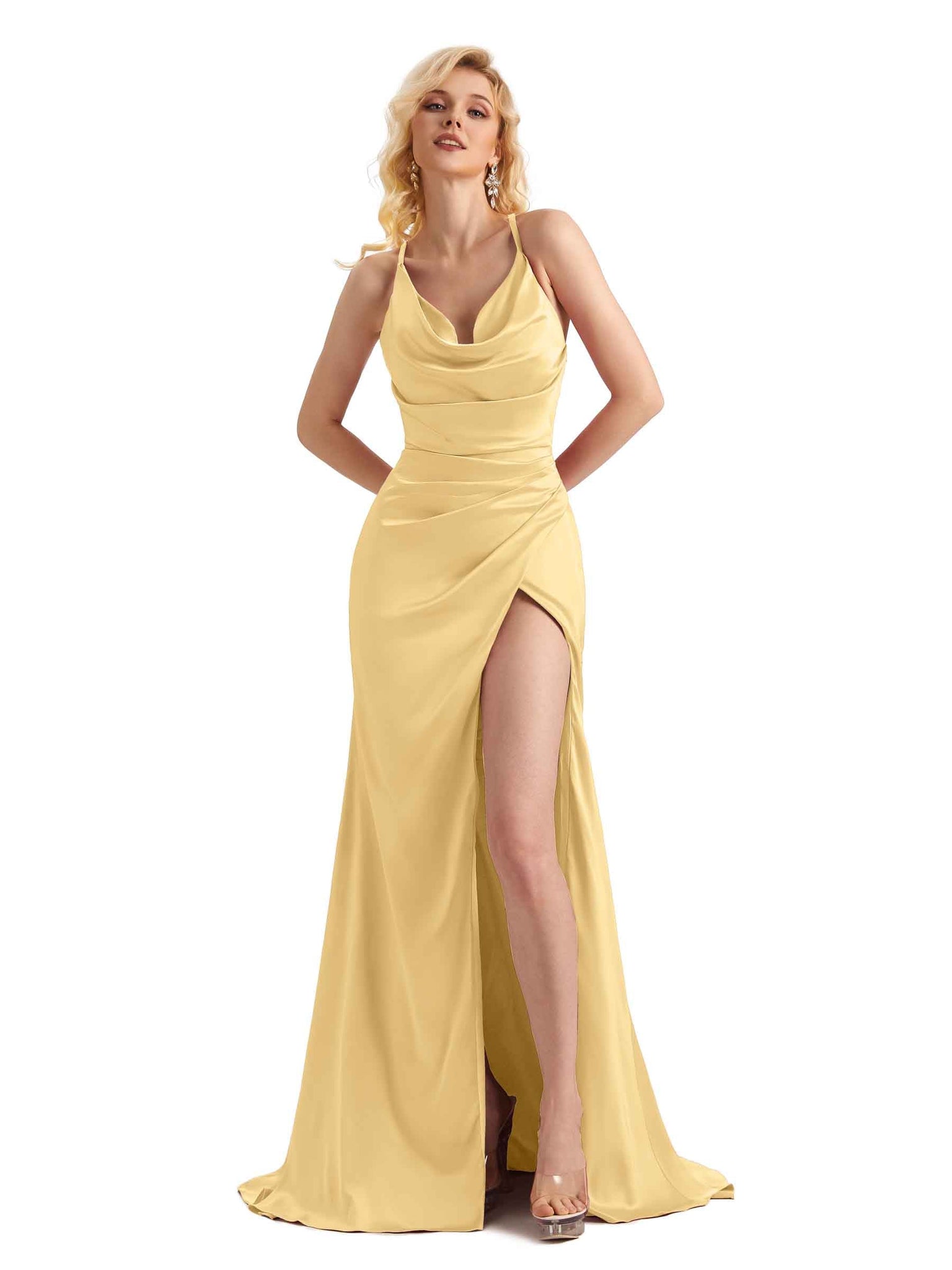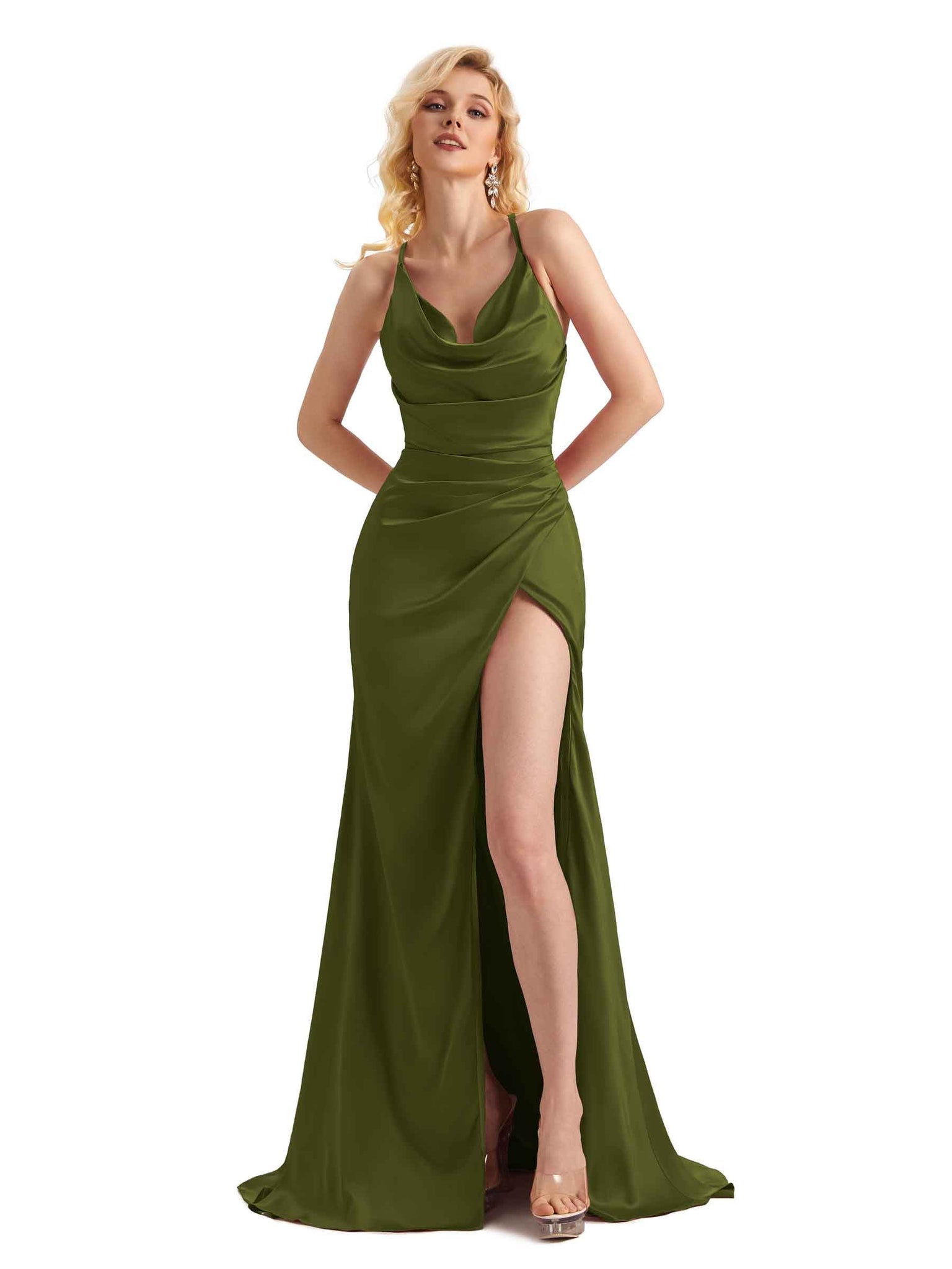 Sexy Cowl Neck Soft Satin Side Slit Criss Cross Long Mermaid Wedding Guest Dresses For Wedding