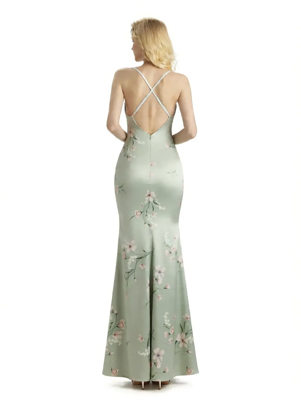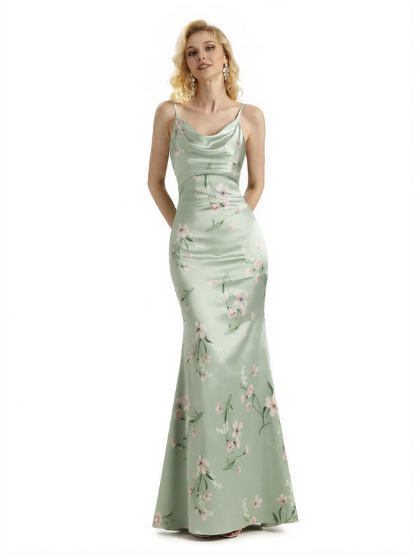 Sexy Jewel Spaghetti Straps Mermaid Long Satin Floral Formal Dresses For Women