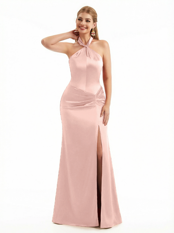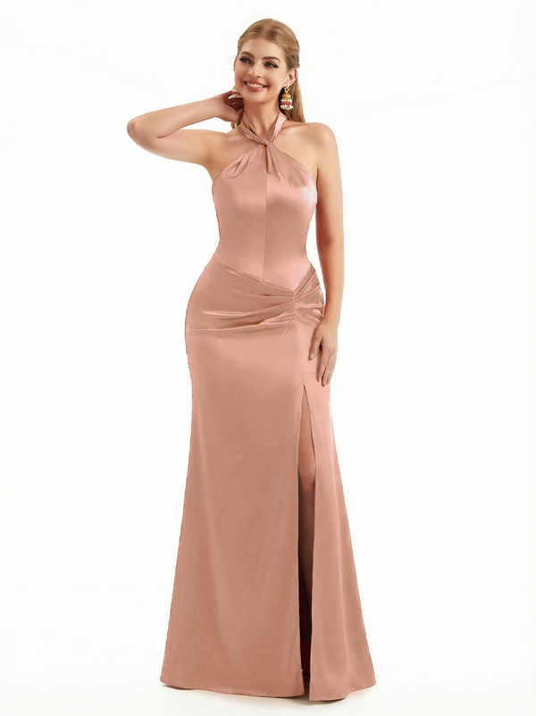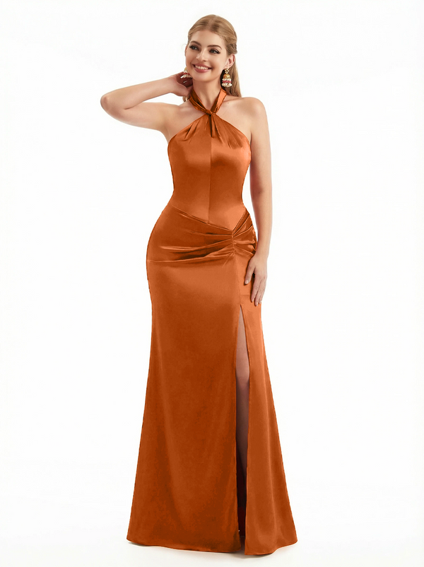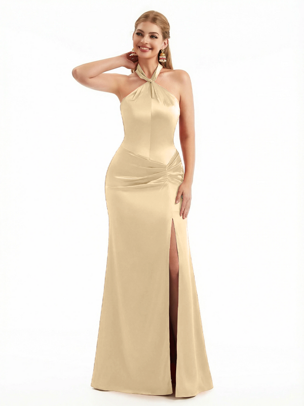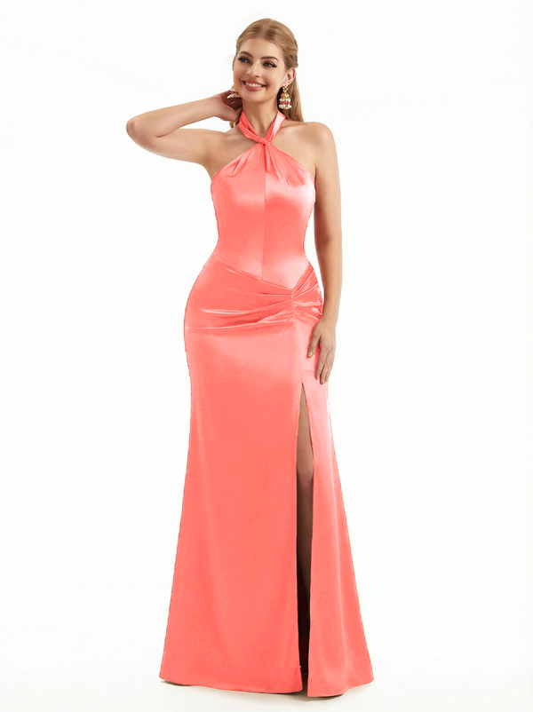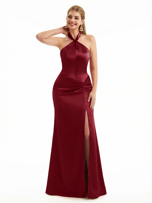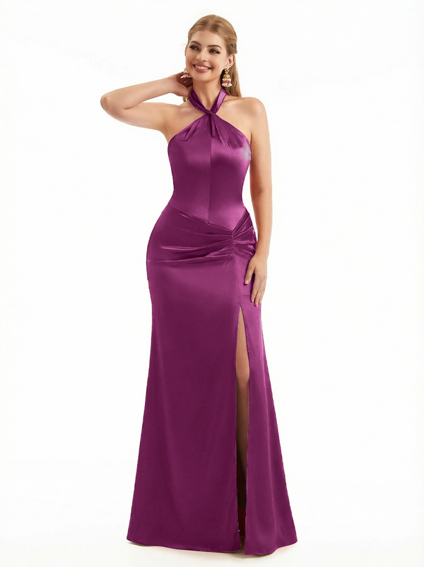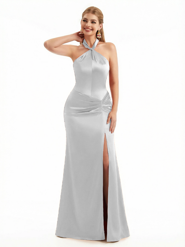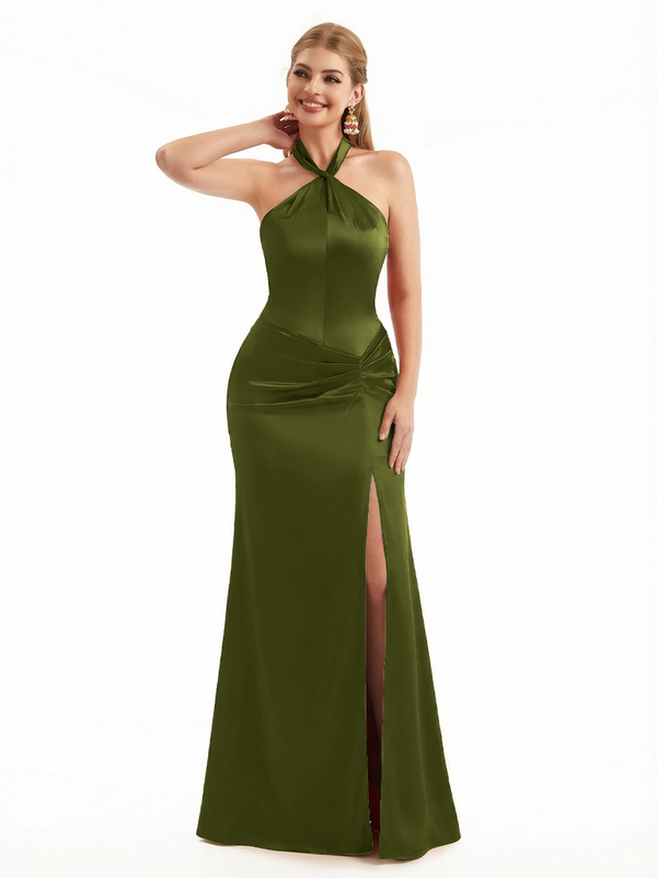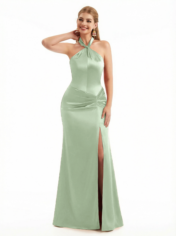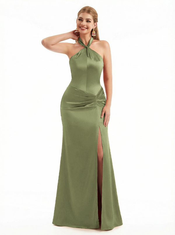 Sexy Mermaid Halter Ruching Side Slit Soft Satin Long Formal Dresses - ChicSew – ChicSew