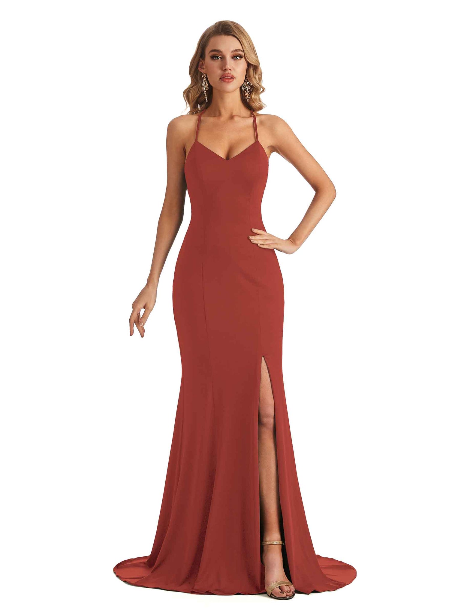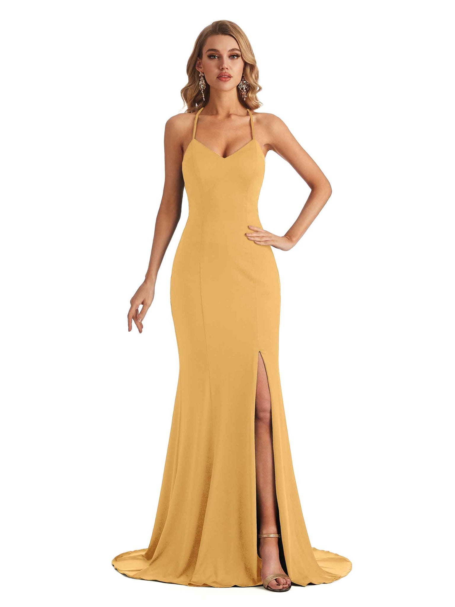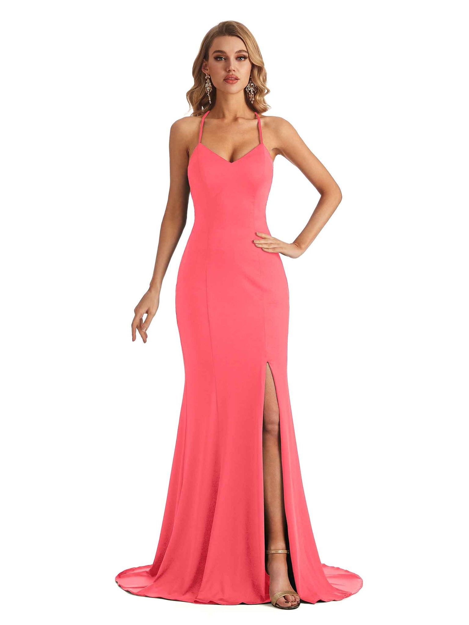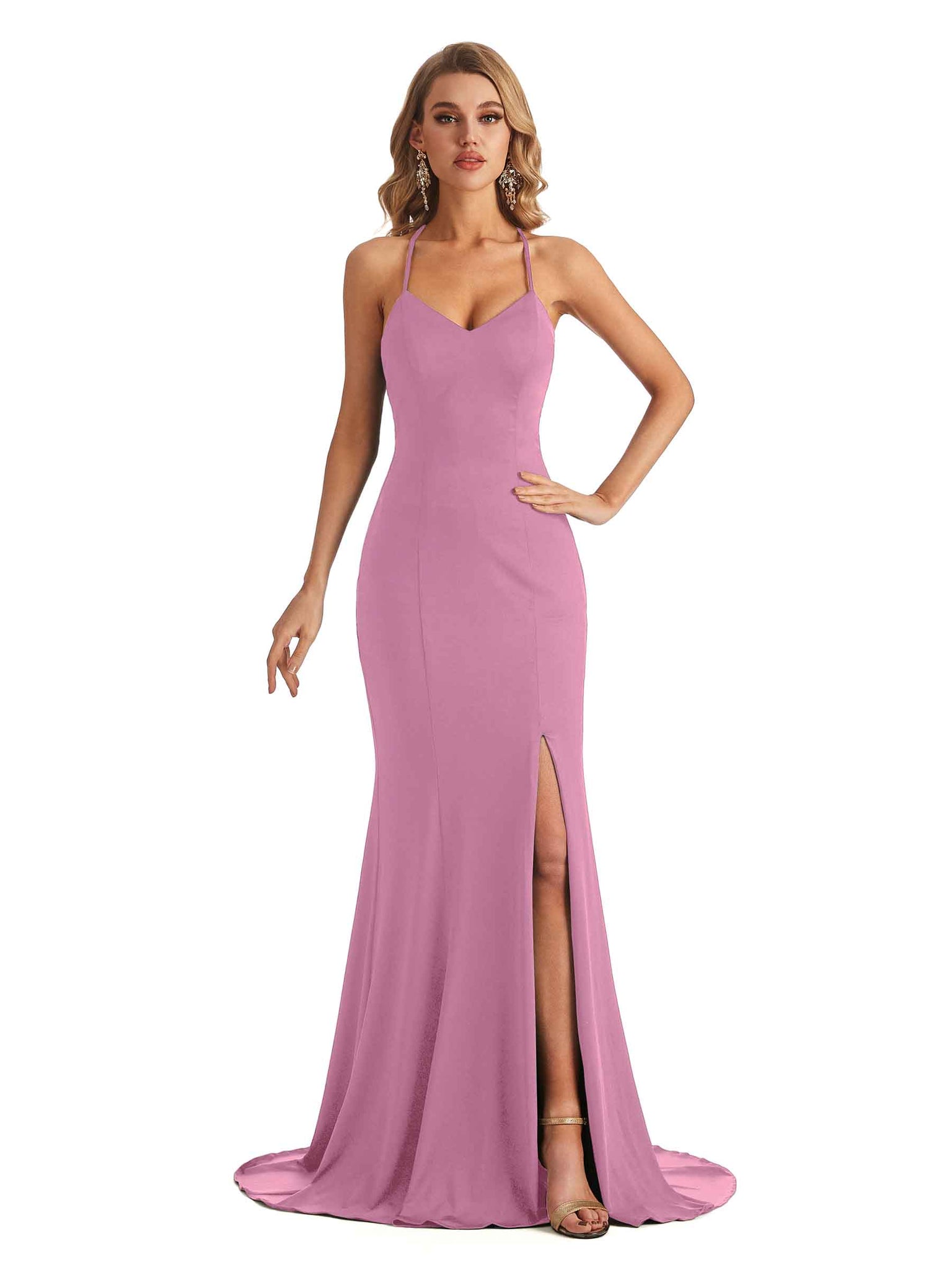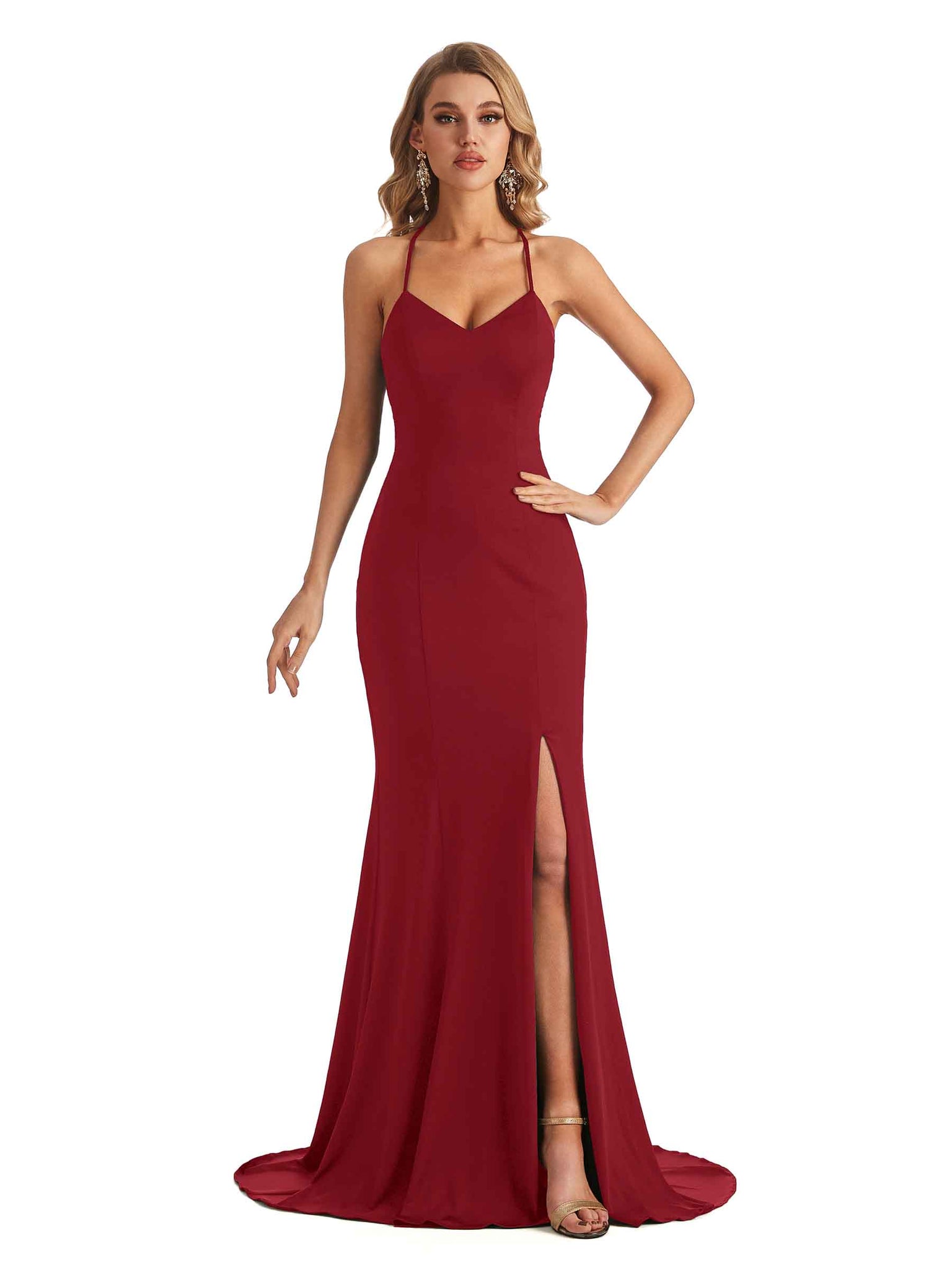 Sexy Mermaid Halter Side Slit Stretchy Jersey Long Formal Bridesmaid Dresses - ChicSew – ChicSew