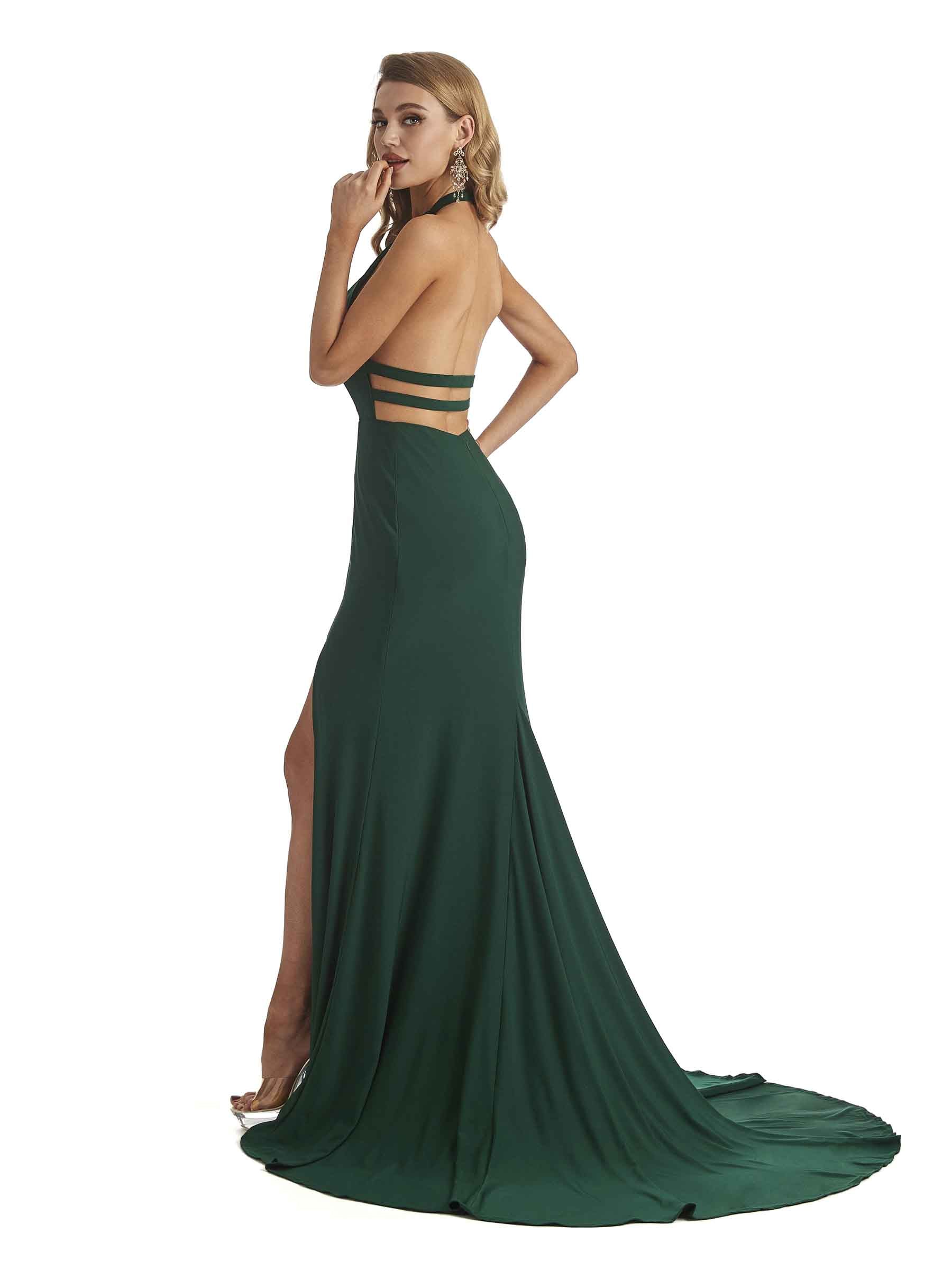 Sexy Mermaid Halter V-Neck Side Slit Stretchy Jersey Long Formal Bridesmaid Dresses- ChicSew – ChicSew