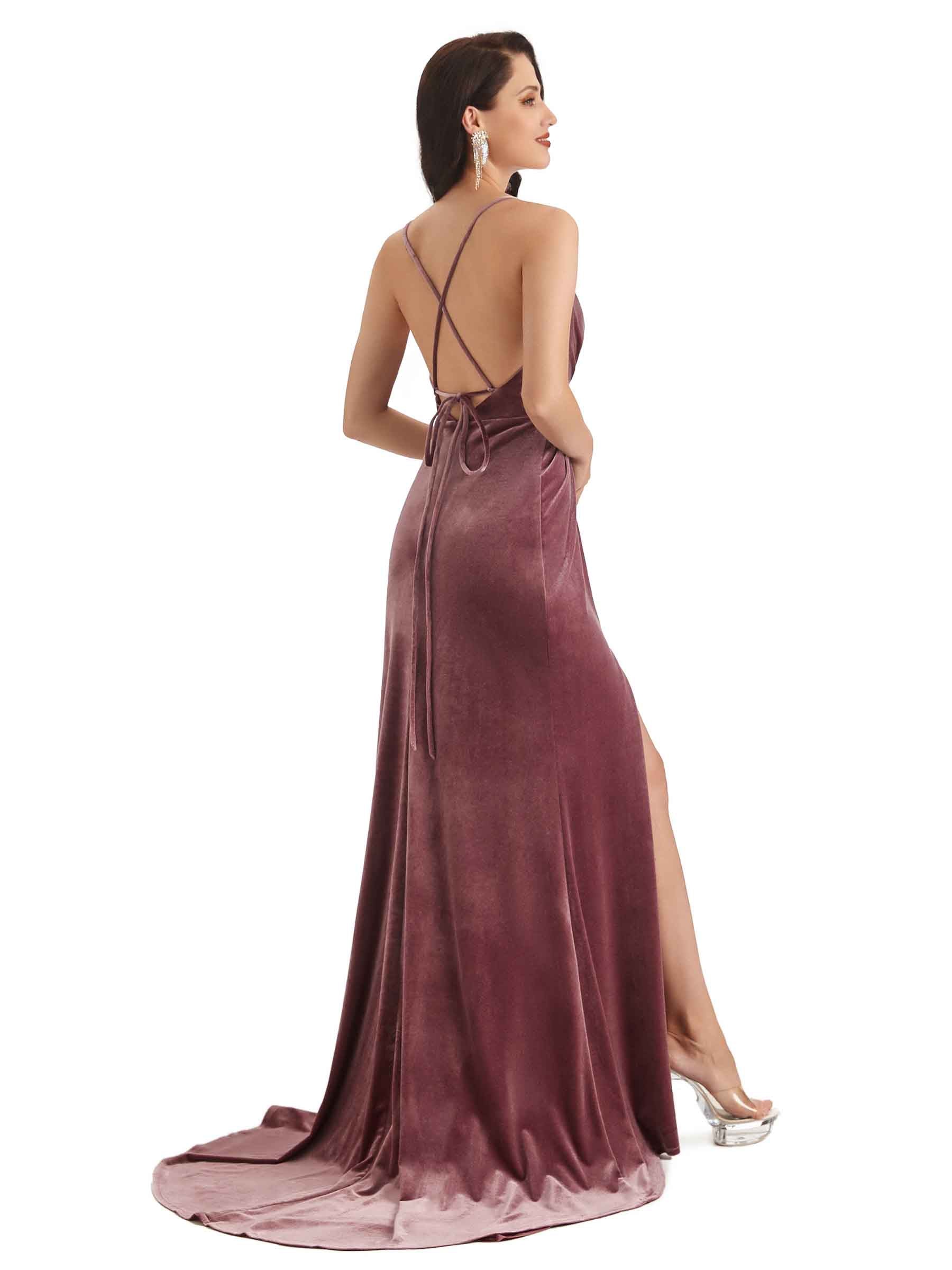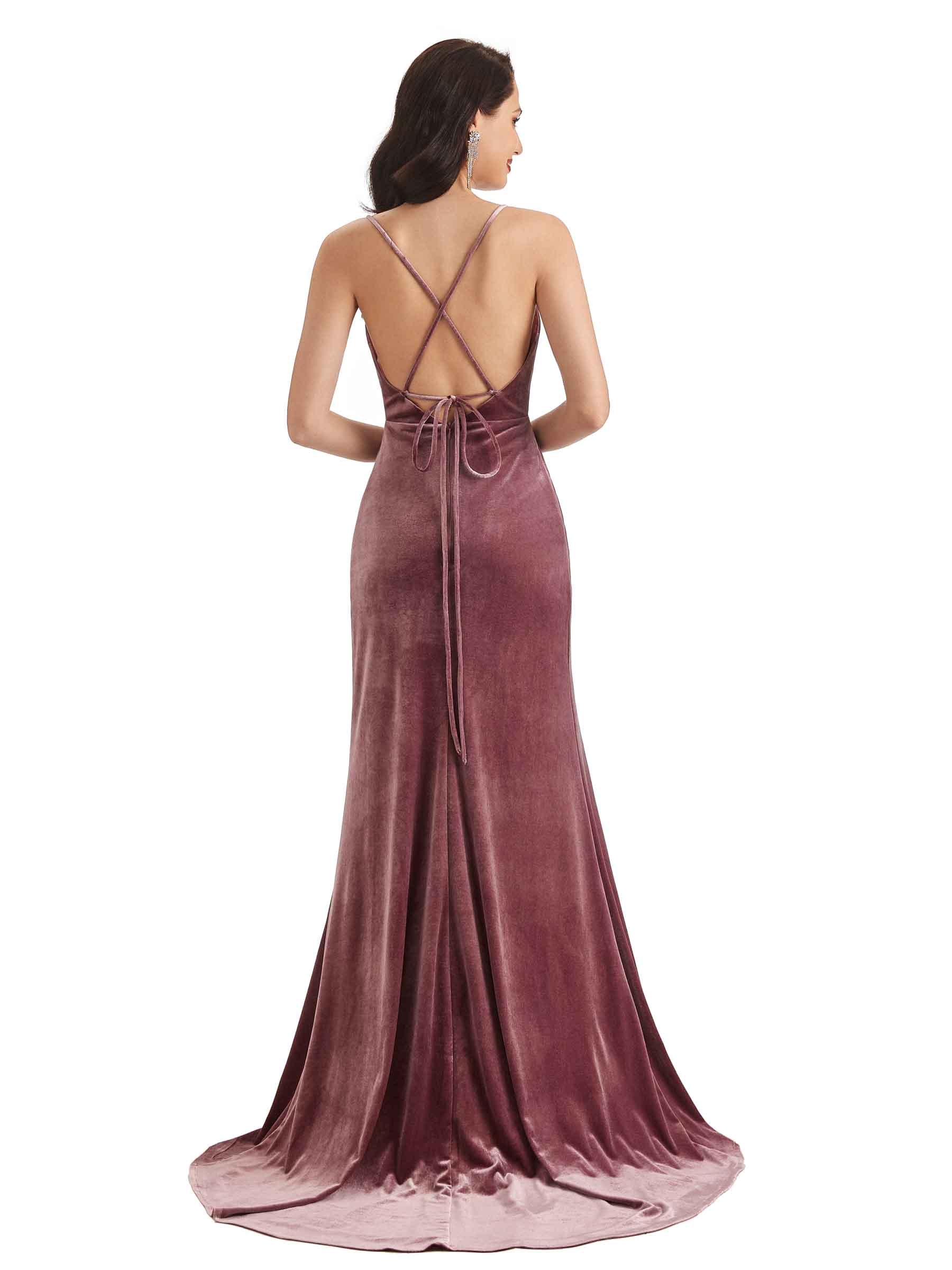 Sexy Mermaid Spaghetti Straps Backless Velvet Side Slit Long Bridesmaid Dresses - ChicSew – ChicSew