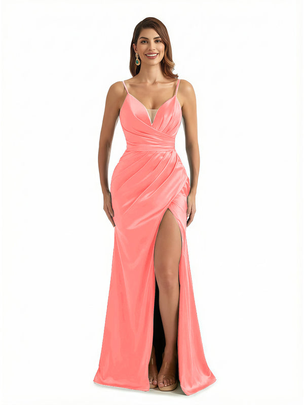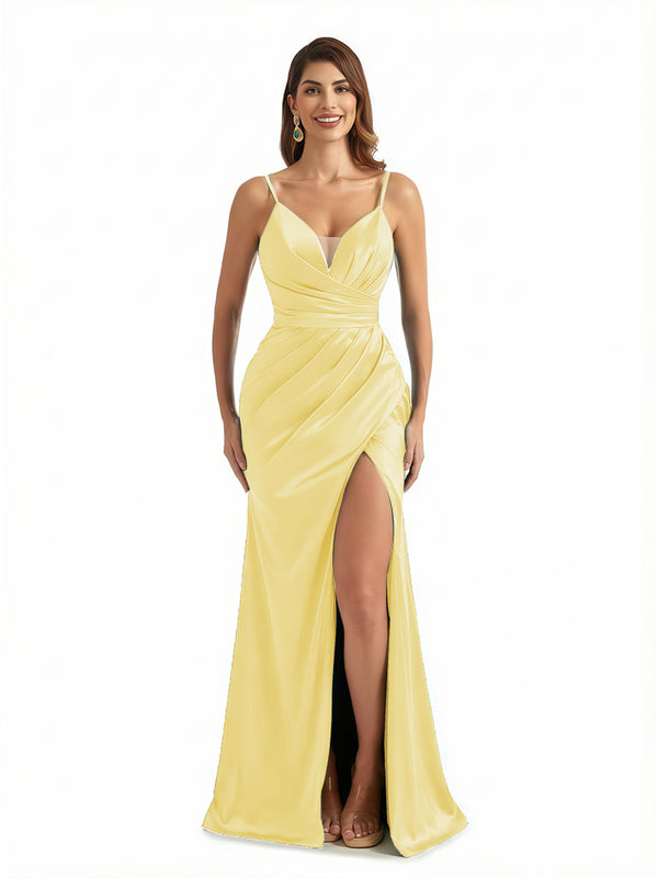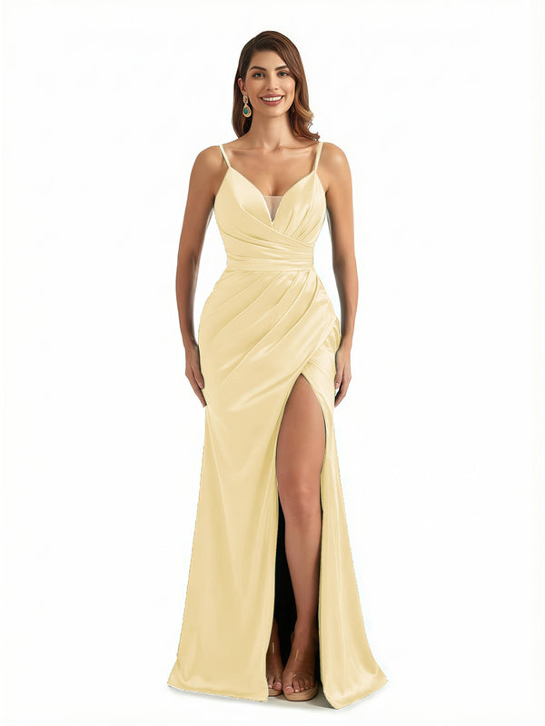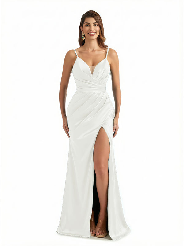 Sexy Mermaid Spaghetti Straps Side Slit Ruching Silky Satin Maxi Formal Evening Dresses For Women - ChicSew – ChicSew