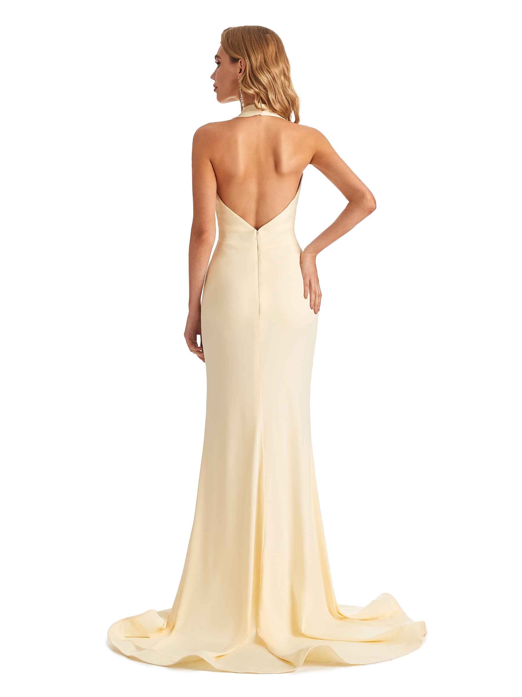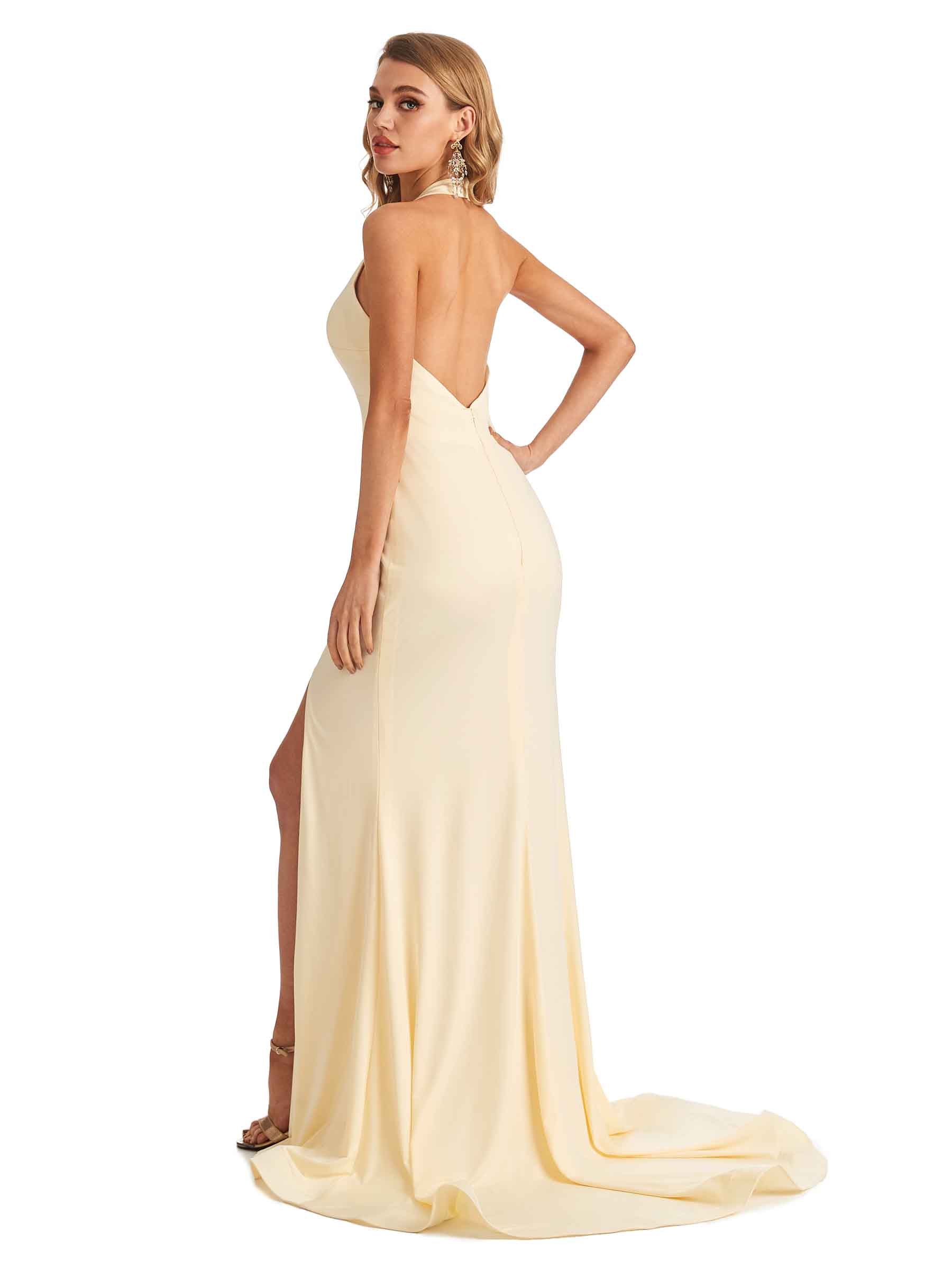 Sexy Backless Mermaid Halter Side Slit Stretchy Jersey Long Formal Bridesmaid Dresses