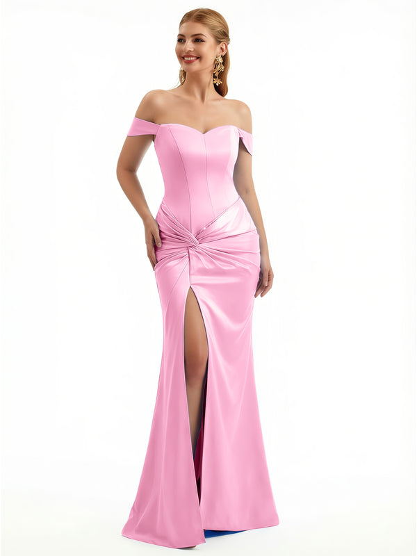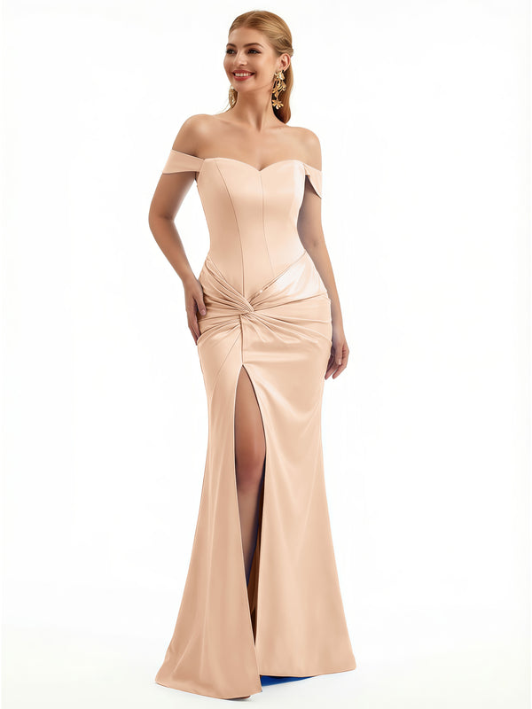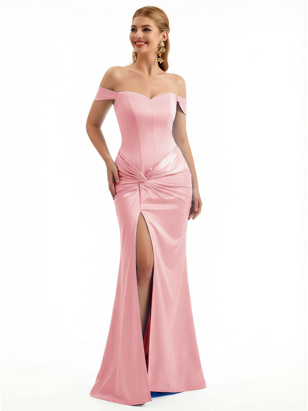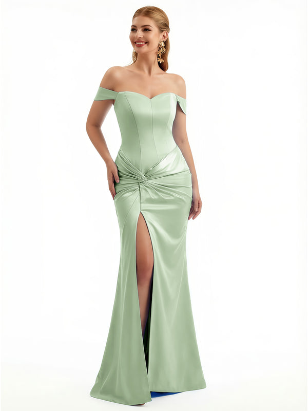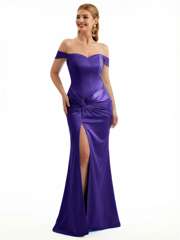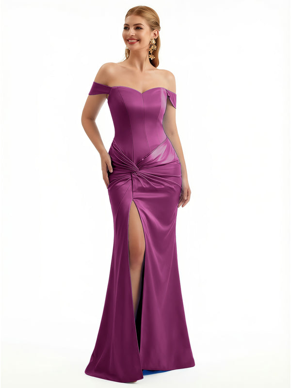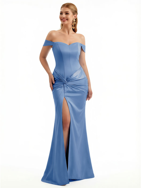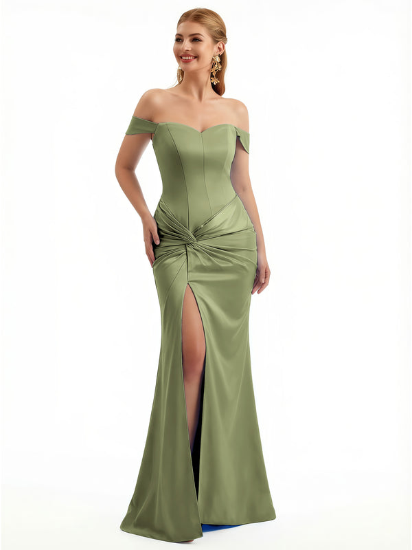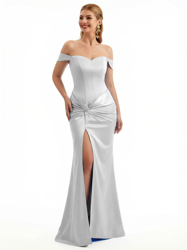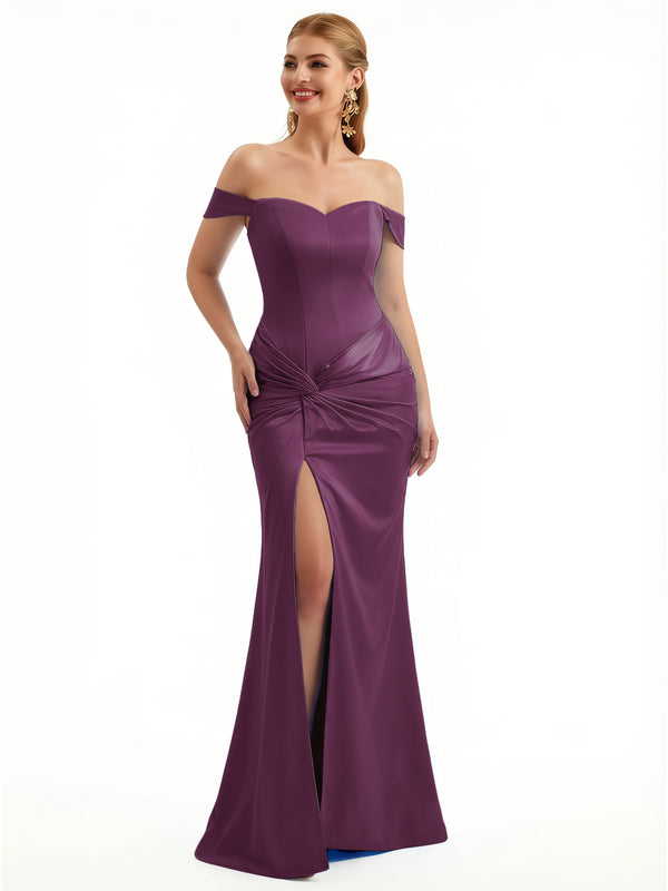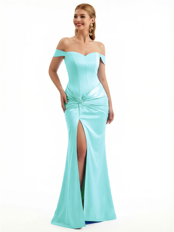 Sexy Off The Shoulder Mermaid Soft Satin Floor Length Evening Dresses Slit With Twist Knot