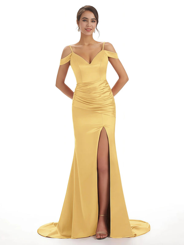 Sexy Cold Shoulder Soft Satin Side Split Long Mermaid Bridesmaid Dresses For Wedding