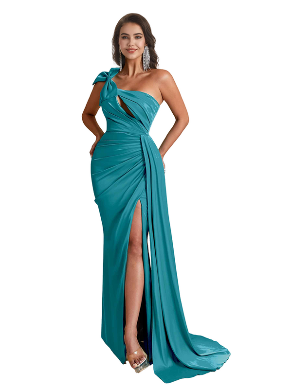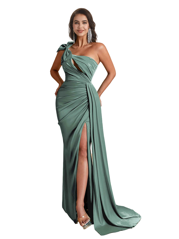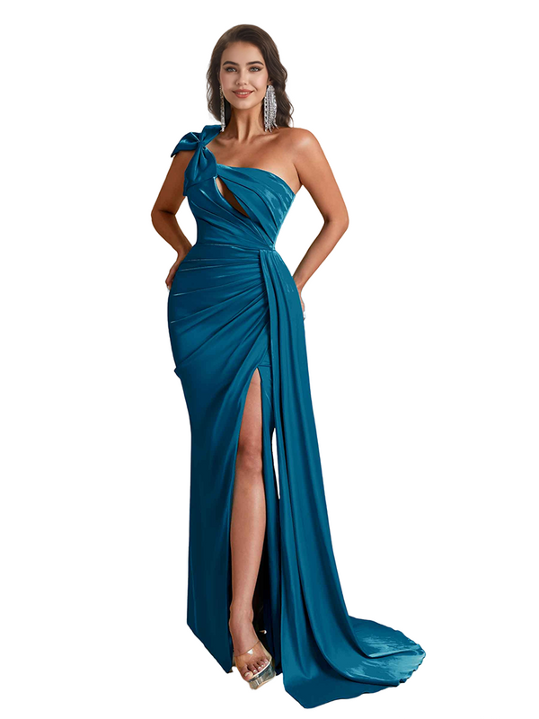 Sexy One Shoulder Bow Knot Side Split Mermaid Silky Satin Long Bridesmaid Dresses