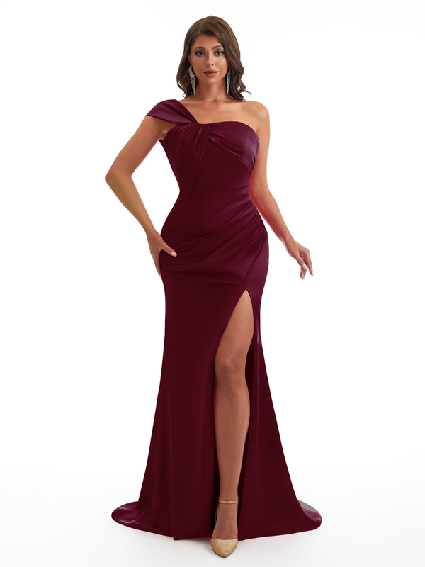 Sexy One Shoulder Side Slit Mermaid Soft Satin Long Bridesmaid Dresses Online - ChicSew – ChicSew