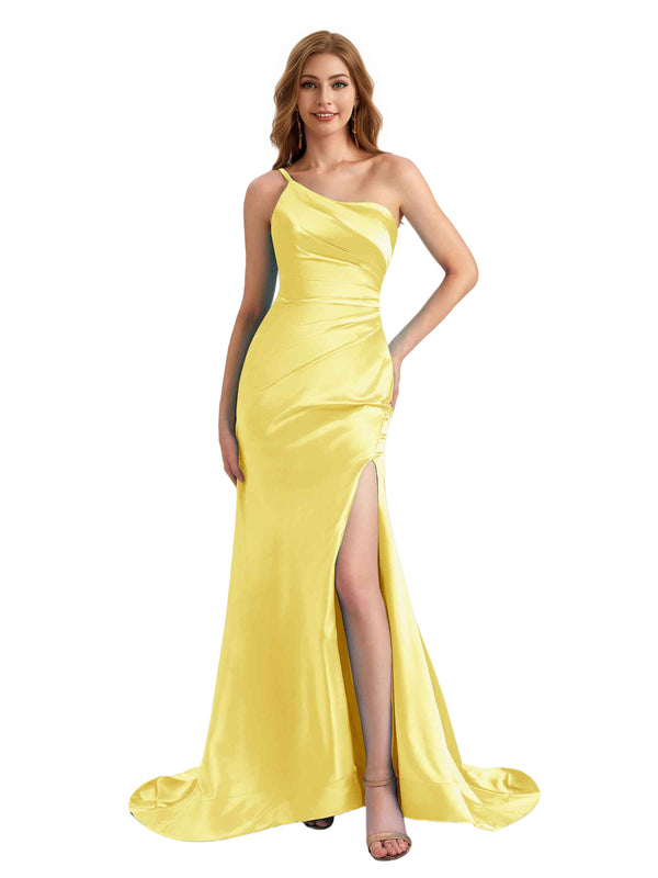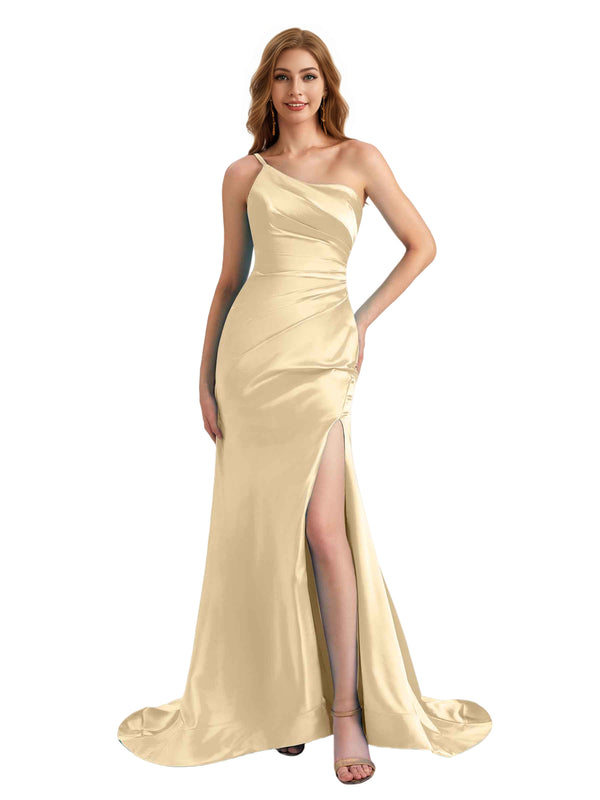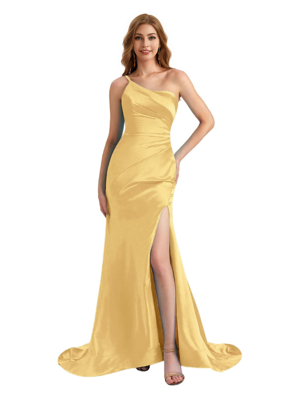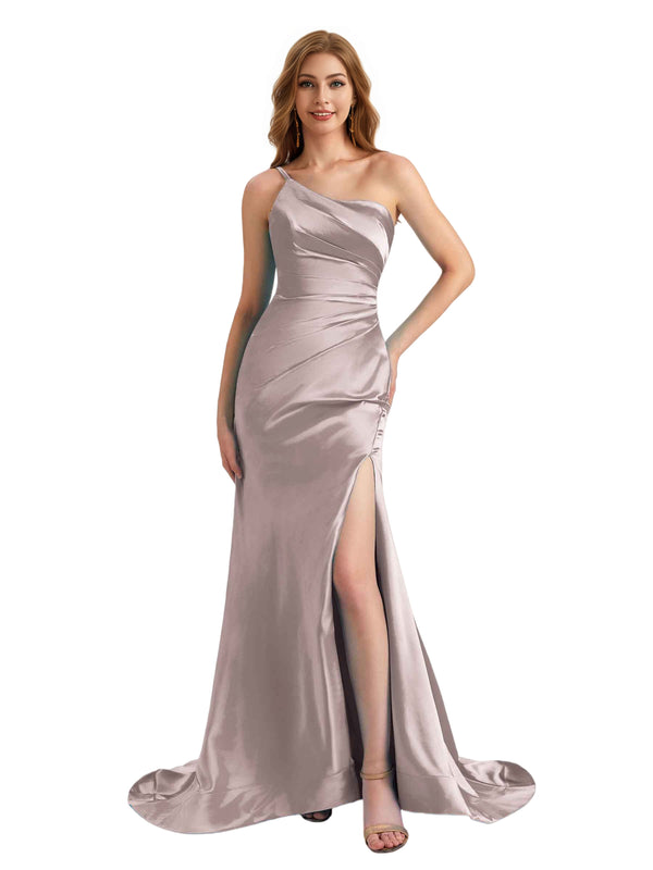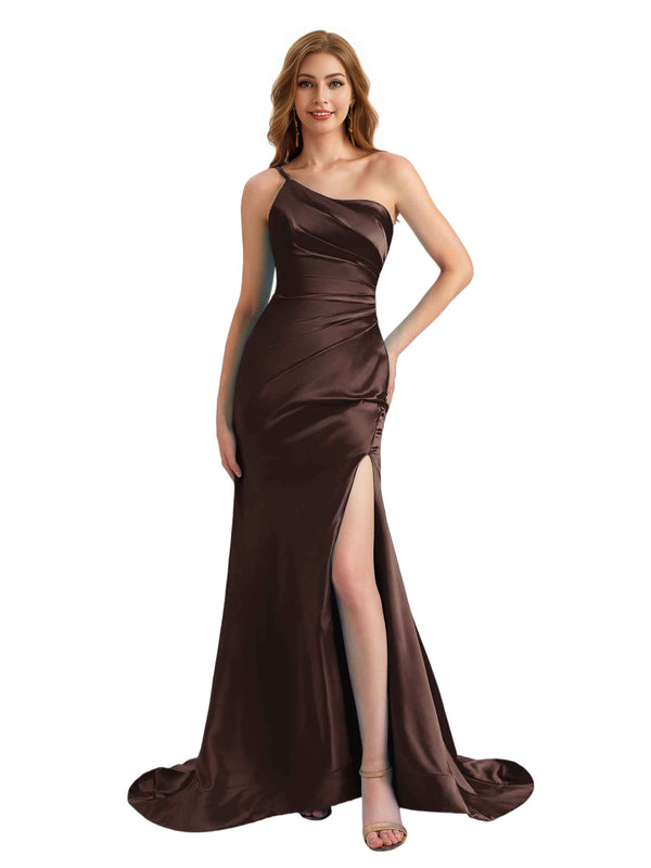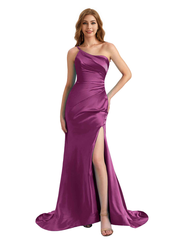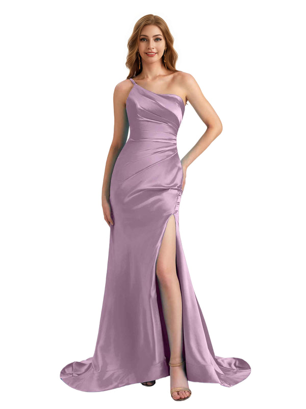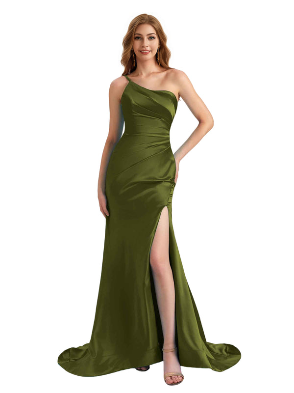 Sexy One Shoulder Side Split Ruched Soft Satin Mermaid Long Beauty Bridesmaid Dresses - ChicSew – ChicSew