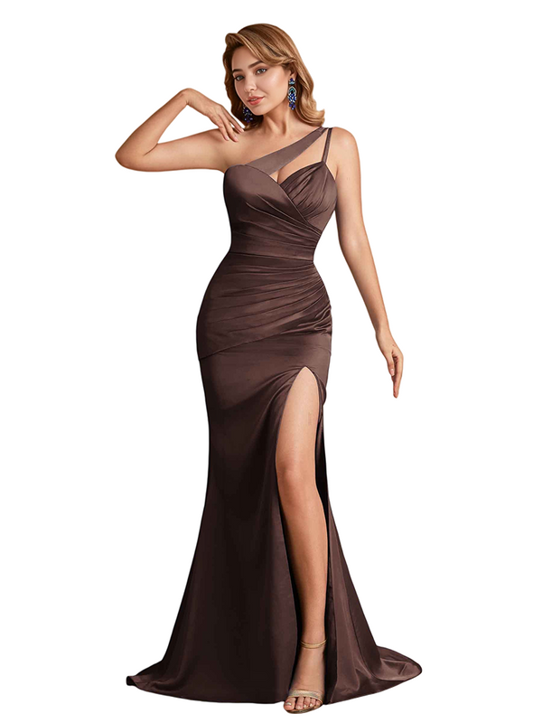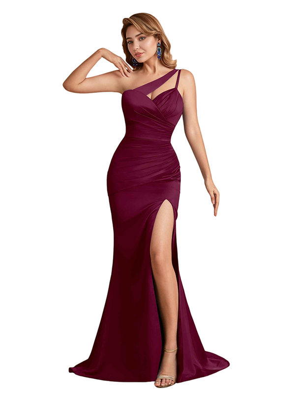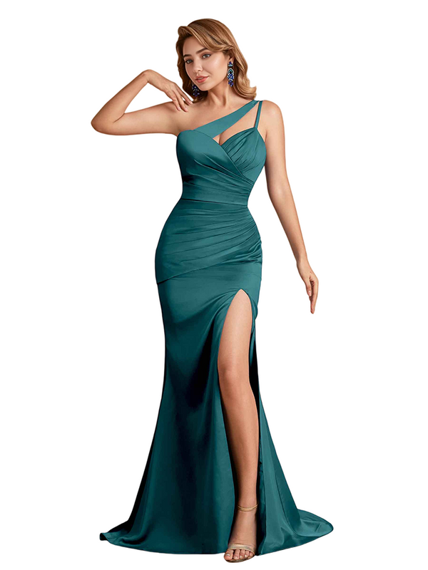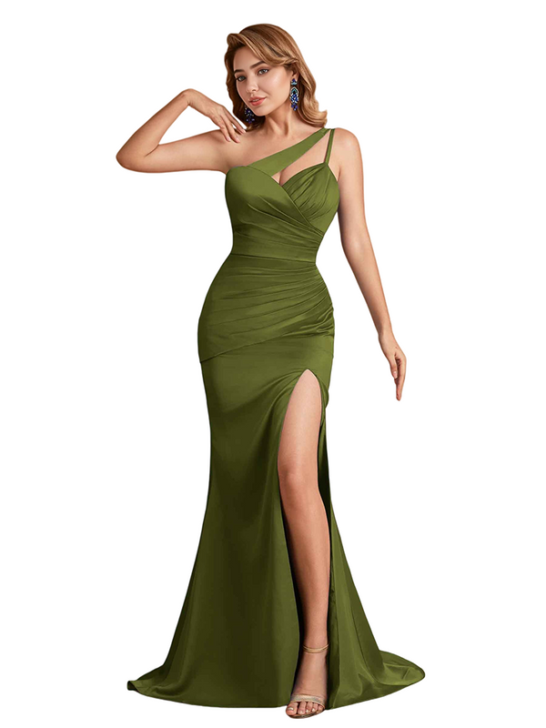 Sexy One Shoulder Silky Satin Mermaid Pleated Side Slit Long Bridesmaid Dresses Online