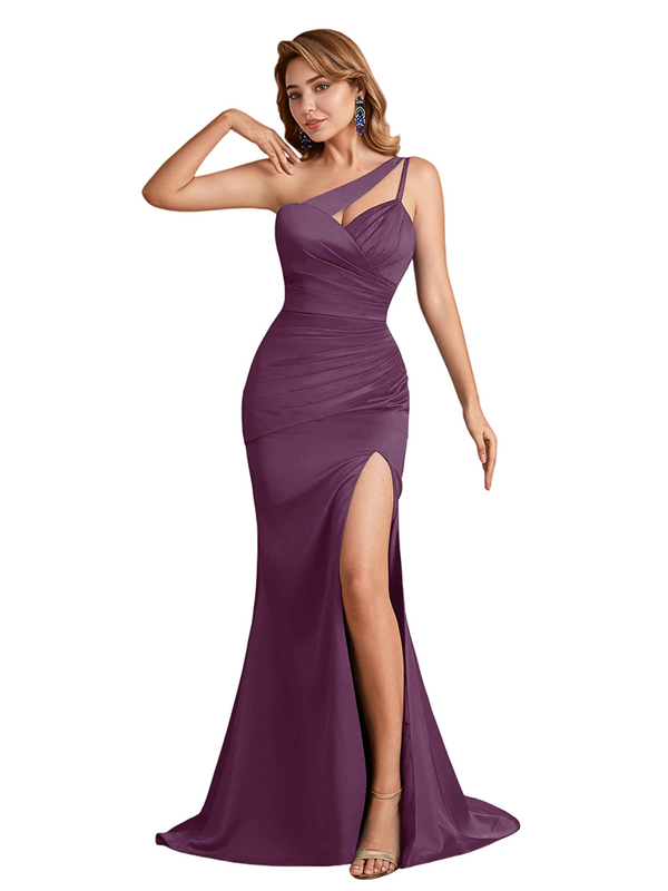Sexy One Shoulder Silky Satin Mermaid Pleated Side Slit Long Bridesmaid Dresses Online $139.99