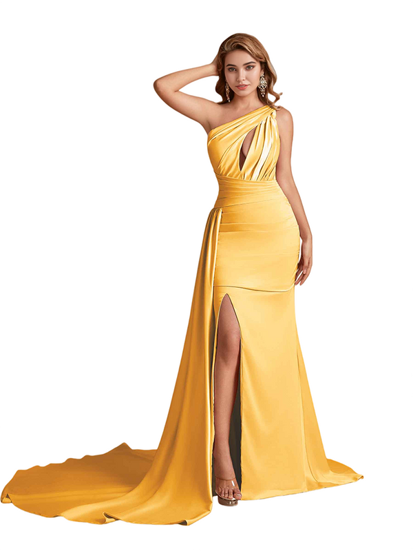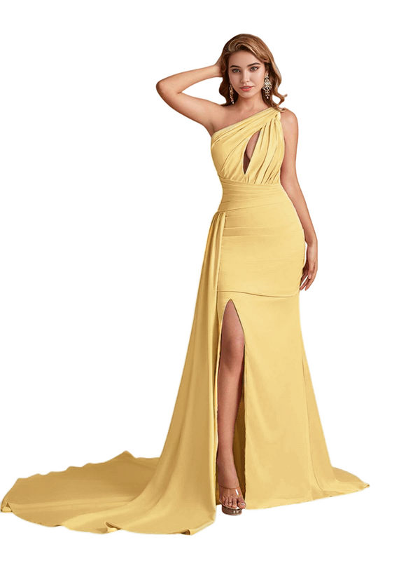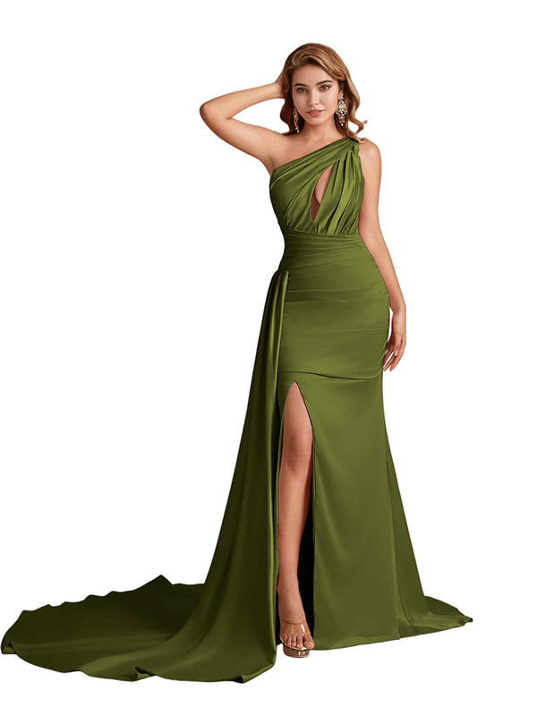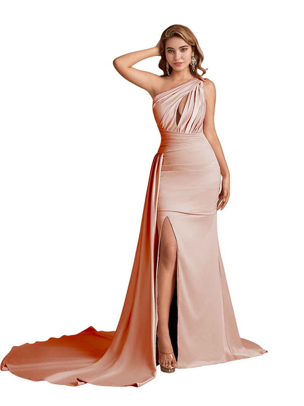 Sexy One Shoulder Soft Satin Mermaid Side Slit Pretty Long Bridesmaid Dresses Online - ChicSew – ChicSew