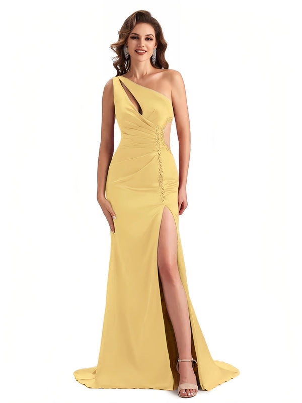 Sexy Side Slit Mermaid Soft Satin One Shoulder Long Bridesmaid Dresses - ChicSew – ChicSew