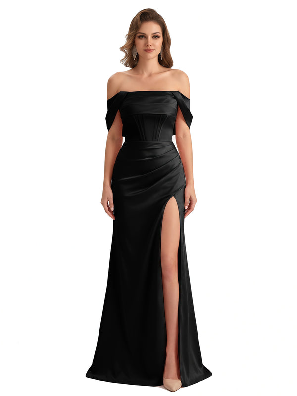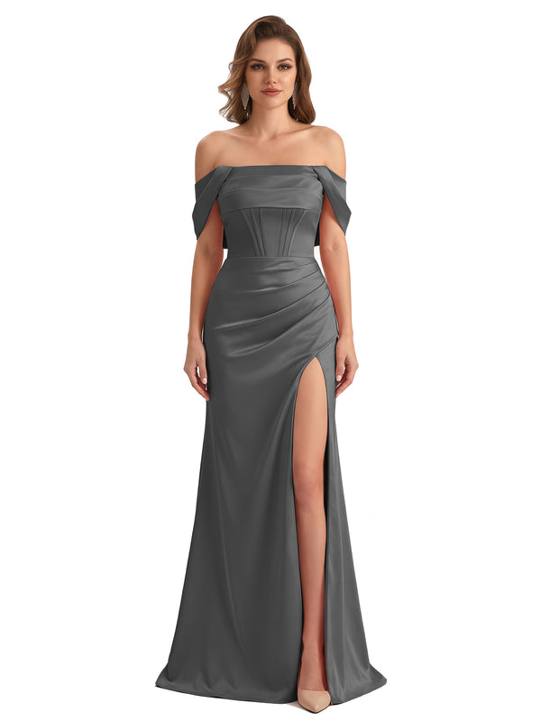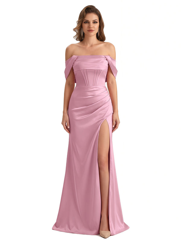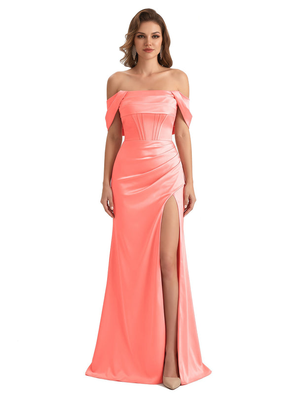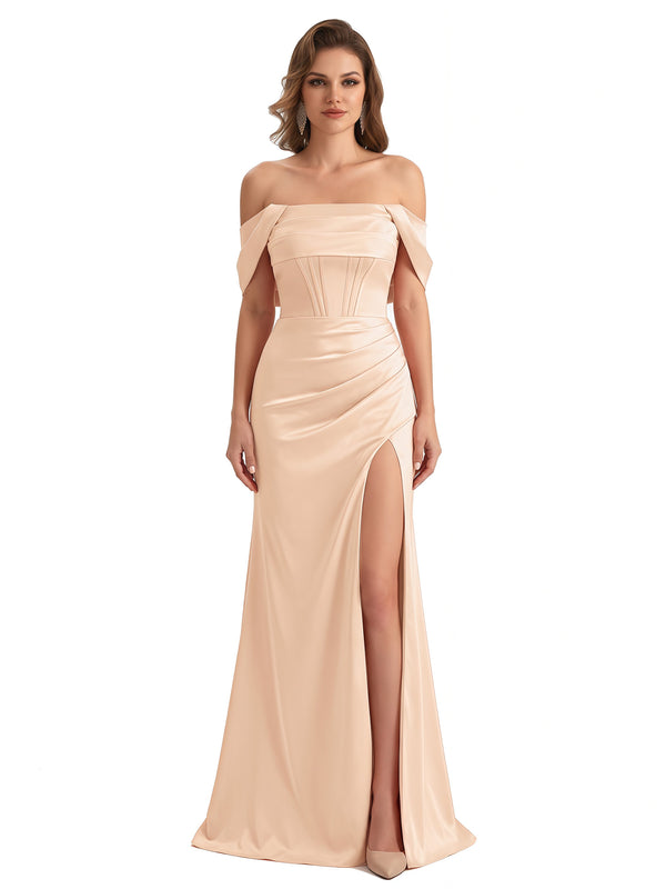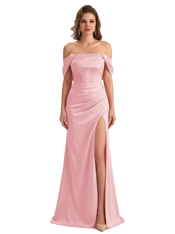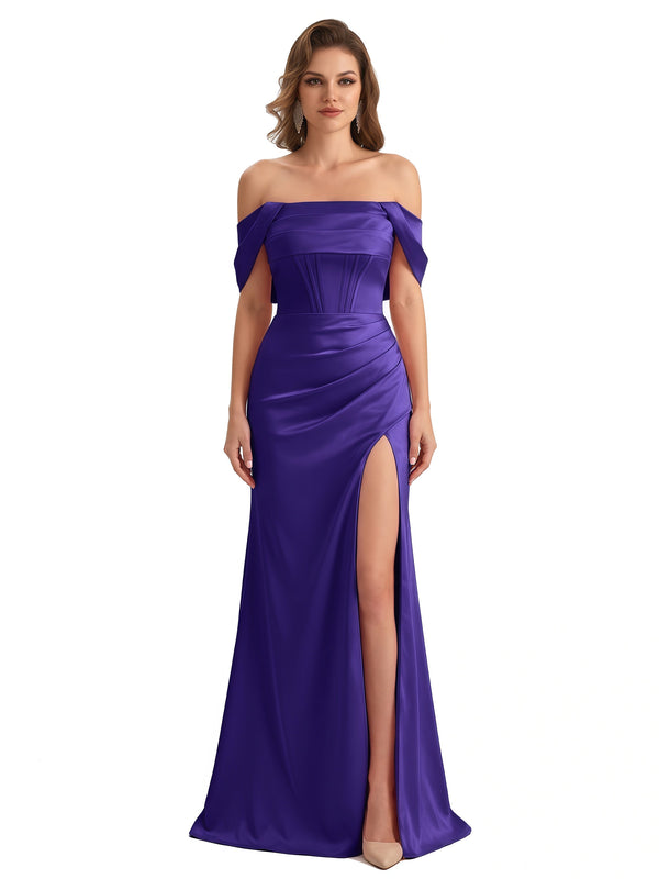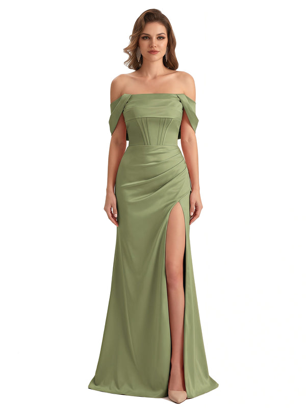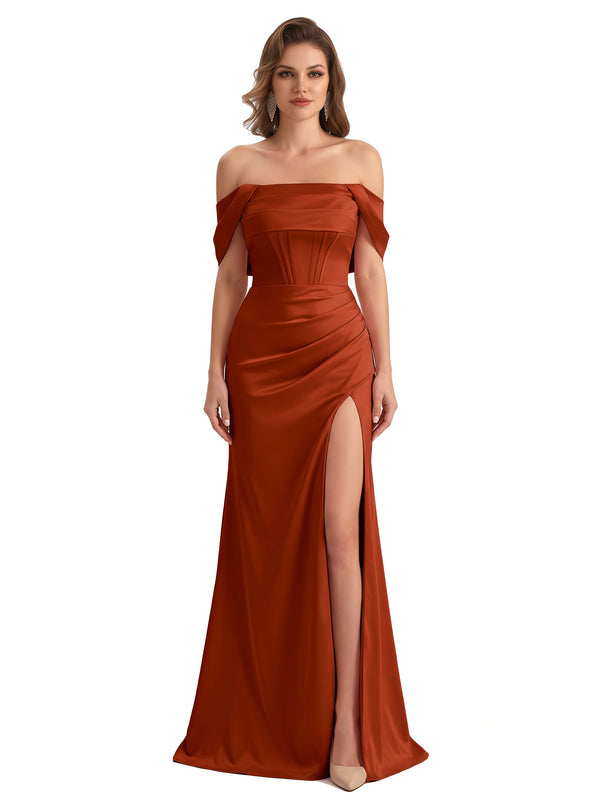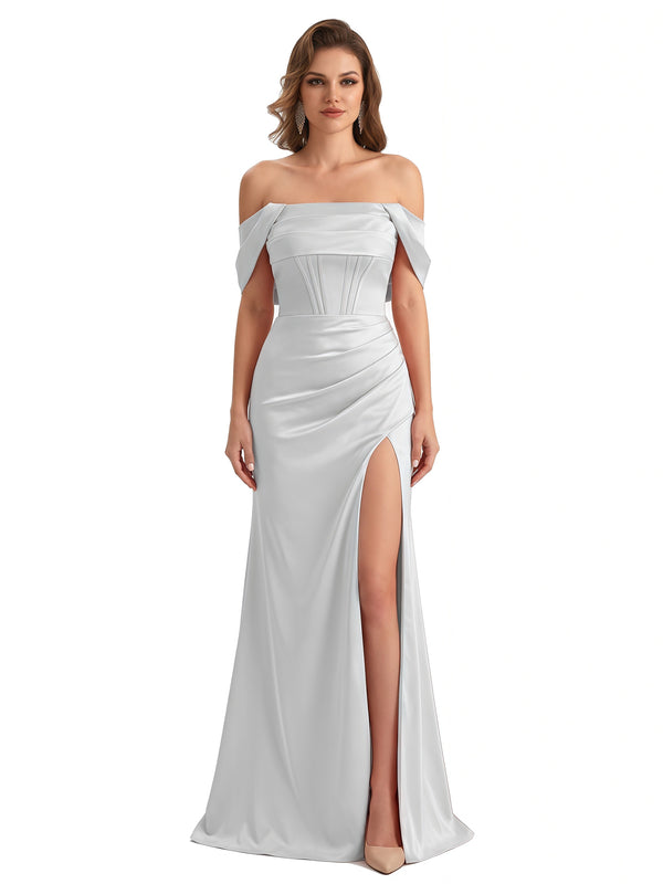 Sexy Off The Shoulder Silky Satin Mermaid Maxi Formal Dresses For Women With Boning Slit