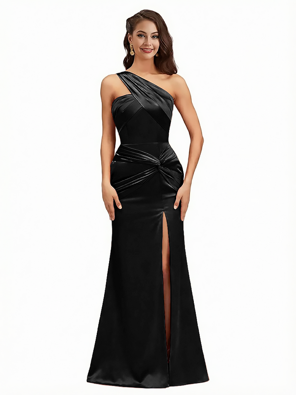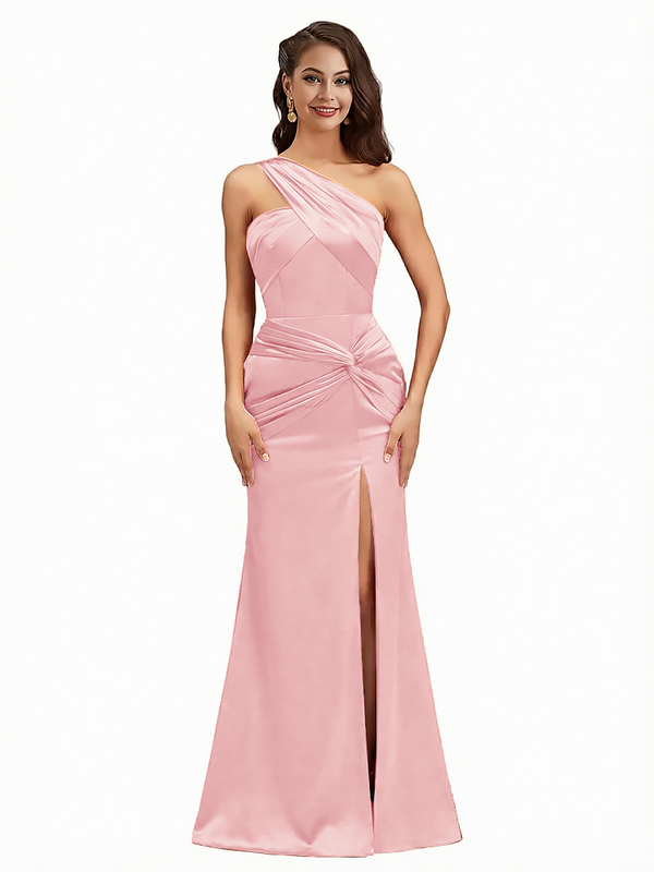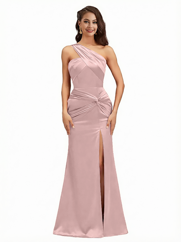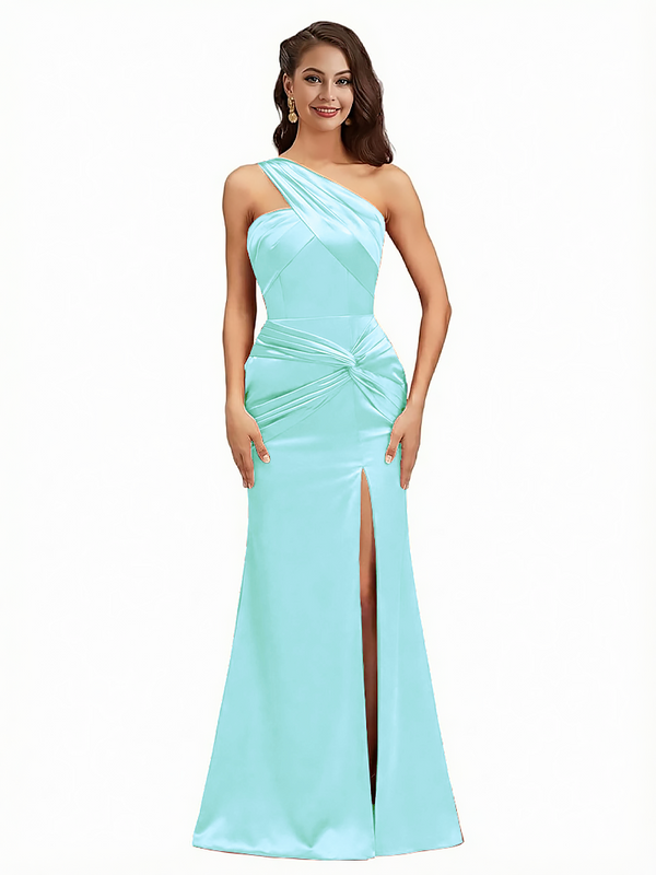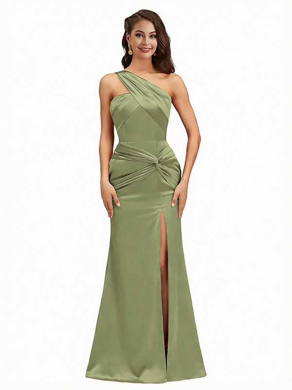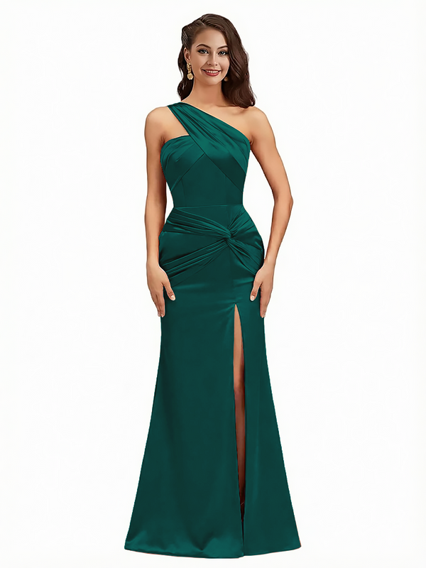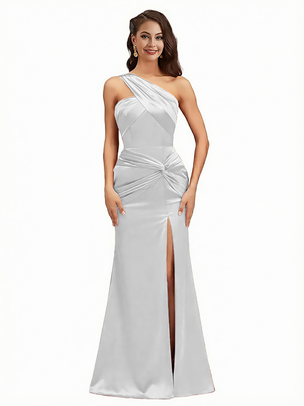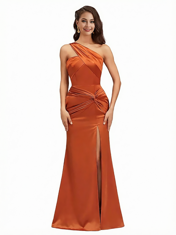 Sexy Side Slit One Shoulder Satin Mermaid Maxi Evening Gowns For Women With Twisted Knot
