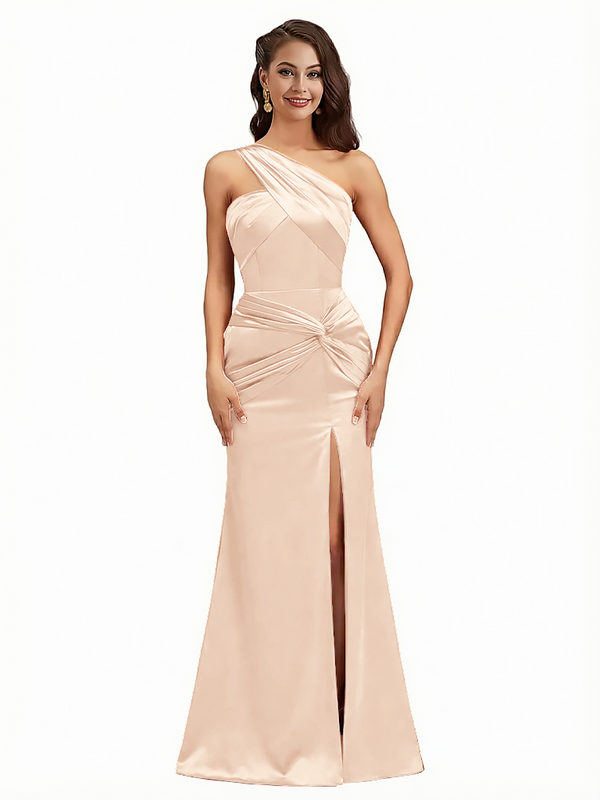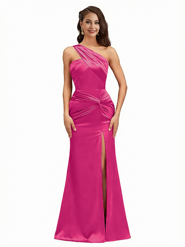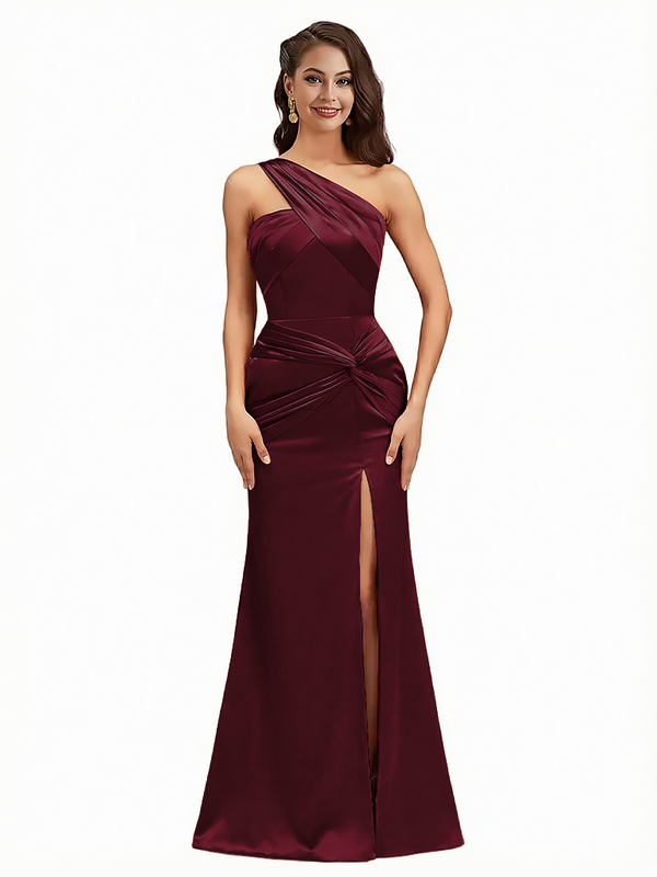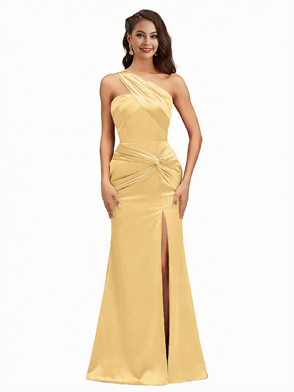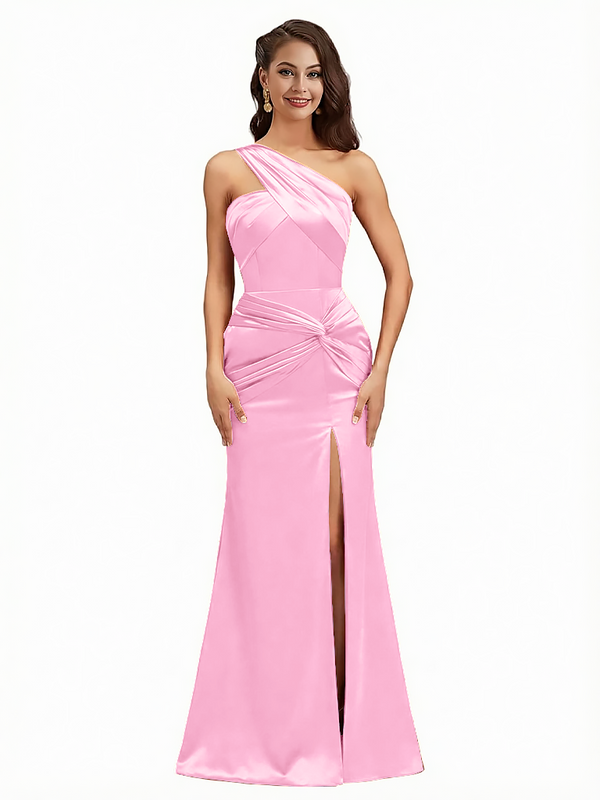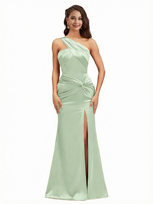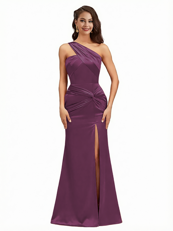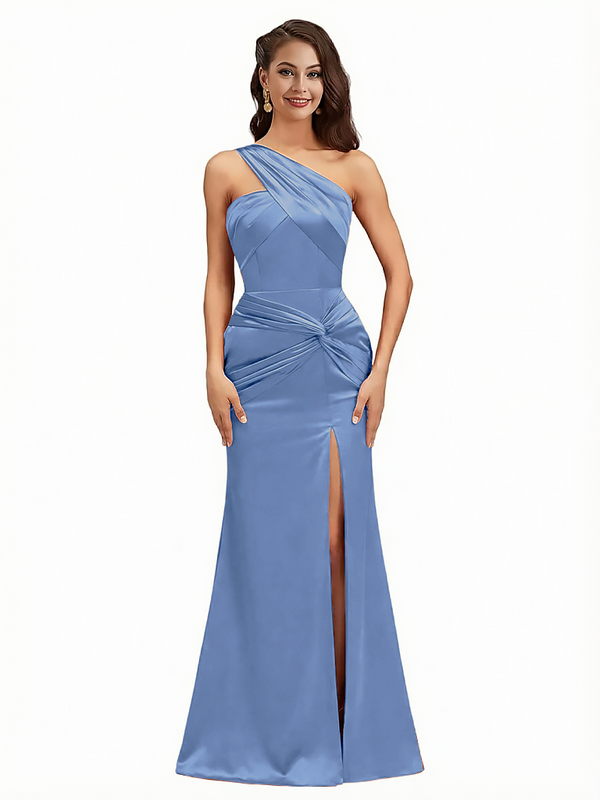 Sexy Side Slit One Shoulder Satin Mermaid Maxi Evening Gowns For Women With Twisted Knot