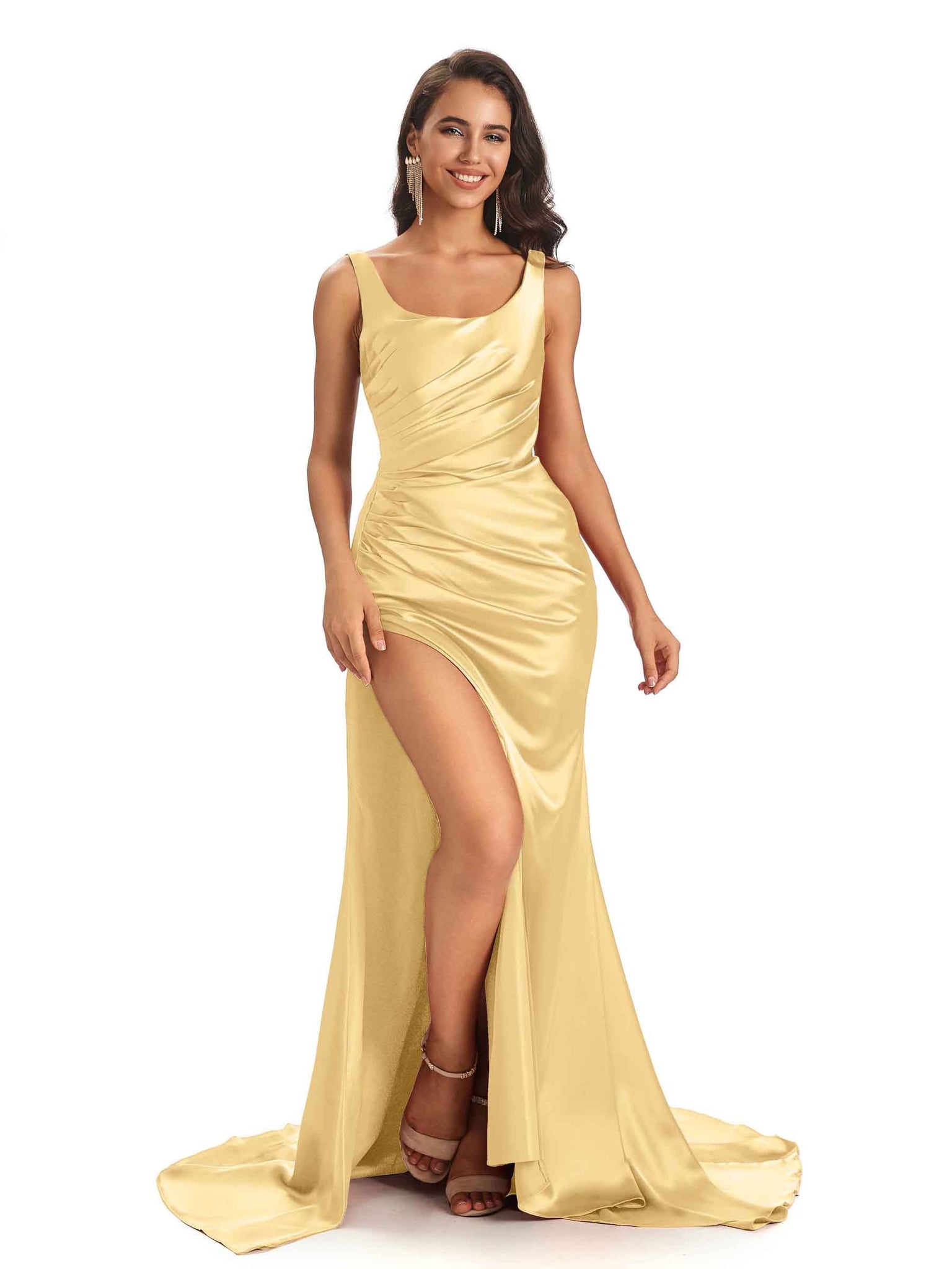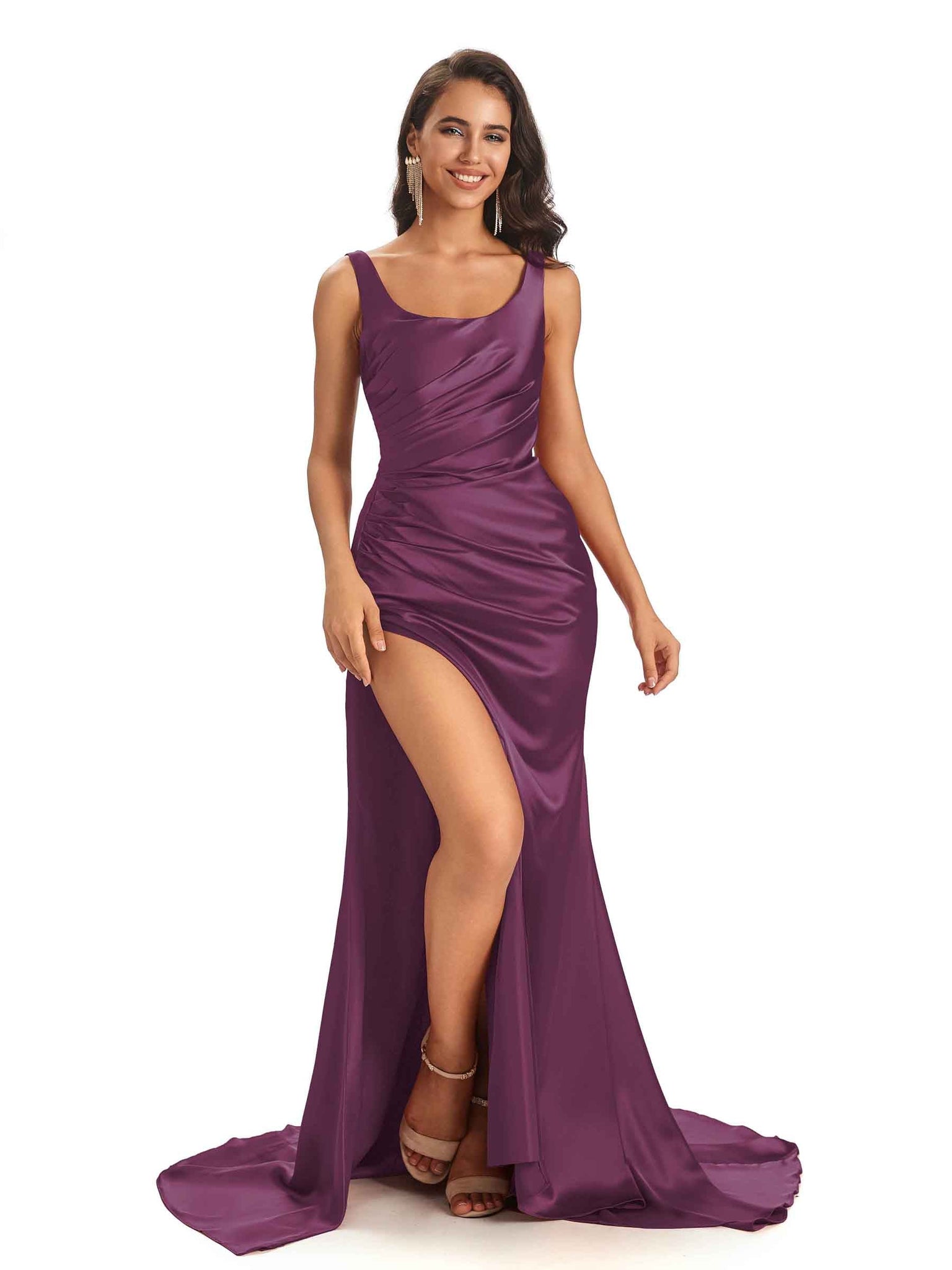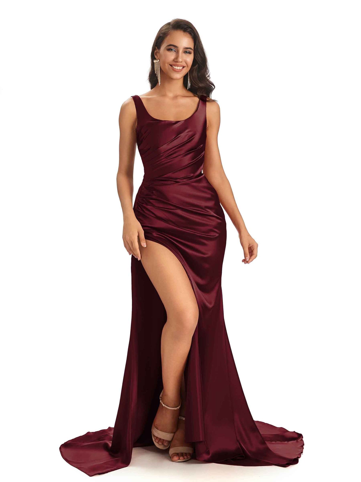 Sexy Side Slit Scoop Mermaid Long Stretch Satin Bridesmaid Dresses Online - ChicSew – ChicSew
