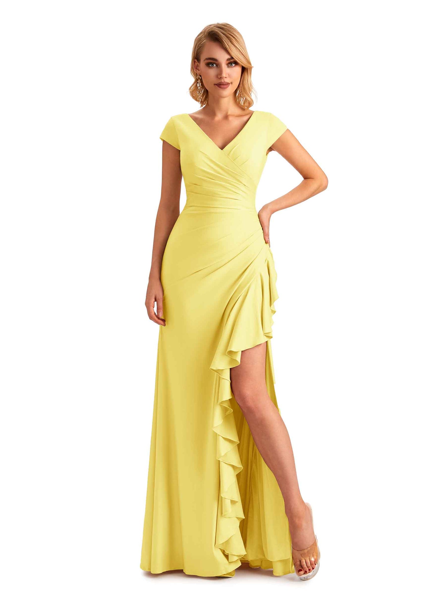 Sexy Side Slit Short Sleeves Mermaid Soft Satin Unique Long Maid of Honor Dresses- ChicSew – ChicSew