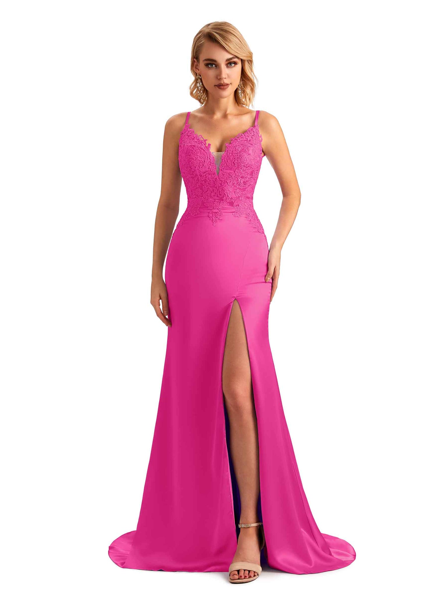 Sexy Side Slit Spaghetti Straps Lace Mermaid Unique Satin Maxi Dress For Wedding