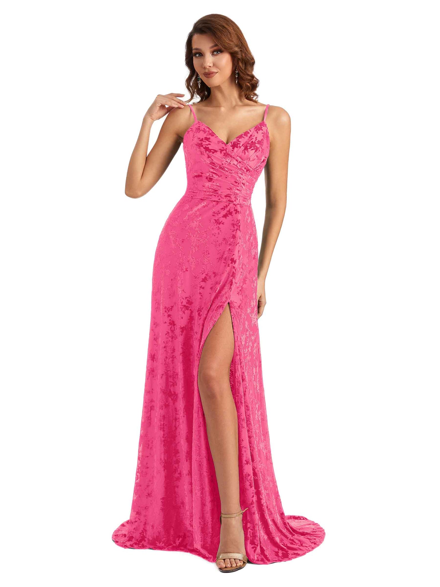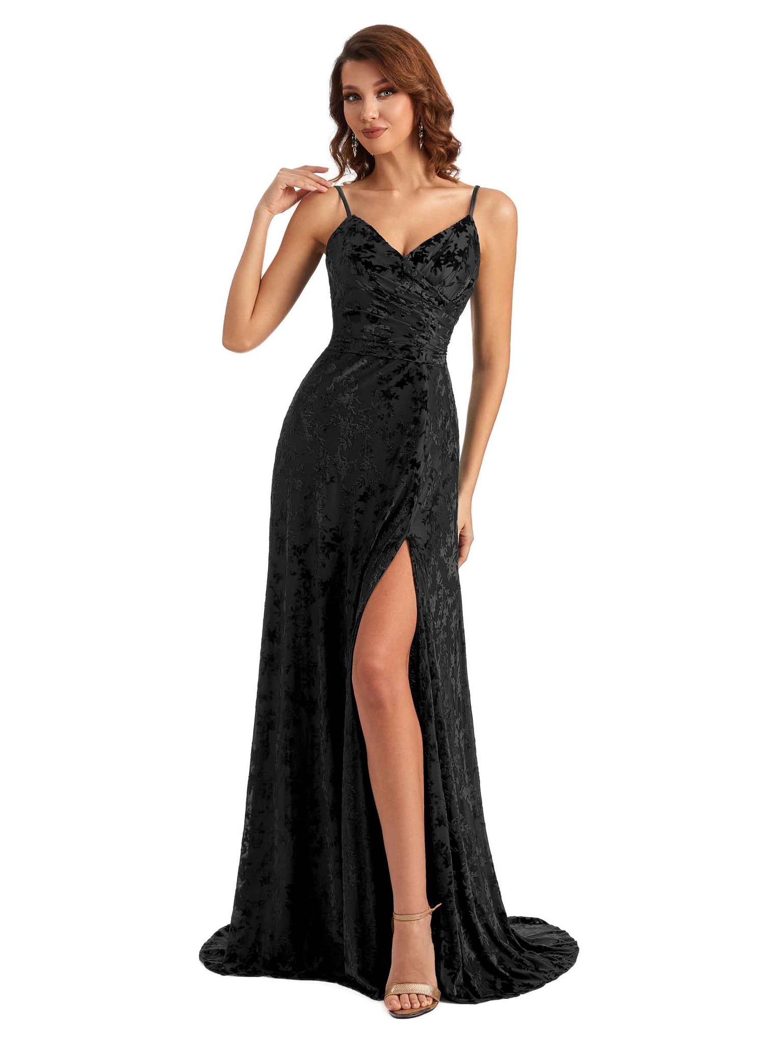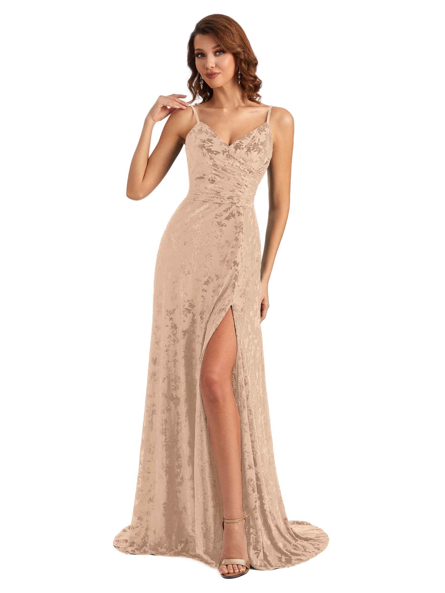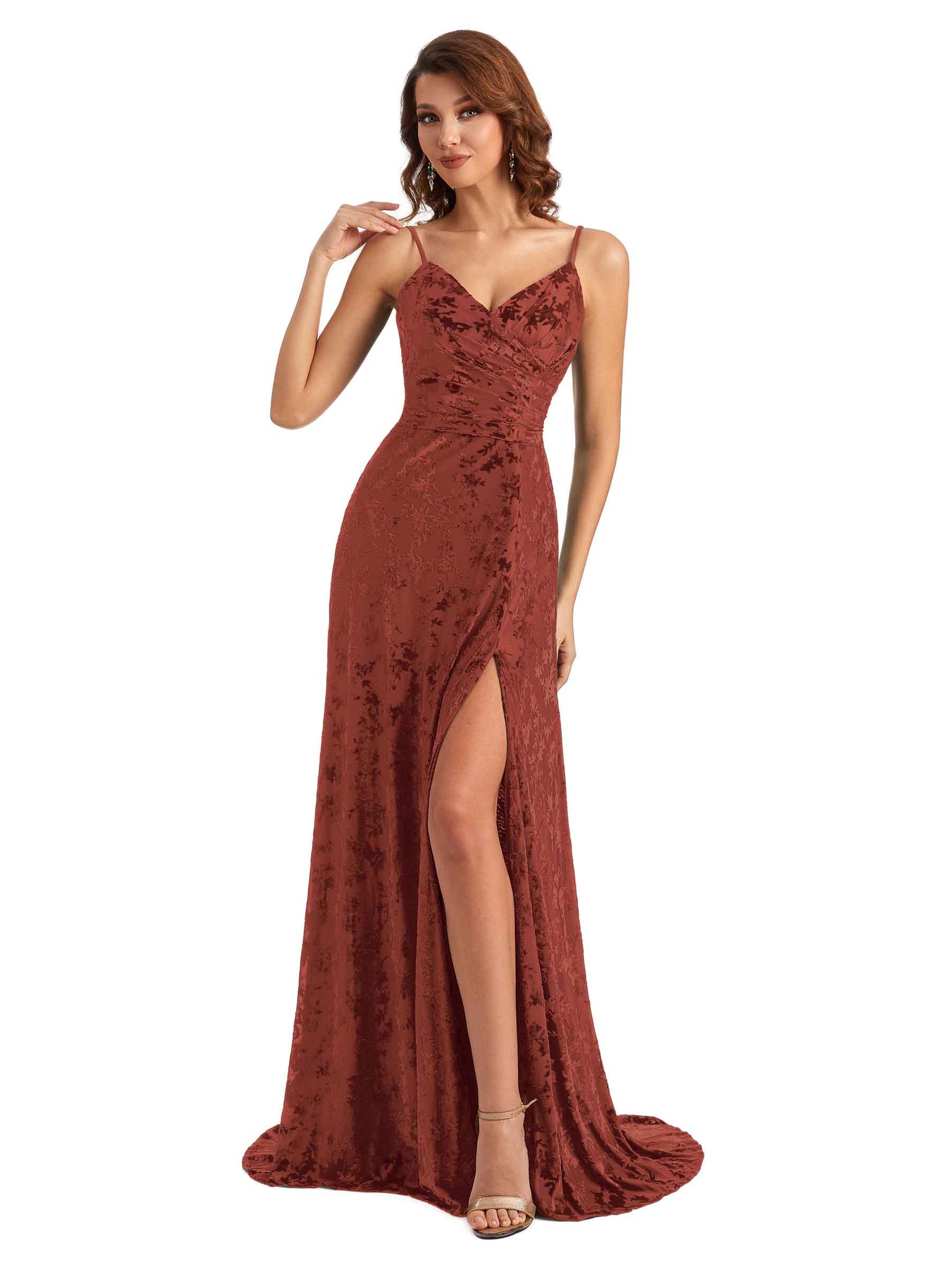 Sexy Side Slit Spaghetti Straps Mermaid Lace Velvet Long Bridesmaid Dresses Online- ChicSew – ChicSew