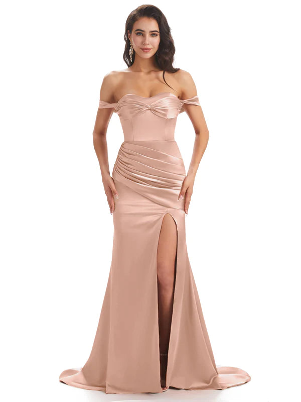 Sexy Side Slit Unique Off Shoulder Mermaid Soft Satin Floor-Length Bridesmaid Dresses In Stock